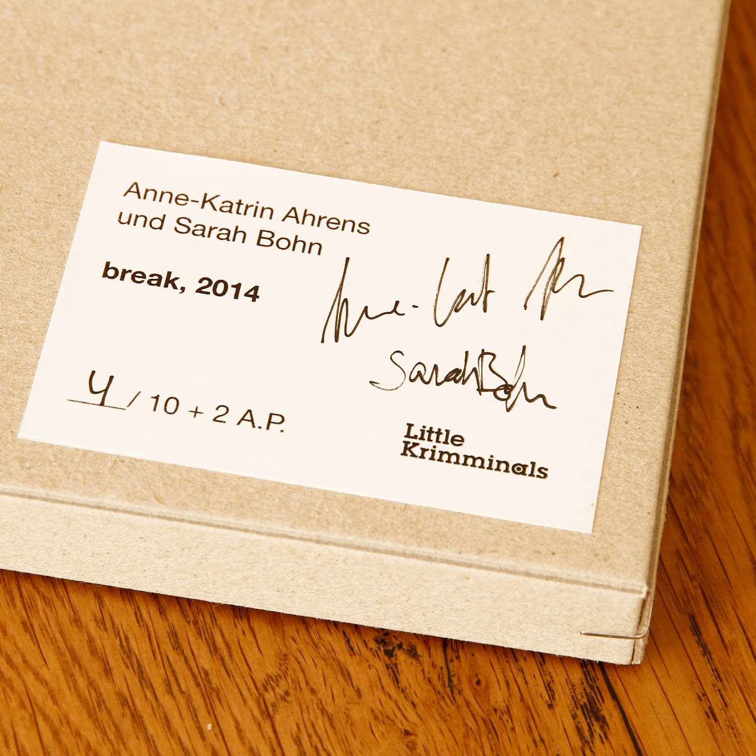 Anne-Katrin Ahrens & Sarah Bohn Venus and Serena 'break', 2014 Material Wandobjekt, Aluminium pulverbeschichtet Production Method In einer Box, die auf der Vorderseite signiert und nummeriert ist. Jeder hat die Freiheit, die Negativräume so zu hängen wie gewünscht. Edition Size 10 Measurement 14 x 14 cm The new and affordable way to buy contemporary art Strictly limited and signed art editions Limited stock From emerging talents to today’s most sought-after artists Easy and free sign-up to shop our weekly deals SIGN UP NOW Already have an account? Über die Edition „Break“ und „deuce“ heißen diese beiden separat erhältlichen Wandobjekte, die die Künstlerinnen Anne-Katrin Ahrens und Sara Bohn 2014 für ihre Präsentation „Venus and Serena“ in der Berliner Ausstellungsreihe „LittleKrimminals“ geschaffen haben. Die Annahme liegt nahe, dass hier eine Begeisterung für Tennis bestimmend war, schließlich geben „break“ und „deuce“ den Punktestand in dieser Sportart wieder und die Namen Venus und Serena verweisen auf die weltberühmten Tennis-Schwestern Williams. Den beiden in Berlin lebenden Künstlerinnen dient der Ballsport jedoch eher als Metapher für ihr gemeinsames Arbeiten, für den Zweiklang ihrer künstlerischen Stimmen. Auseinander- bzw. nebeneinandergelegt ergeben die zarten, weiß lackierten Metallobjekte kein Wort, wie man es eigentlich vermuten würde. Stattdessen werden wir aufgefordert, unseren Blick auf das zu richten, was nicht geschrieben ist: auf den Weißraum zwischen den ‒ zu denkenden ‒ Buchstaben, auf die Leerstellen innerhalb von „break“ und „deuce“. Und so eröffnen uns die Künstlerinnen Raum zum Spielen und Ausprobieren – es gibt kein Richtig oder Falsch in dieser (künstlerischen) Welt! Über die Künstlerinnen Anne-Katrin Ahrens studierte Grafik und Typografie an der HFBK in Hamburg, Sarah Bohn Fotografie am LCF, University of the Arts, in London. Gemeinsam mit Lisa Herfeldt gründeten sie den Studio- und Ausstellungsraum Institut in Berlin und arbeiten seit 2008 künstlerisch in Solo- wie auch Gruppenprojekten zusammen. Links of Interest (Selection) Website von Anne-Katrin Ahrens Website von Sarah Bohn Discover More Art Dorothy Iannone Doesn’t Everyone Make Mistakes in September?, 2014 Anne-Katrin Ahrens & Sarah Bohn Venus and Serena 'deuce', 2014