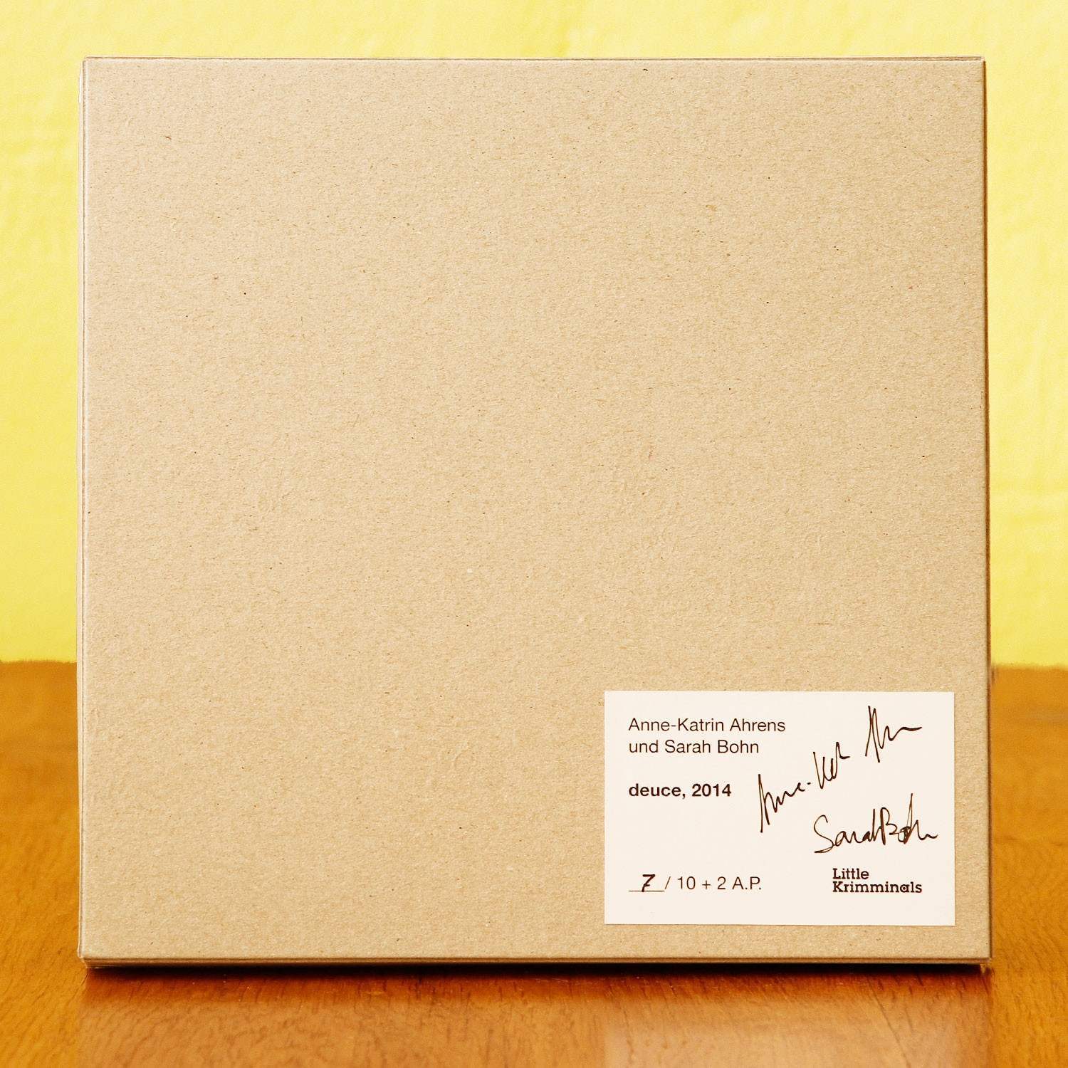Anne-Katrin Ahrens & Sarah Bohn Venus and Serena 'deuce', 2014 Material Wandobjekt, Aluminium pulverbeschichtet Production Method In einer Box, die auf der Vorderseite signiert und nummeriert ist. Jeder hat die Freiheit, die Negativräume so zu hängen wie gewünscht. Edition Size 10 Measurement 14 x 14 cm The new and affordable way to buy contemporary art Strictly limited and signed art editions Limited stock From emerging talents to today’s most sought-after artists Easy and free sign-up to shop our weekly deals SIGN UP NOW Already have an account? Über die Edition „Break“ und „deuce“ heißen diese beiden separat erhältlichen Wandobjekte, die die Künstlerinnen Anne-Katrin Ahrens und Sara Bohn 2014 für ihre Präsentation „Venus and Serena“ in der Berliner Ausstellungsreihe „LittleKrimminals“ geschaffen haben. Die Annahme liegt nahe, dass hier eine Begeisterung für Tennis bestimmend war, schließlich geben „break“ und „deuce“ den Punktestand in dieser Sportart wieder und die Namen Venus und Serena verweisen auf die weltberühmten Tennis-Schwestern Williams. Den beiden in Berlin lebenden Künstlerinnen dient der Ballsport jedoch eher als Metapher für ihr gemeinsames Arbeiten, für den Zweiklang ihrer künstlerischen Stimmen. Auseinander- bzw. nebeneinandergelegt ergeben die zarten, weiß lackierten Metallobjekte kein Wort, wie man es eigentlich vermuten würde. Stattdessen werden wir aufgefordert, unseren Blick auf das zu richten, was nicht geschrieben ist: auf den Weißraum zwischen den ‒ zu denkenden ‒ Buchstaben, auf die Leerstellen innerhalb von „break“ und „deuce“. Und so eröffnen uns die Künstlerinnen Raum zum Spielen und Ausprobieren – es gibt kein Richtig oder Falsch in dieser (künstlerischen) Welt! Über die Künstlerinnen Anne-Katrin Ahrens studierte Grafik und Typografie an der HFBK in Hamburg, Sarah Bohn Fotografie am LCF, University of the Arts, in London. Gemeinsam mit Lisa Herfeldt gründeten sie den Studio- und Ausstellungsraum Institut in Berlin und arbeiten seit 2008 künstlerisch in Solo- wie auch Gruppenprojekten zusammen. Links of Interest (Selection) Website von Anne-Katrin Ahrens Website von Sarah Bohn Discover More Art Dorothy Iannone Doesn’t Everyone Make Mistakes in September?, 2014 Anne-Katrin Ahrens & Sarah Bohn Venus and Serena 'break', 2014