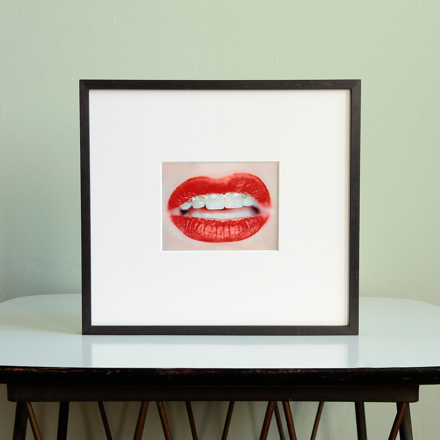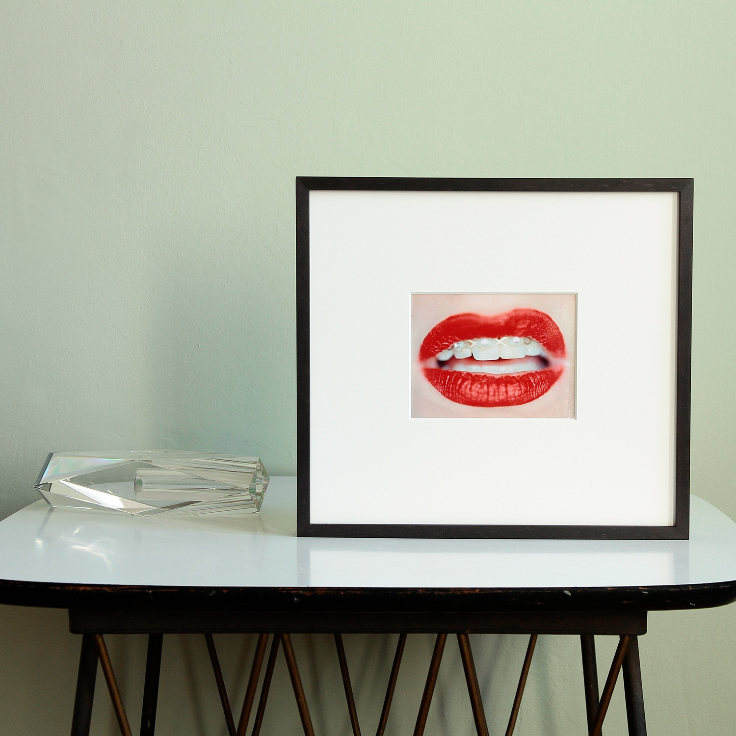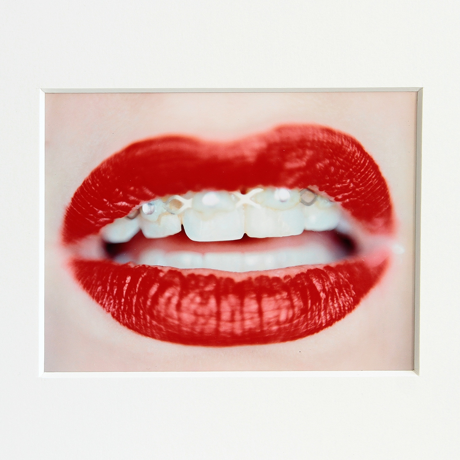 Fast wie funkelnde kleine Brillis – denkt man beim Blick auf die Spange in der Foto-Edition von Antje Engelmann. Das tiefe Rot knallt und die Lippen sind geöffnet, wie ein sinnliches Versprechen. Zurück bleibt indes ein Irritationsmoment. Das löst sich auf, schaut man auf die Entstehungsgeschichte dieser Fotografie. Es ist ein Selbstporträt der Künstlerin, die „Spange“ – so auch der Titel – ist die Folge eines Unfalls, bei dem sich Engelmann die Frontzähne ausgeschlagen und schwere Gesichtsverletzungen zugezogen hatte. „So entstand diese Fotografie als Frage nach Schönheit, im Spannungsfeld von Anziehung und Abstoßung“, schreibt sie dazu, „und als Spiel mit dem roten Mund, dem Zeichen heterosexueller Lust und Sexualität und als Signifikant von Weiblichkeit.“ Das Werk stellt klassische Merkmale weiblicher Schönheit und Erotik implizit infrage, zeigt uns ihre Fragilität, die kurze Distanz zum Schmerz.