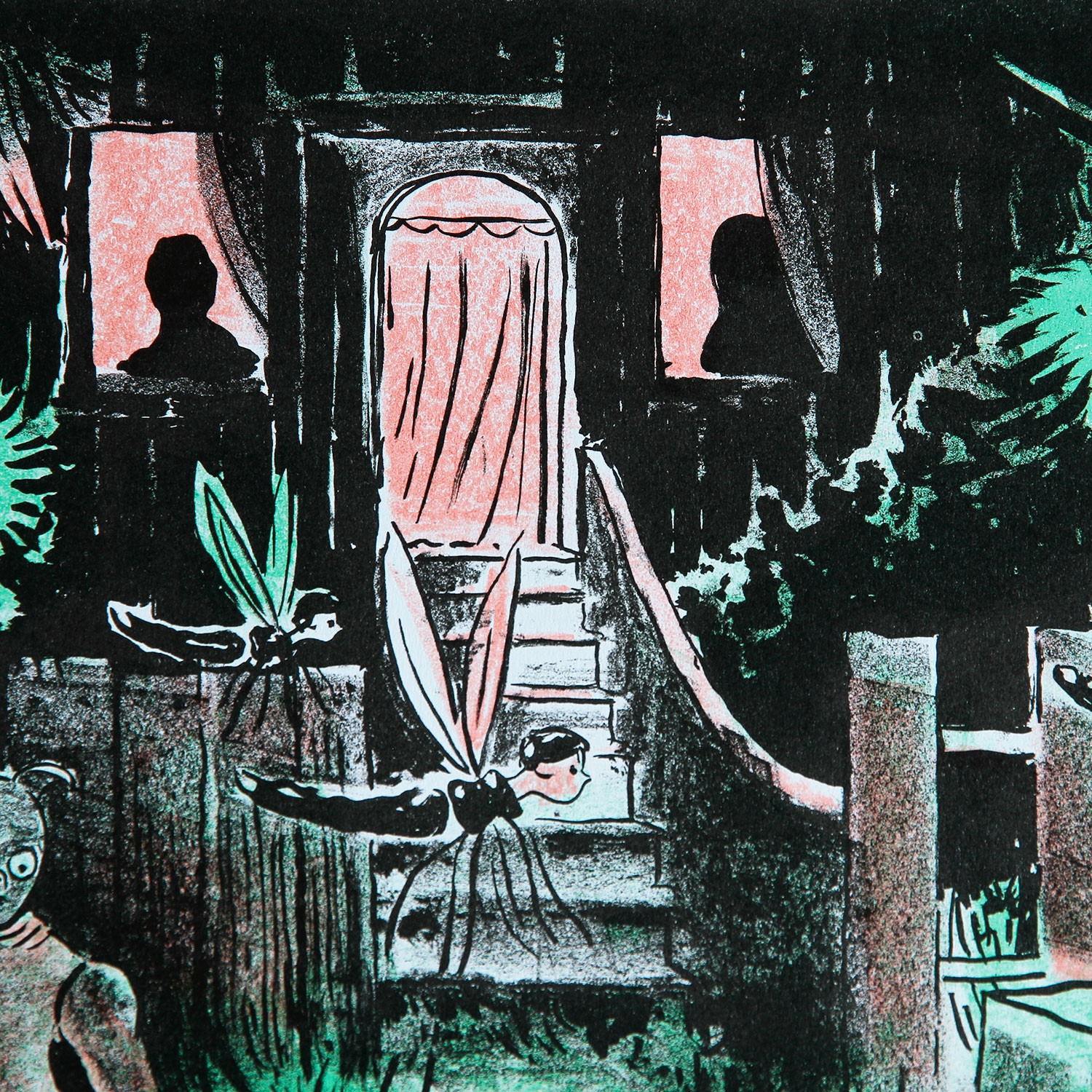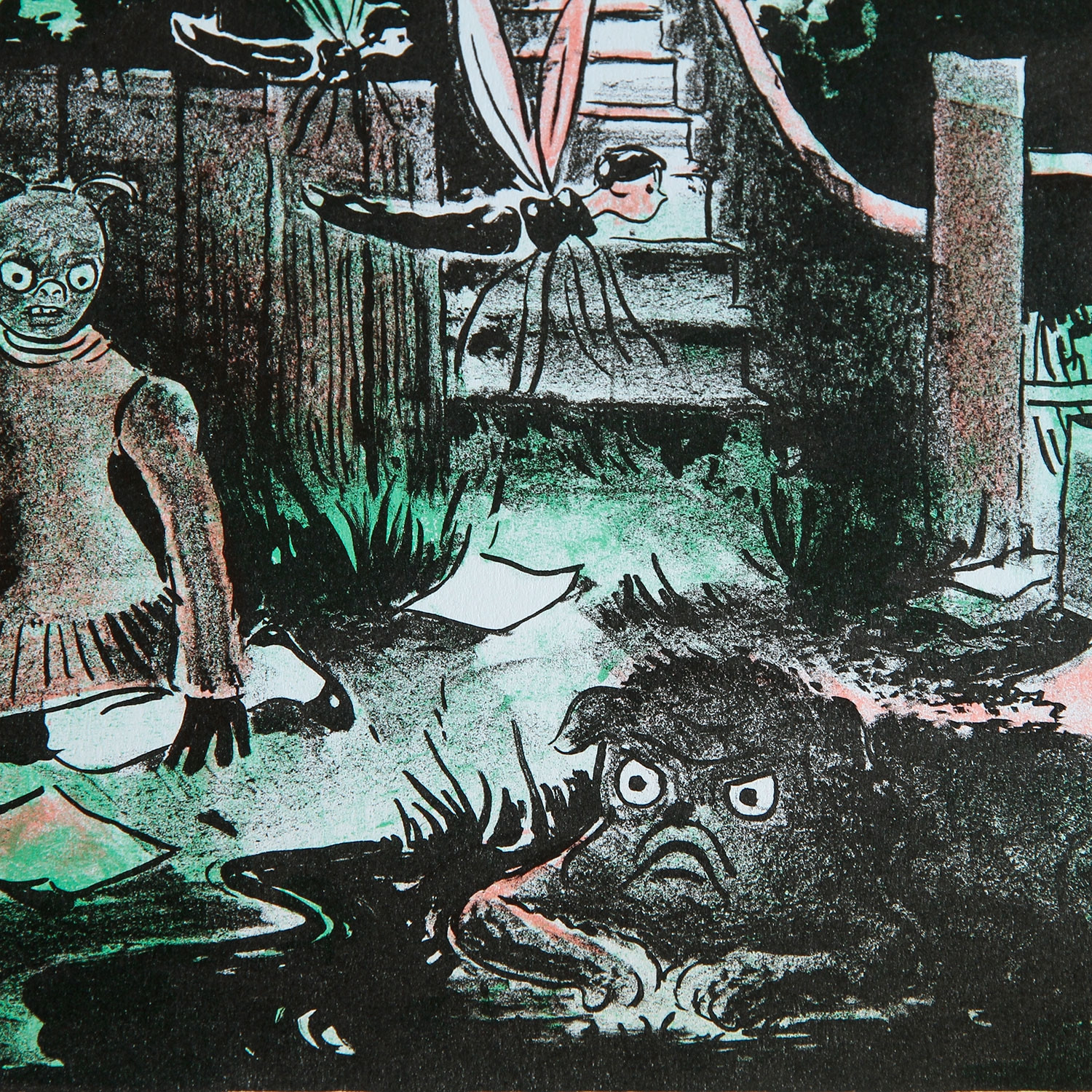 In „Zone“ (2013) lädt uns der Künstler Tilo Baumgärtel auf eine Bühne ein. Ihre Kulisse ist ein verwunschener Garten mit riesigen Libellen, die Menschenköpfe tragen. Auf dem Rasen sitzen ein puppenähnliches Wesen und ein Hund. Wer sich an diesen Gestalten mit grimmigem Gesichtsausdruck vorbeischleicht und über die Treppe in das dahinterliegende Haus eintritt, wird vermutlich eine Verwandlung erfahren. Nur welche?