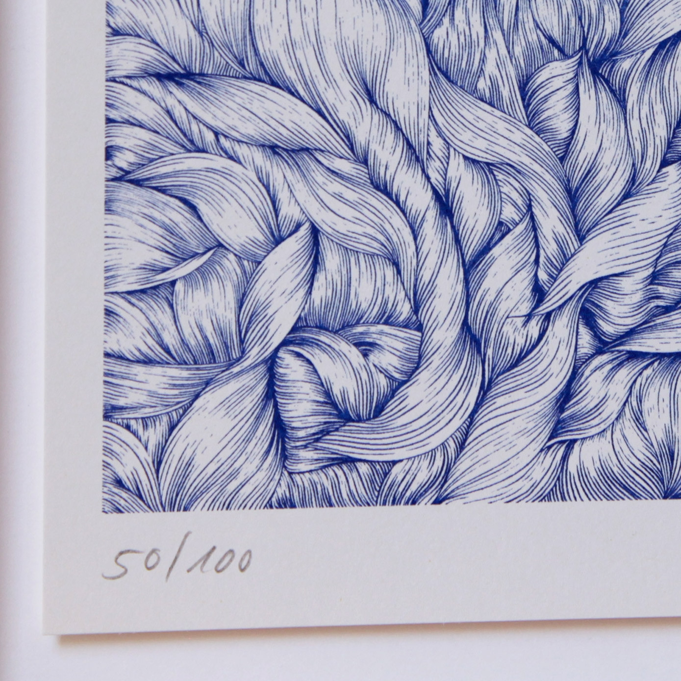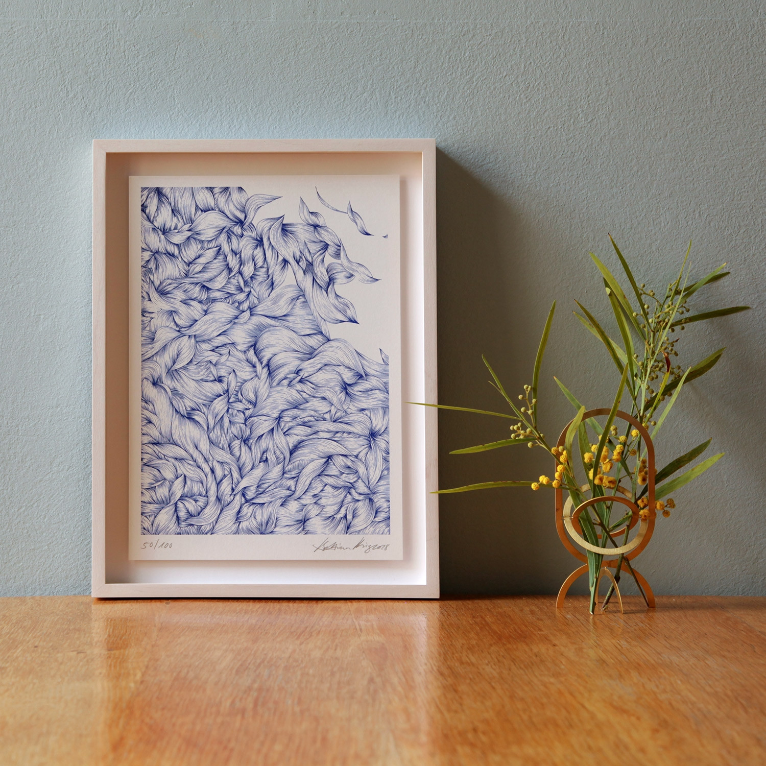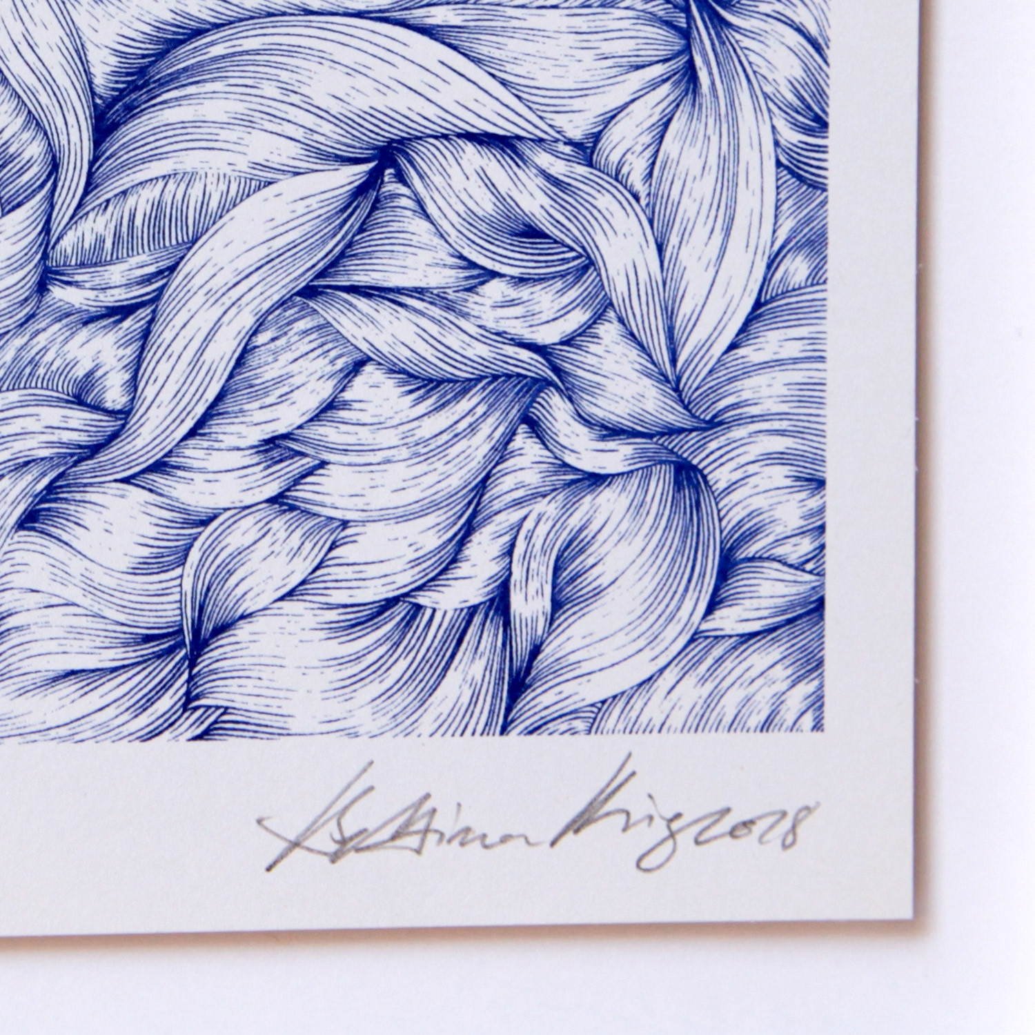 „Heartbeat Extended“ heißt diese kleinformatige limitierte Risografie von Bettina Krieg, und ihr Titel gibt mehr Rätsel auf, als dass er Hinweise bietet. Wir sehen zarte blaue, geschwungene Linien, die sich, dicht gedrängt, zu abstrakten Formen bündeln. Sind es Wellen oder getrocknete Blätter? Zum oberen rechten Bildrand vereinzeln sie sich, leicht und schwebend sind sie hier, als ob eine geheime Kraft sie anzöge, gegen die sie sich nicht wehren können. Versucht man eine einzelne Linie mit dem Auge zu erfassen, scheint das ganze Bild zu vibrieren. Vielleicht die optische Täuschung eines Naturphänomens? Warum nicht? Krieg lässt sich häufig von der Natur anregen und ihre Werke öffnen unseren Assoziationen Freiräume, sich zu entfalten.