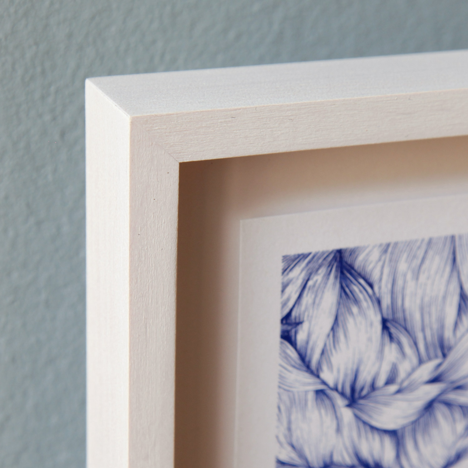Handgefertigter weiß lasierter und gewachster Ahorn-Holzrahmen, mit 8 mm Distanzleiste, Außenmaße ca. 24,9 x 26,2 cm, das Werk ist hochgestellt montiert. Inkl. Normalglas und rückseitiger Aufhängung