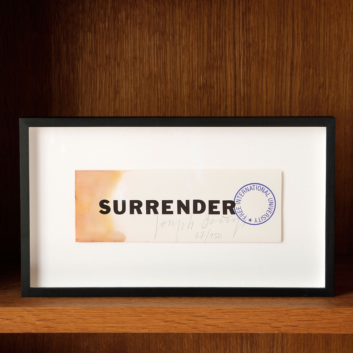 Im Art Institute of Chicago nahmen ihn im Rahmen einer Performance in Anspielung auf seine Rolle als Flieger der deutschen Luftwaffe im Zweiten Weltkrieg Studenten gefangen – und warfen Flugblätter mit der Aufschrift „Surrender“ („Ergib‘ dich“) in die Menge. Noch während der Veranstaltung sammelte Beuys die Flugblätter ein und machte erste Multiples daraus. Drei Jahre später verwendete er die Zettel noch einmal für die „Surrender II“-Edition, versah sie mit einem Stempel seiner „Free International University“ und bearbeitete sie in typischer Beuys-Manier: mit fetthaltiger Schuhcreme.