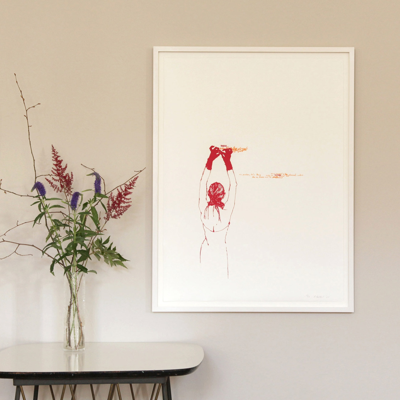 Brigitte Waldach Reform, 2016/2021 Material 2-farbiger Siebdruck auf Zerkall 300 gr Edition Size 25 Measurement ca. 56 x 76 cm auf Vorderseite signiert, datiert und nummeriert Auflage 25 + 5 AP Details about the frame Handgefertigter Ahornholz-Rahmen, 2x weiß gewachst, inkl. 10mm Distanzleiste und Normalglas, Werk ist hochgestellt montiert, Außenmaße des Rahmens ca. 82,2 x 62,4 cm. Inkl. rückseitiger Aufhängung The new and affordable way to buy contemporary art Strictly limited and signed art editions Limited stock From emerging talents to today’s most sought-after artists Easy and free sign-up to shop our weekly deals SIGN UP NOW Already have an account? Über die Edition Über ihren Wunsch, Zeit darstellen zu können und als vierte Dimension in die Kunst zu holen, sprach Brigitte Waldach im vergangenen Jahr mit Roland Nachtigäller, dem Direktor des Museums Marta Herford, das sie 2020 als Förderpreisträgerin mit einer großen Einzelausstellung ehrte. In ihrem Siebdruck „Reform“ visualisiert Waldach Zeit mithilfe von verblasster und stärker sichtbarer Schrift. Die Zeichnung selbst entstand schon im Jahr 2016. Später reagierte die Künstlerin darauf mit einem eigenen „Gedankentext“, wie sie sagt, nach einer längeren Auseinandersetzung mit zwei „Reformern“, dem Komponisten John Cage und dem Choreografen Merce Cunningham. Rot sind die Konturen und rot sind die Handschuhe der Frau – meint die Künstlerin sich selbst? –, die die ebenfalls roten Worte zu platzieren scheint. Rot, die Farbe für Liebe, Wut und Revolution, ist charakteristisch für Waldachs Werk, das auf tiefgreifenden Recherchen fußt und hier auf betörende und assoziative Weise von einem Stück Kulturgeschichte erzählt. Über die Künstlerin „Wenn ich lese, sehe ich Bilder, und wenn ich zeichne, sehe ich Texte. Ich kann keinen Bereich ohne den anderen denken“, so hat Brigitte Waldach ihr künstlerisches Arbeiten einmal erläutert. Sie war Meisterschülerin bei Georg Baselitz an der Hochschule für Künste in Berlin, zuvor studierte sie Germanistik. Die Schrift ist wichtiger Bestandteil ihrer oft großformatigen Zeichnungen und Rauminstallationen, in denen sie Inhalte und Bezüge auch mithilfe sogenannter Verspannungen – meterlanger flexibler Gummibänder – ins Dreidimensionale übersetzt. Nicht alles ist lesbar, vieles überlagert sich, die Bedeutungsebene reicht über den konkreten Inhalt hinaus. Lichtspiele und Wortklänge erweitern die Raum- und Sinneserfahrung. Bei Waldach verdichtet sich Schrift zu Wolken, türmen sich Texte zu Gebirgen auf, werden Kompositionen dreidimensional begehbar. Komplexität wird hier zu einem außergewöhnlichen Kunstereignis. Waldachs Werke sind häufig ortsspezifisch und in Museen, Galerien und auf Messen zu sehen. Ihre Arbeiten befinden sich in zahlreichen öffentlichen Sammlungen, u.a. in der Albertina in Wien, der Fondation Francés bei Paris, der Berlinischen Galerie sowie dem Kupferstichkabinett der Staatlichen Museen zu Berlin, im Museum Kunstpalast in Düsseldorf und dem Kunstmuseum in Stavanger. Latest Exhibitions (Selection) „Im Schein der Sterne“ heißt die aktuelle Gruppenausstellung mit Werken von Brigitte Waldach im Museum Starnberger See (bis 9.1.2022). Den 32-teiligen Zyklus „Die Goldberg-Variationen“, der sich auf die gleichnamige Komposition von Johann Sebastian Bach bezieht, zeigte die Künstlerin zum ersten Mal 2019 in den Berliner Reinbeckhallen. Im selben Jahr präsentierte das Felix-Nussbaum-Haus in Osnabrück Waldach mit der Ausstellung „EXISTENZ – 2019“. Links of Interest (Selection) Webseite von Brigitte Waldach Brigitte Waldach bei Galerie Bjo Bjerggaard, Kopenhagen „ARTE Metropolis“-Videoporträt von Brigitte Waldach Brigitte Waldach und Roland Nachtigäller, Direktor des Museums Marta Herford, im Gespräch über die Ausstellung „Schimmer und Glanz“ (2020) Discover More Art Hanne Darboven Gregorianischer Kalender, 2006 Nadine Wölk Nightswimming IV, 2020 Coco Kühn Vierheit, verletzt, vergoldet, 2023 Janina Roider helio_final_01.psd, 2023, 2023 Katrin Stangl Sumatra, 2008 Rosa Loy Manna, 2011