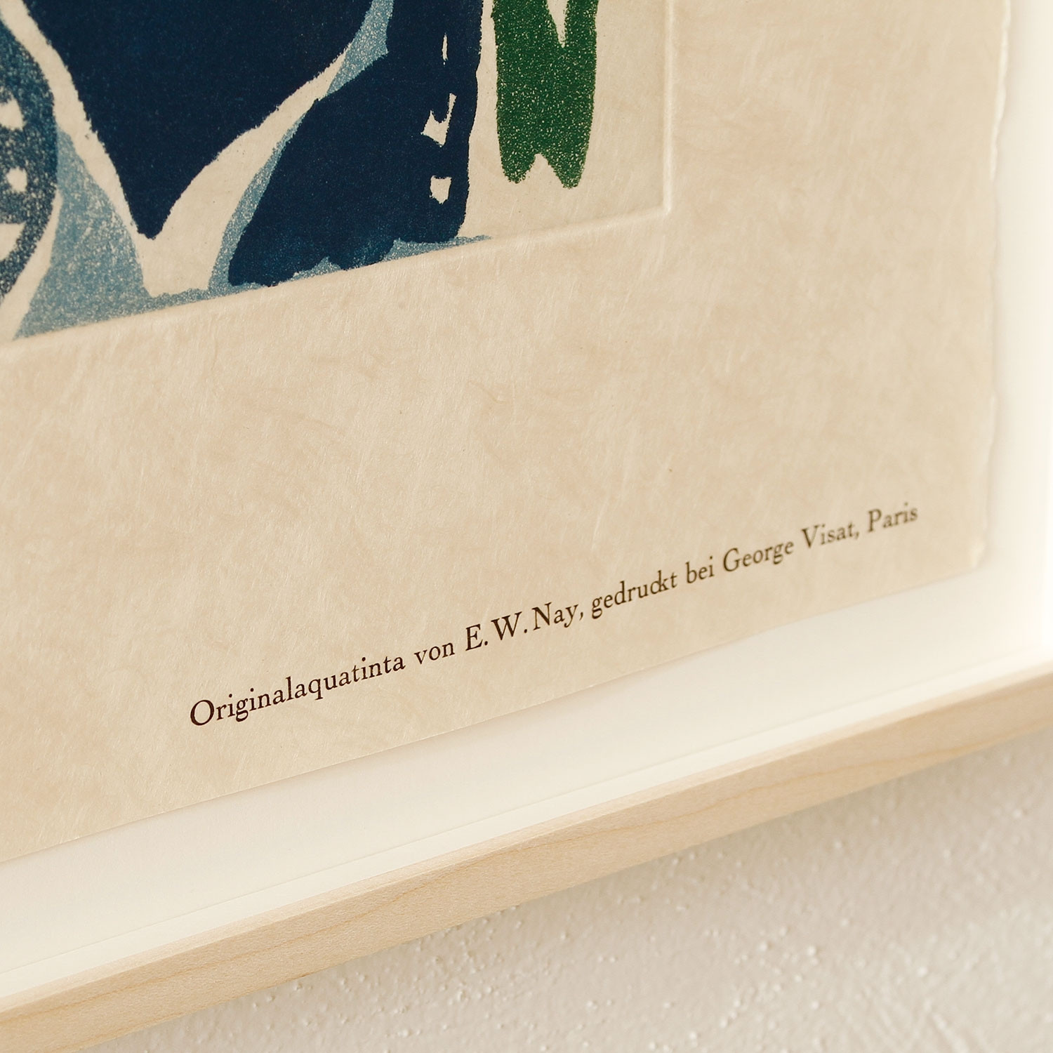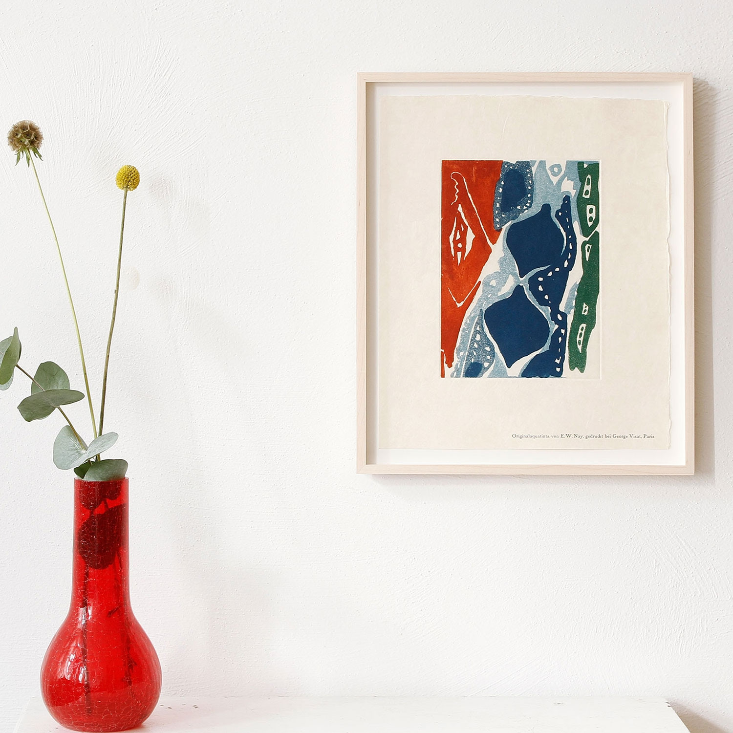 Ernst Wilhelm Nay Farbaquatinta 1965 ‒ 7 Neujahrsgruß, 1965 Material Original-Farbaquatinta, Druck von 3 Platten (Zinnoberrot, Hell-und Dunkelblau, Dunkelgrün), auf chamoisfarbenem Japon nacré Bütten Production Method Verleger: Wolfgang Ketterer, München, Druck: Georges Visat, Paris Werkverzeichnis/Referenz: Gabler, Karlheinz, Ernst Wilhelm Nay. Die Druckgrafik 1923‒1968, Belser, Stuttgart 1975, S. 184‒185, Nr. 81 Edition Size 1428 Measurement 35 x 28,5 Blattgröße Im unteren Blattrand typografisch bedruckt mit „Originalaquatinta von E.W. Nay“, gedruckt bei Georges Visat, Paris. Zusätzlich wurden seinerzeit 100 Exemplare von Nay signiert und nummeriert. Details about the frame Handgefertigter Ahorn-Holzrahmen, mit 10mm Distanzleiste, Außenmaße ca. 33,2 x 39,7 cm. Inkl. rückseitiger Hängeleiste, staubdicht verschlossen. The new and affordable way to buy contemporary art Strictly limited and signed art editions Limited stock From emerging talents to today’s most sought-after artists Easy and free sign-up to shop our weekly deals SIGN UP NOW Already have an account? Über die EditionZinnoberrot, Hell- und Dunkelblau, Dunkelgrün ‒ diese Farben verwendete Ernst Wilhelm Nay in seiner „Farbaquatinta 1965“. 100 signierte Exemplare wurden davon gedruckt, außerdem 1.428 Exemplare als Neujahrsgruß der Galerie von Wolfgang Ketterer in München. Dieses verbliebene Exemplar stammt aus dem Nachlass des renommierten Galeristen und Verlegers. „Farbaquatinta 1965“ ist ein prägnantes Zeugnis der späten Schaffensphase Nays, für den die Malerei stets die „geistige Setzung der Farbe“ war: Nur noch ganz reduziert sind hier die für ihn so typischen „Augen“ zu sehen, während die vertikalen Farbbahnen die Arbeit in Bezug setzen zu seinen letzten Bilder, für die das Gestaltungselement der Vertikale charakteristisch ist. Über den Künstler Ernst Wilhelm Nay, 1902 in Berlin geboren und 1968 in Köln gestorben, gilt als einer der bedeutendsten Maler der deutschen Nachkriegskunst. Er hat neue Maßstäbe gesetzt, sein Werk gehört zum Kunstkanon. Seine Arbeiten finden sich in den namhaftesten Museumssammlungen Europas und der USA. Zu Recht war er davon überzeugt, dass die von ihm geschaffene Kunst seiner Zeit weit voraus war. Den radikalsten Schritt vollzog Nay Anfang der 1950er Jahre mit seinen „Rhythmischen Bildern“. Es sind ganz und gar ungegenständliche Bilder, deren Gestaltwert allein durch die Farbe zum Ausdruck kommt. Latest Exhibitions (Selection) 2018, Ernst Wilhelm Nay, Staatsgalerie Stuttgart, Stuttgart 2017, Ernst Wilhelm Nay, Almine Rech Gallery, London 2017, Ernst Wilhelm Nay. Bilder der 60er Jahre, Michael Werner Kunsthandel, Köln 2015, Ernst Wilhelm Nay. Arbeiten auf Papier, Galerie Michael Werner, Märkisch Wilmersdorf 2015, Ernst Wilhelm Nay. Gouachen und Zeichnungen 1944‒1967, Galerie Fred Jahn, München Links of Interest (Selection) Ernst Wilhelm Nay-Stiftung Biografie Ernst Wilhelm Nays beim Auktionshaus Ketterer, München Ernst Wilhelm Nay bei Galerie Michael Werner, Köln/Märkisch Wilmersdorf Discover More Art Christian Schad Varietéprobe, 1925