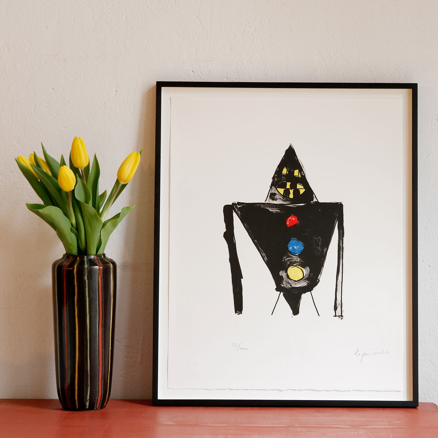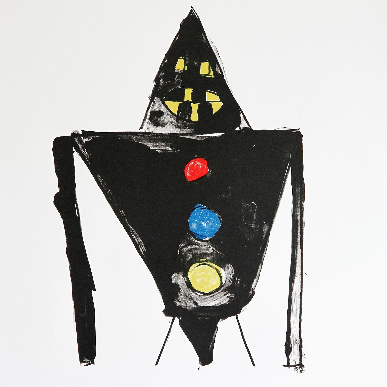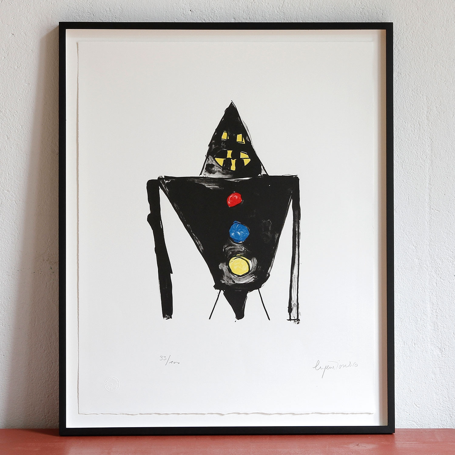 Eugène Ionesco The black Knight, 1984 Material Lithograph on Rives Bütten Production Method signed and numbered Edition Size 100 Measurement 19.69 in x 15.75 in (50 x 40 cm) Details about the frame Handfinished, customized black wooden frame, with spacers and regular glass, size of the frame: 45,4 x 55,7 cm. Ready to hang. The new and affordable way to buy contemporary art Strictly limited and signed art editions Limited stock From emerging talents to today’s most sought-after artists Easy and free sign-up to shop our weekly deals SIGN UP NOW Already have an account? About the edition In 1984, Eugène Ionesco created the piece shown here, a limited edition lithograph titled "The dark Knight" which is reminiscent of the spontaneous works of the “art brut” movement, the autodidactic and alternative artform whose naming can be traced back to Jean Dubuffet. A black knight stands before a white background and looks right at us — a fantastical character composed of two black triangles that looks as if drawn by a child. The funny grimace looks spooky in a harmless and infantile way and simultaneously offers insight into the idiosyncratic inner world of the artistic genius Ionesco. About the artist Without Eugène Ionesco (1909–1994), there never would have been a “Theatre of the Absurd”. The Romanian-born author, who subsequently lived in Paris, is considered among the most important representatives of this particular genre of theatre, which aims at exploring the senselessness and banality of life, the disorientation of man, as well as questions pertaining to our existence. “Rhinoceros” from 1959 counts among Ionesco’s best-known works. Latest Exhibitions (Selection) Essays: 1960, Die Stühle. Eine tragische Farce, Theaterverlag Desch 1864, Die Nashörner. Erzählungen. Erinnerungen. Gedanken über das Theater, S. Fischer Verlag 1974, Der Einzelgänger. Roman, Carl Hanser Verlag 1989, Die Unterrichtsstunde, Reclam Verlag Links of Interest (Selection) Webseite of the artist Interview in der Huffington Post, 2013 Discover More Art Jamel Shabazz Street Photographers of Times Square, 1982