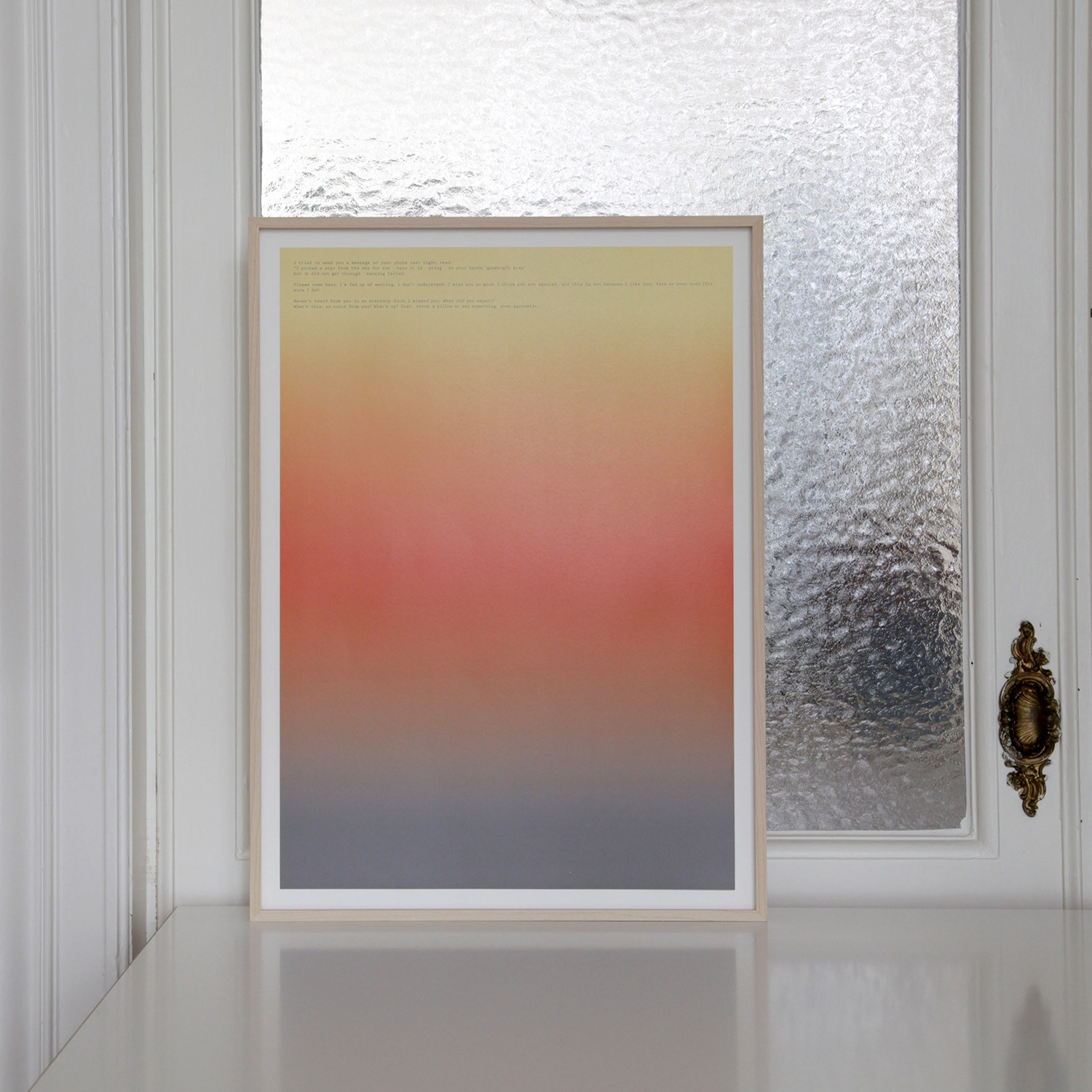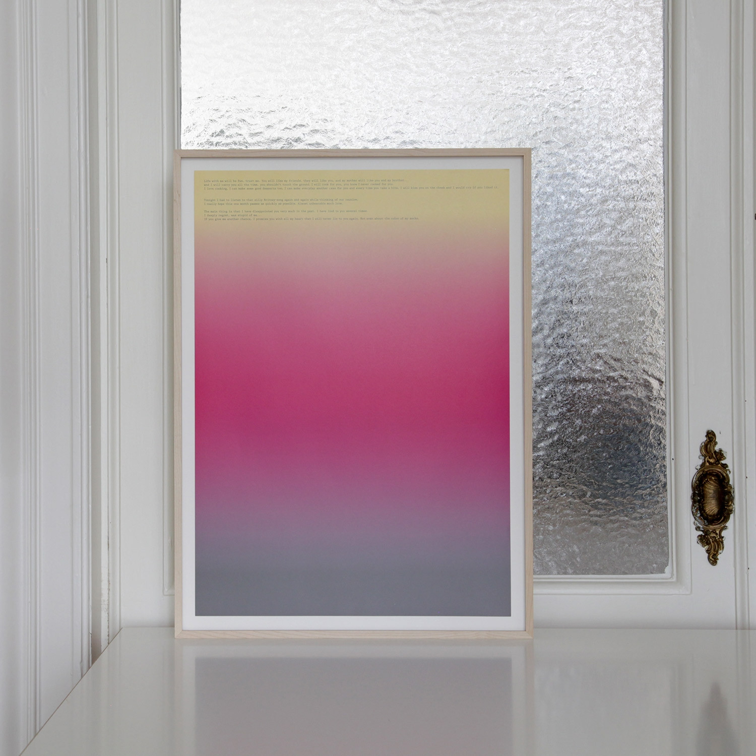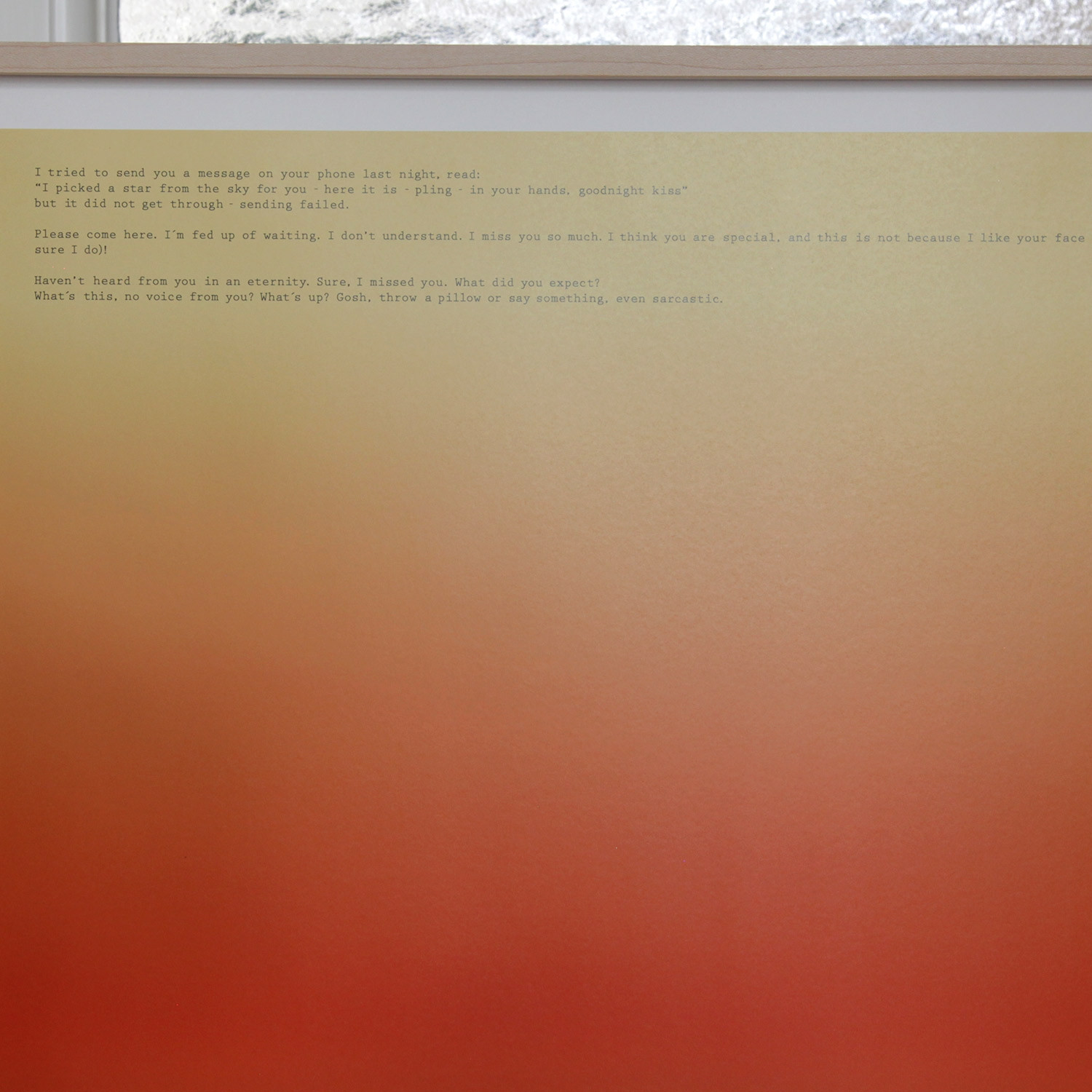 Flaka Haliti I Miss You, I Miss You, ‘Till I Don’t Miss You Anymore, 2014 Material Offset-Druck auf Munken G-Print, 250g/m2 Edition Size 150 Measurement 59,4 x 42 cm, Serie aus drei Offset-Drucken auf Munken G-Print, 250g/m2, Auflage 150 + 20 AP, rückseitig signiert und nummeriert Details about the frame 3 handgefertigte Ahorn-Holzrahmen, inkl. 10mm Distanzleiste, Außenmaß je 64,6 x 47,2 cm, das Blatt wird hängend montiert, inkl. Normalglas, luftdicht verschlossen, inkl. rückseitiger Aufhängung The new and affordable way to buy contemporary art Strictly limited and signed art editions Limited stock From emerging talents to today’s most sought-after artists Easy and free sign-up to shop our weekly deals SIGN UP NOW Already have an account? Über die Edition Rot für Leidenschaft, Grau für Distanz – schon das Farbspektrum in der Edition „I Miss You, I Miss You, ’Till I Don’t Miss You Anymore‟ (2014) von Flaka Haliti zeigt, auf welcher emotionalen Gefühlsskala wir uns gerade befinden. Die Texte machen dies noch einmal auf direktere Art und Weise anschaulich: Es sind per E-Mail verschickte Liebesbotschaften von Paaren in einer Fernbeziehung zwischen großer und verzweifelter Sehnsucht, sie markieren Anfang und Ende der Verbundenheit. Die Dreierserie verweist auf eine Videoinstallation der Künstlerin, in der die Mailausschnitte auf der Benutzeroberfläche von Google Translate zu sehen waren und von einem Computer vorgetragen wurden. Taumel oder Kummer? Die Höhen und Tiefen verlieren sich hier in der monochromen Stimme, in dieser Brechung flackert auch der zarte Humor Halitis auf. Und deutlich wird: Die persönlichen Liebes- und Leidensgeschichten sind verallgemeinerbar – man findet sich wieder, die Last verteilt sich und wird so ganz nebenbei ihrer Wucht beraubt. Über die Künstlerin Mit Stierhoden, eingewickelt in Cellophan, wurde die Künstlerin Flaka Haliti in ihrer Heimat Kosovo schlagartig bekannt. Sie platzierte sie auf der Treppe der Nationalgalerie in Priština als Reaktion auf abschätzige Kommentare von Kollegen, dass Künstlerinnen angeblich „keine Eier“ hätten. Jahre später vertrat Haliti den Kosovo dann auf der Biennale in Venedig. Gesellschaftlichen Strukturen und Machtverhältnissen geht sie in ihrem konzeptuellen Werk in Form von Mixed Media, skulpturalen Arbeiten und Rauminstallationen bis heute nach, etwa wenn sie Ausstellungsräume mit Betonpfeilern verstellt, die an das UNO-Gebäude in Priština oder an die Absicherung der Festung Europa durch die Agentur Frontex erinnern. Gleichzeitig sind ihre Arbeiten reich an Poesie – und Humor. Dies zeigen Beispiele wie ein mit „Just Hanging Around“ betitelter Vorhang mit Farbtönen, die an einen Sonnenuntergang erinnern oder die über Schäfchenwolkenformationen gelegten Gesichter aus ihrer Serie „I See a Face. Do You See a Face“. Haliti lebt heute in München. Werke von ihr sind u.a. in der Sammlung zeitgenössischer Kunst der Bundesrepublik Deutschland, im Lenbachhaus München und in der Kunstsammlung der Erste Group und ERSTE Stiftung in Wien vertreten. Latest Exhibitions (Selection) „Watchu Expect Me To Do When I Lose My Cool“ – so lautete der Titel der ersten Einzelausstellung von Flaka Haliti in der Galerie Deborah Schamoni, München, im Jahr 2020. Ihre erste institutionelle Einzelausstellung in Deutschland zeigte die Künstlerin 2017 in der Kunsthalle Lingen. 2015 vertrat sie die Republik Kosovo bei der 56. Biennale von Venedig. Links of Interest (Selection) Instagram-Account von Flaka Haliti Künstlerinnenseite bei Deborah Schamoni Galerie, München Rezension von Art Review aus dem Jahr 2014 über Flaka Haliti´s Werkhttps://artreview.com/2014-futuregreats-flaka-haliti/ Discover More Art Julius Hofmann Lurking Teen, 2021 Tal R Rajasthani poppets , 2019 Hanne Darboven Gregorianischer Kalender, 2006