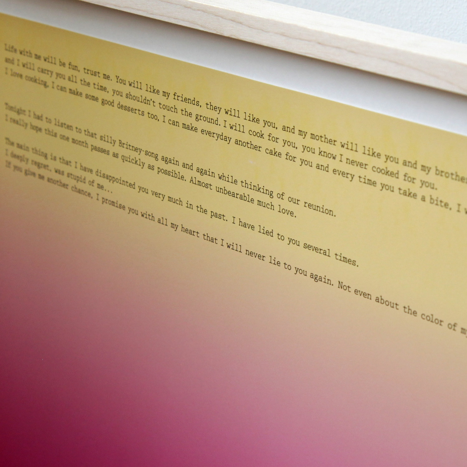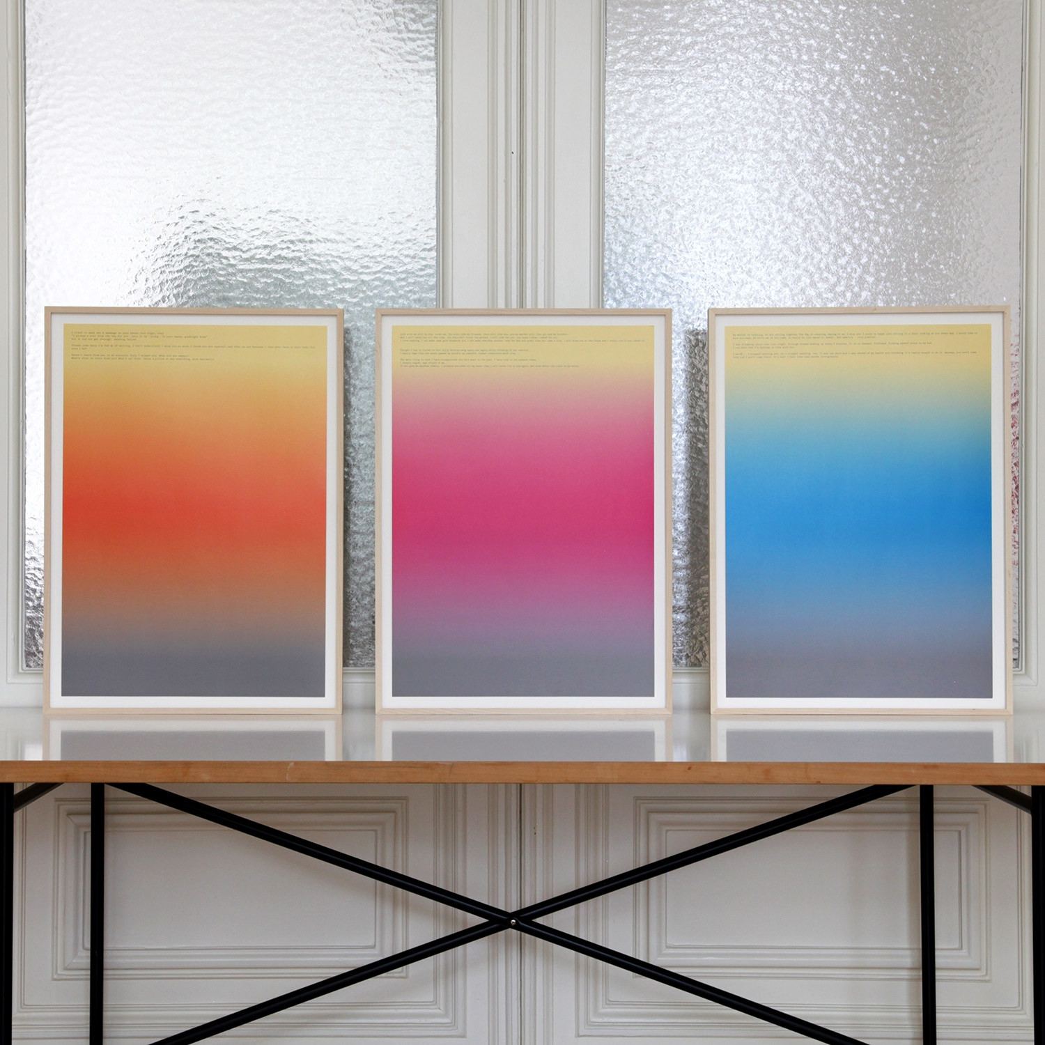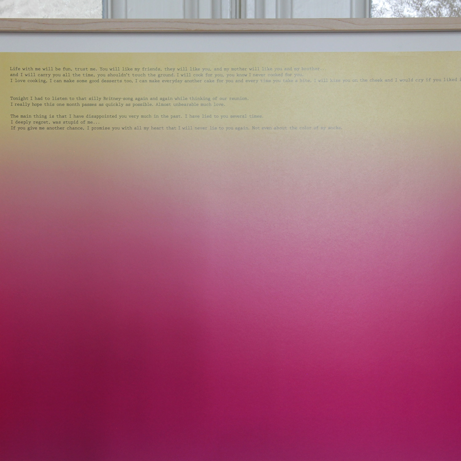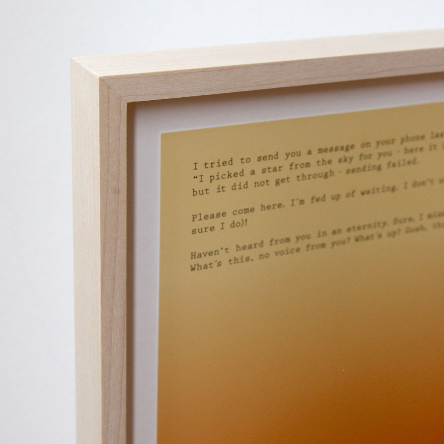 Flaka Haliti I Miss You, I Miss You, ‘Till I Don’t Miss You Anymore, 2014 Material Offset-Druck auf Munken G-Print, 250g/m2 Edition Size 150 Measurement 59,4 x 42 cm, Serie aus drei Offset-Drucken auf Munken G-Print, 250g/m2, Auflage 150 + 20 AP, rückseitig signiert und nummeriert Details about the frame 3 handgefertigte Ahorn-Holzrahmen, inkl. 10mm Distanzleiste, Außenmaß je 64,6 x 47,2 cm, das Blatt wird hängend montiert, inkl. Normalglas, luftdicht verschlossen, inkl. rückseitiger Aufhängung The new and affordable way to buy contemporary art Strictly limited and signed art editions Limited stock From emerging talents to today’s most sought-after artists Easy and free sign-up to shop our weekly deals SIGN UP NOW Already have an account? Über die Edition Rot für Leidenschaft, Grau für Distanz – schon das Farbspektrum in der Edition „I Miss You, I Miss You, ’Till I Don’t Miss You Anymore‟ (2014) von Flaka Haliti zeigt, auf welcher emotionalen Gefühlsskala wir uns gerade befinden. Die Texte machen dies noch einmal auf direktere Art und Weise anschaulich: Es sind per E-Mail verschickte Liebesbotschaften von Paaren in einer Fernbeziehung zwischen großer und verzweifelter Sehnsucht, sie markieren Anfang und Ende der Verbundenheit. Die Dreierserie verweist auf eine Videoinstallation der Künstlerin, in der die Mailausschnitte auf der Benutzeroberfläche von Google Translate zu sehen waren und von einem Computer vorgetragen wurden. Taumel oder Kummer? Die Höhen und Tiefen verlieren sich hier in der monochromen Stimme, in dieser Brechung flackert auch der zarte Humor Halitis auf. Und deutlich wird: Die persönlichen Liebes- und Leidensgeschichten sind verallgemeinerbar – man findet sich wieder, die Last verteilt sich und wird so ganz nebenbei ihrer Wucht beraubt. Über die Künstlerin Mit Stierhoden, eingewickelt in Cellophan, wurde die Künstlerin Flaka Haliti in ihrer Heimat Kosovo schlagartig bekannt. Sie platzierte sie auf der Treppe der Nationalgalerie in Priština als Reaktion auf abschätzige Kommentare von Kollegen, dass Künstlerinnen angeblich „keine Eier“ hätten. Jahre später vertrat Haliti den Kosovo dann auf der Biennale in Venedig. Gesellschaftlichen Strukturen und Machtverhältnissen geht sie in ihrem konzeptuellen Werk in Form von Mixed Media, skulpturalen Arbeiten und Rauminstallationen bis heute nach, etwa wenn sie Ausstellungsräume mit Betonpfeilern verstellt, die an das UNO-Gebäude in Priština oder an die Absicherung der Festung Europa durch die Agentur Frontex erinnern. Gleichzeitig sind ihre Arbeiten reich an Poesie – und Humor. Dies zeigen Beispiele wie ein mit „Just Hanging Around“ betitelter Vorhang mit Farbtönen, die an einen Sonnenuntergang erinnern oder die über Schäfchenwolkenformationen gelegten Gesichter aus ihrer Serie „I See a Face. Do You See a Face“. Haliti lebt heute in München. Werke von ihr sind u.a. in der Sammlung zeitgenössischer Kunst der Bundesrepublik Deutschland, im Lenbachhaus München und in der Kunstsammlung der Erste Group und ERSTE Stiftung in Wien vertreten. Latest Exhibitions (Selection) „Watchu Expect Me To Do When I Lose My Cool“ – so lautete der Titel der ersten Einzelausstellung von Flaka Haliti in der Galerie Deborah Schamoni, München, im Jahr 2020. Ihre erste institutionelle Einzelausstellung in Deutschland zeigte die Künstlerin 2017 in der Kunsthalle Lingen. 2015 vertrat sie die Republik Kosovo bei der 56. Biennale von Venedig. Links of Interest (Selection) Instagram-Account von Flaka Haliti Künstlerinnenseite bei Deborah Schamoni Galerie, München Rezension von Art Review aus dem Jahr 2014 über Flaka Haliti´s Werkhttps://artreview.com/2014-futuregreats-flaka-haliti/ Discover More Art Julius Hofmann Lurking Teen, 2021 Tal R Rajasthani poppets , 2019 Hanne Darboven Gregorianischer Kalender, 2006