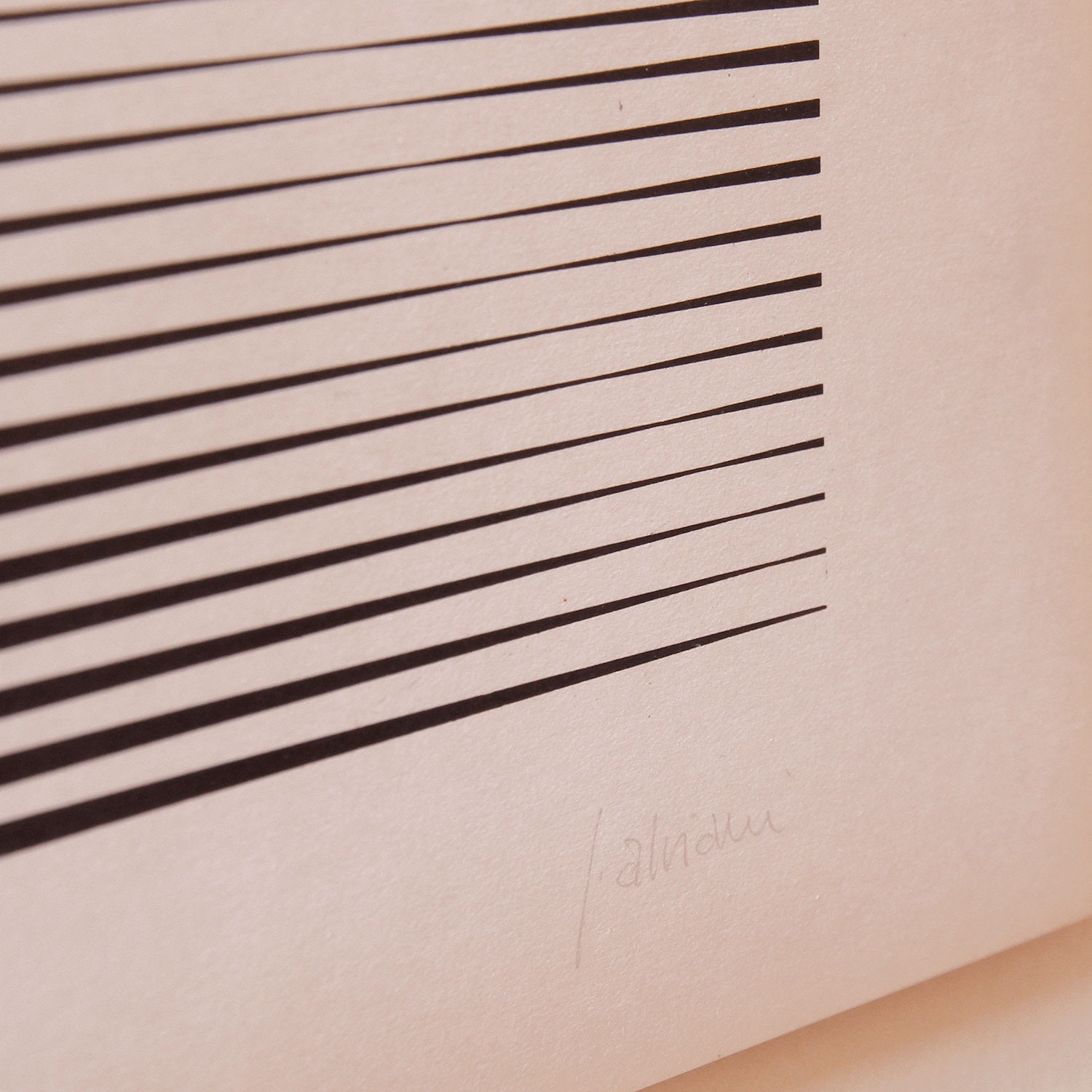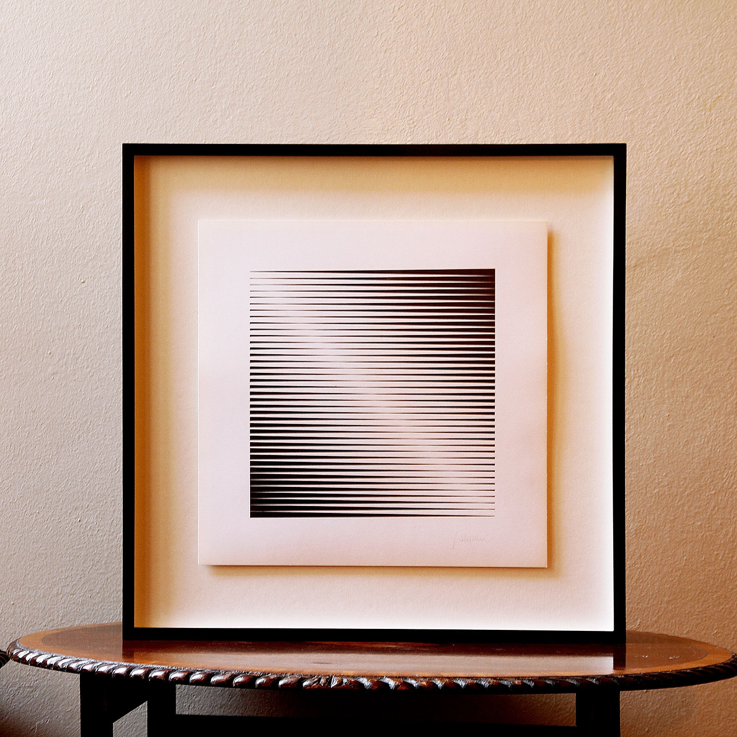 Getulio Alviani Ohne Titel, 1977 Material Siebdruck Production Method geringfügige Alterungsspuren möglich Edition Size 230 Measurement 28 x 28 cm vorderseitig signiert Details about the frame Handgefertigter schwarzer Holzrahmen, mit 10mm Distanzleiste, Außenmaße ca. 40,2 x 40,2 cm. Inkl. rückseitiger Hängeleiste The new and affordable way to buy contemporary art Strictly limited and signed art editions Limited stock From emerging talents to today’s most sought-after artists Easy and free sign-up to shop our weekly deals SIGN UP NOW Already have an account? Über den Künstler und die Edition Getulio Alviani (1939‒2018) war ein italienischer Maler, Objektkünstler sowie Vertreter der Op-Art bzw. der kinetischen Kunst. Er schuf abstrakte Arbeiten sowohl in reduziertem Schwarz-Weiß als auch in einer Vielfarbigkeit, die an durch ein Prisma fallendes Licht gemahnt. In Mailand freundete er sich 1963 mit Lucio Fontana an, außerdem arbeitete er mit Max Bill und Josef Albers zusammen. 1964 wurde er auf die Biennale in Venedig eingeladen, ein Jahr später war er in der wegweisenden Ausstellung „The Responsive Eye“ vertreten, die das New Yorker MoMA zur kinetischen Kunst ausrichtete ‒ sein Durchbruch. Auch in Alvianis 1977 entstandenem Siebdruck spielt Licht eine wichtige Rolle: Die vertikal verlaufenden schwarzen Linien wirken, als würden sie von einem Lichtstrahl durchbrochen – ein typisches Werk der Op-Art! Latest Exhibitions (Selection) 2018, On View, Dellupi Arte, Mailand 2018, Sérigraphies, Galerie Denise René, Paris 2017, Thinking Machines Art and Design in theComputer Age, 1959–1989,The Museum of Modern Art 2017, MAZZOLENI INVITES: DIMOREGALLERY | (UN)COMFORT ZONE, Mazzoleni, London 2017, Summer Group Show, Jerome Zodo Gallery, London 2015, ZERO Italia, Stefan Hildebrandt Gallery, St. Moritz 2009, Cromofobie - Percorsi del Bianco e del Nero nell'Arte Italiana Contemporanea, Museo d'Arte Moderna e Contemporanea Ex Aurum, Pescara, Italien 1966, Recent Acquisitions: Painting and Sculpture, The Museum of Modern Art 1965, The Responsive Eye, The Museum of Modern Art, New York Links of Interest (Selection) Alviani auf artnet Zum Tode des Künstlers im Artforum