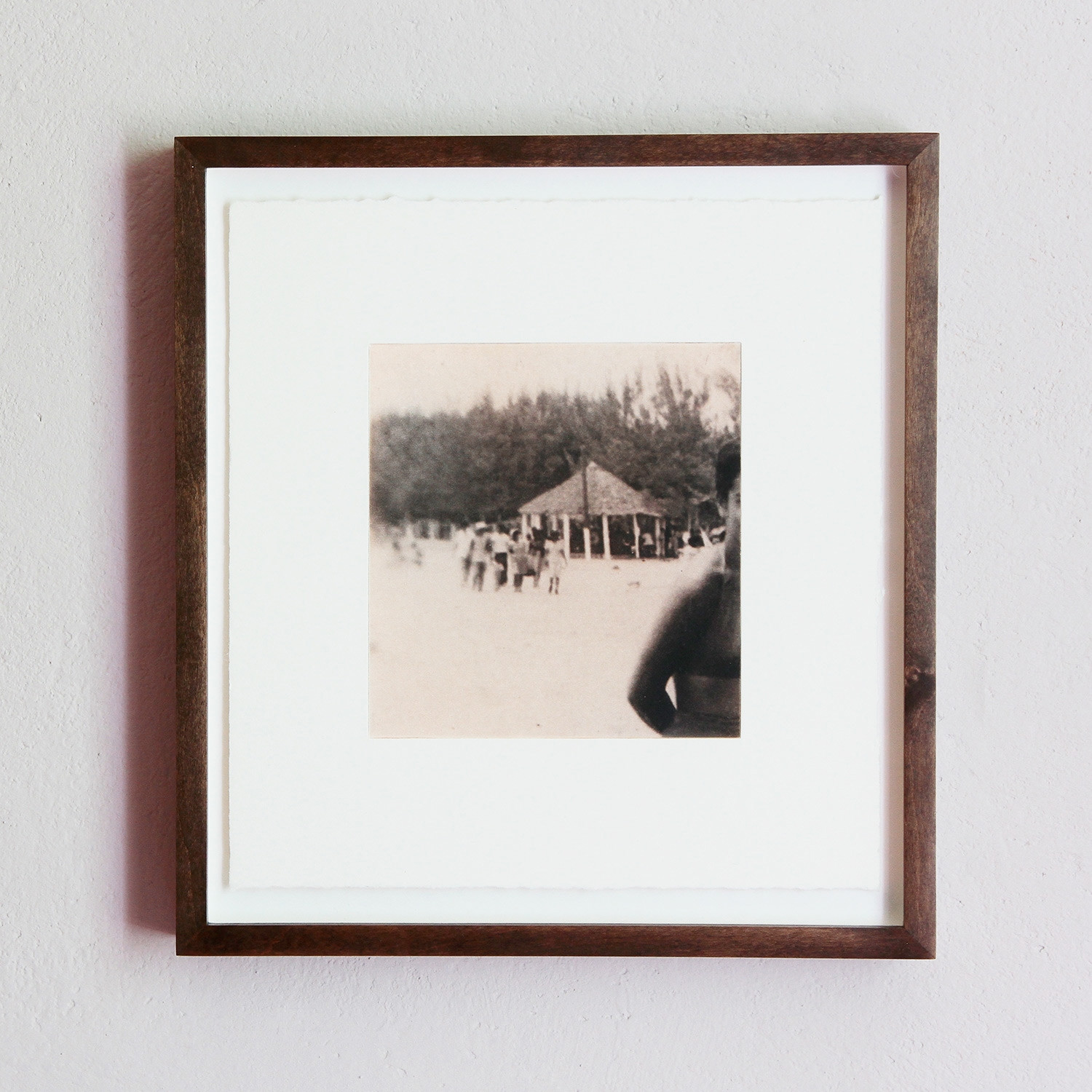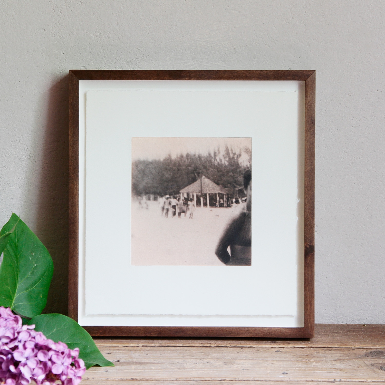 Handgefertigter Nussbaum-Holzrahmen, inkl. 8mm Distanzleiste, Außenmaße ca.27,5 x 25,5 cm, inkl. Museumsglas und rückseitiger Aufhängung, staubdicht verschlossen.