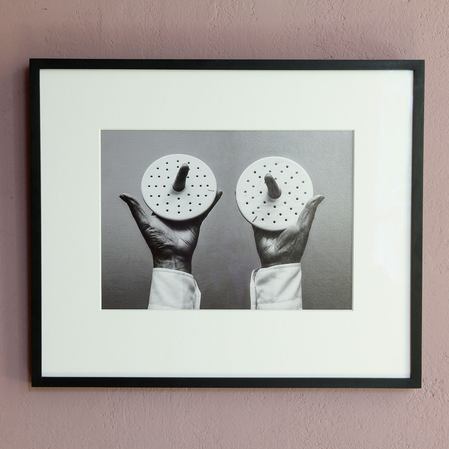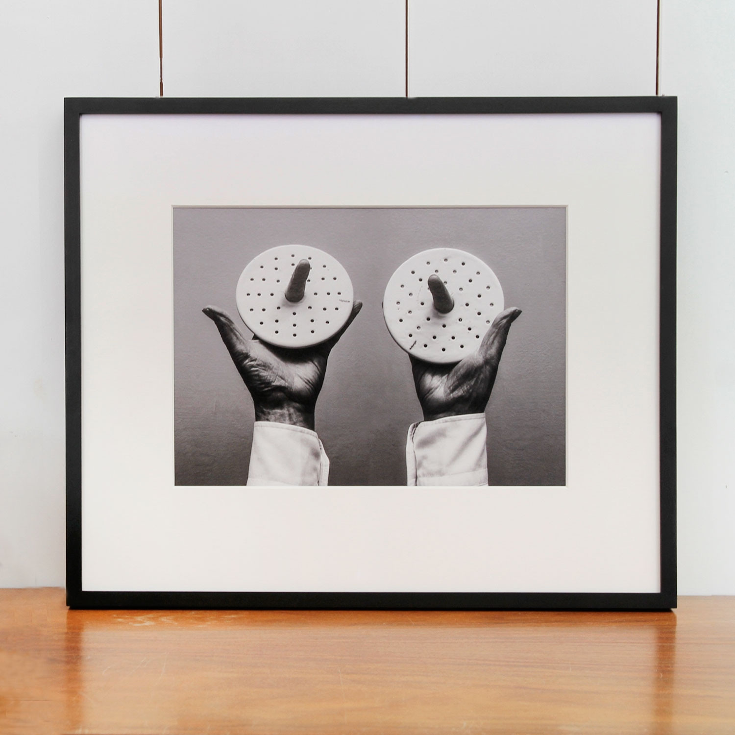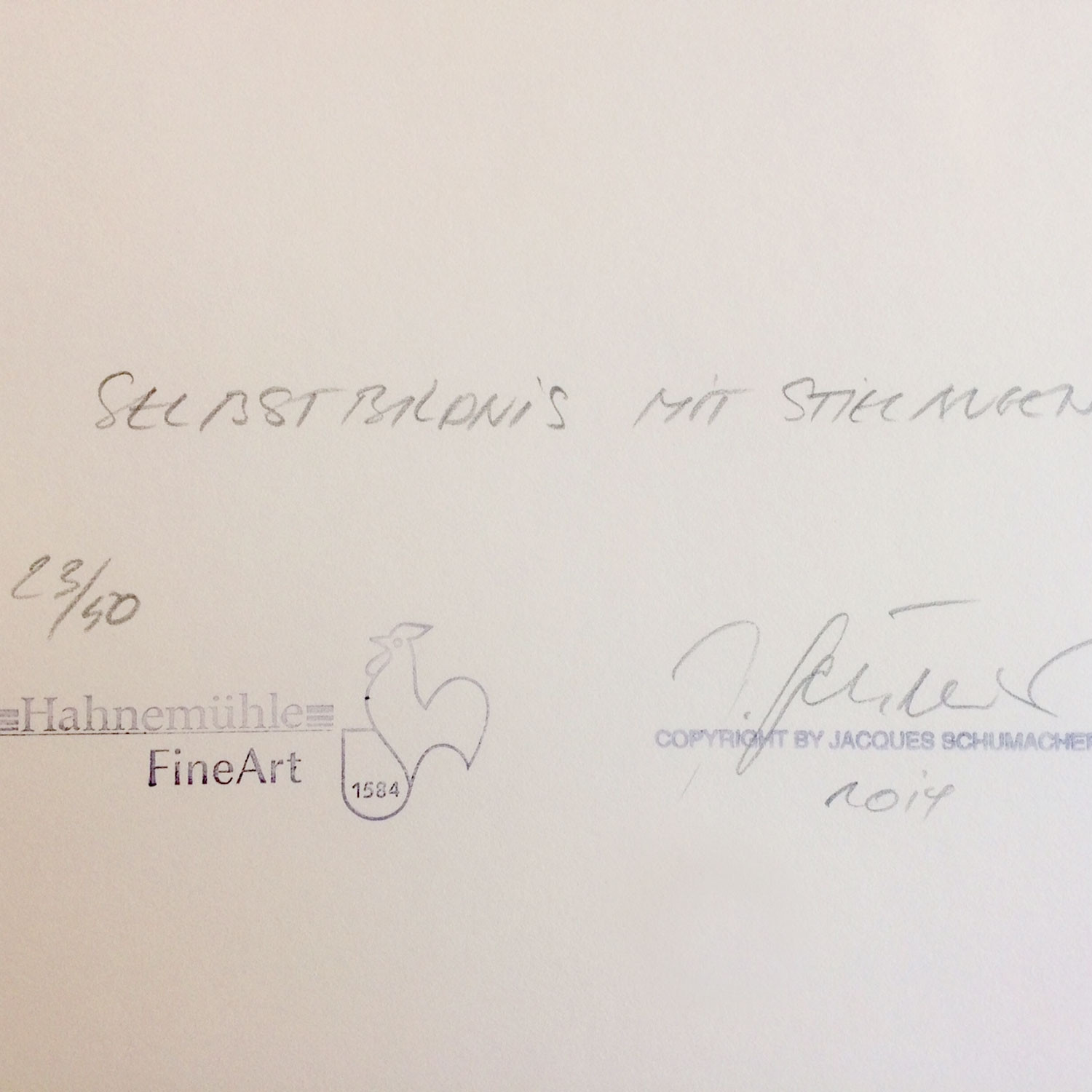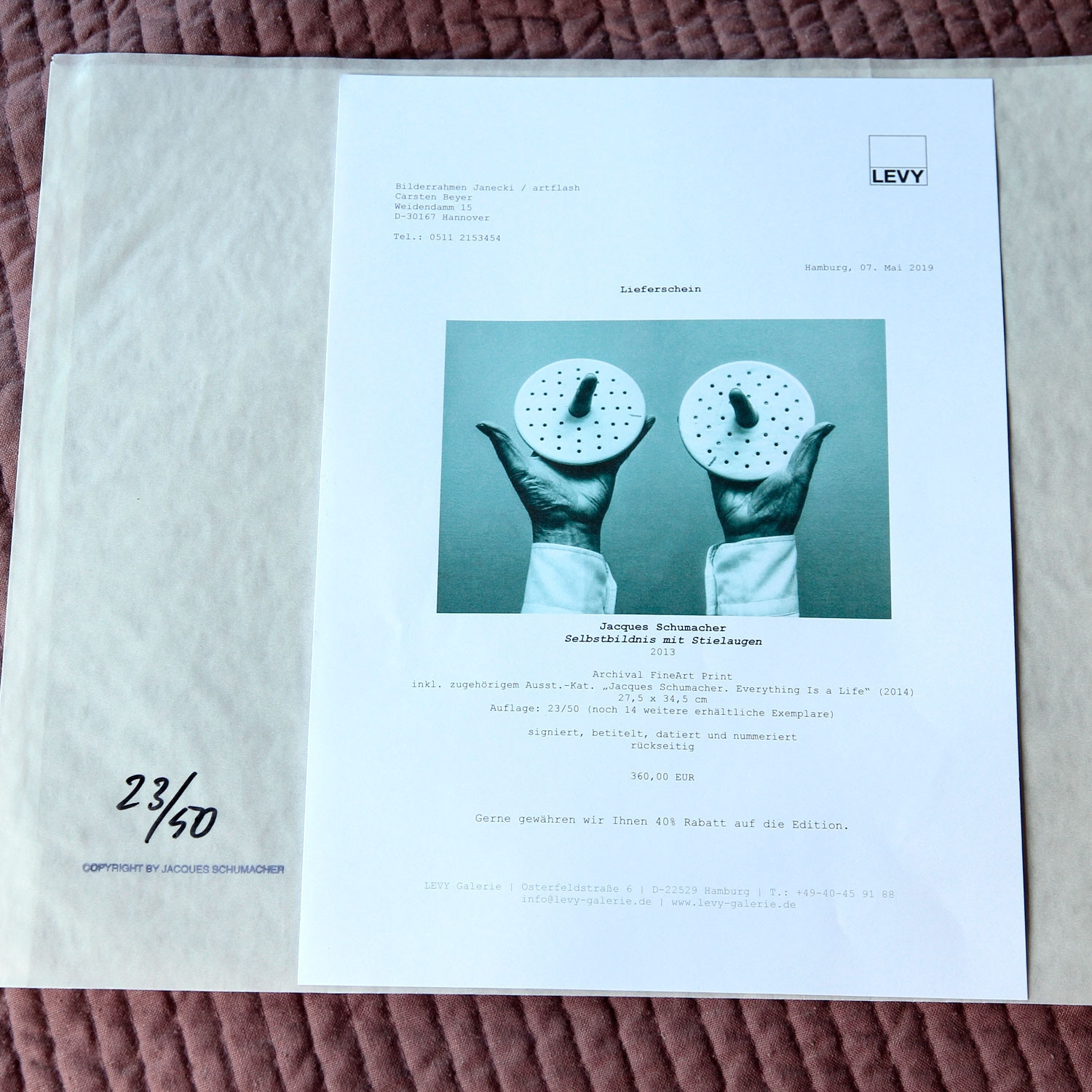 Jacques Schumacher Selbstbildnis mit Stielaugen, 2013 Material Archival Fine Art Print Production Method rückseitig signiert, nummeriert und datiert Edition Size 50 Measurement 27,5 x 34,5 cm Inkl. zugehörigen Ausstellungskatalog „Jacques Schumacher. Every Thing Is A Life“ (2014) Details about the frame Handgefertigter schwarz lackierter Natur-Ahornholzrahmen, inkl. entspiegeltem Museumsglas (Mirogard), Außenmaße ca. 44,6 x 37,3 cm. Inkl. rückseitiger Hängeleiste, staubdicht verschlossen. The new and affordable way to buy contemporary art Strictly limited and signed art editions Limited stock From emerging talents to today’s most sought-after artists Easy and free sign-up to shop our weekly deals SIGN UP NOW Already have an account? Über die Edition Glaubt man dem Titel dieser fotografischen Arbeit, handelt es sich bei ihr um ein Porträt des Künstlers. „Selbstbildnis mit Stielaugen“ (2013) zeigt zwei Hemdärmel, aus denen Hände in die Höhe ragen, die Daumen sind abgespreizt, die Zeigefinger nach vorne, zum Betrachter gerichtet. Sie ragen jeweils aus einer weißen, löchrigen Scheibe heraus. Doch diese Bildbeschreibung fasst das Wesen der Fotografie nicht annähernd: Das Gesicht des Fotografen wird durch Hände und Gestik ersetzt ‒ die Daumen sind die Ohren, die Zeigefinger die langgezogenen Pupillen und die Lochscheiben die riesigen Augen eines unwirklichen Gesichtes. Diese Fotografie ist tatsächlich ein Selbstporträt des Künstlers, aber nicht im offensichtlichen Sinne einer realistischen Darstellung. Vielmehr ist die Bildidee das eigentliche Selbstbildnis. Denn Schumacher ist als Fotograf ein Virtuose der Verfremdung und Neukomposition der Dinge. „Every Thing Is A Life“ bestätigt auch in dieser Edition das Motto seiner Kunst. Über den Künstler Jaques Schumacher hat in der Porträt-, Akt,- Mode- und Lifestyle-Fotografie Karriere gemacht. Als freier Fotograf ist er zeitgenössischer Dadaist, erweckt tote Dinge und rückt sie in ein neues Licht. Seine Bilder überraschen und verwirren, sie sind rätselhaft und humorvoll. Schumacher wurde 1933 in Buitenpost, Holland, geboren. Seit 1963 arbeitet er von Hamburg aus als selbständiger Fotograf. 2001/02 hatte er eine Gastprofessur an der Universität der Künste Berlin inne.„Every Thing Is A Life“, so lautet der Titel von seinem jüngsten Bildband, herausgegeben 2014 beim Kerber Verlag. Discover More Art Jack Pierson YELLOW ROAD, 2018 Michael Sailstorfer P 99, 2016 Walter Dahn Édition Séparée Nr. 8 (Cowboy), 1997