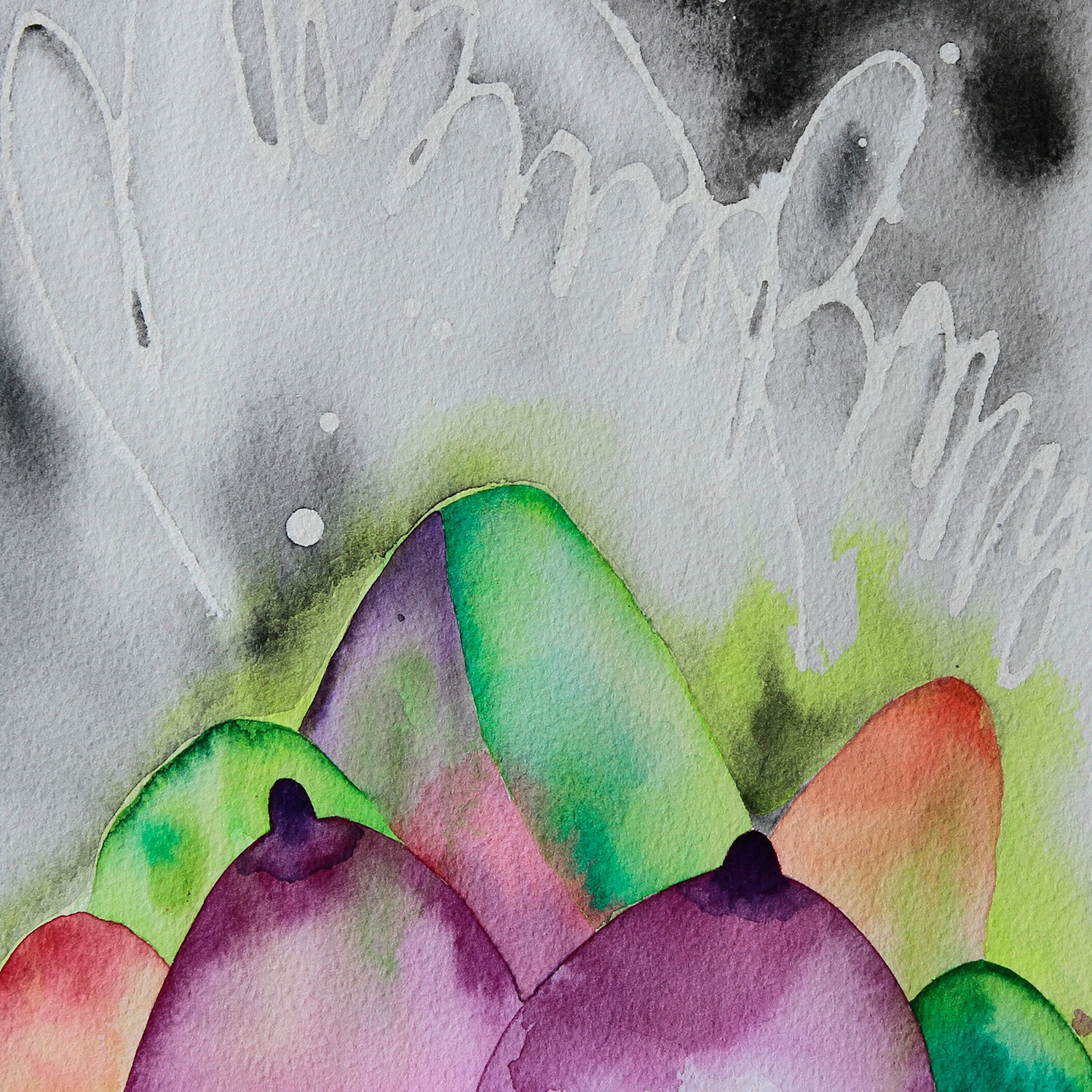 Als „Shadowland (signature edition)“ bezeichnet Jagoda Bednarsky ihre zehn – immer wieder anders kolorierten – Aquarelle, die alle Unikatcharakter besitzen. „Shadowland“ („Schattenland“), so heißt auch eine ganze Werkserie der Berliner Malerin, in der sie sich mit dem Bild der Frau und dem Muttersein auseinandersetzt. Den Titel hat sie einer 1919 in New York erstmalig erschienenen gleichnamigen Kulturzeitschrift entlehnt. Mal zeigt Bednarsky den konkreten Stillmoment ‒ Baby und Brust in Nahaufnahme ‒, mal wird die weibliche Brust zum ‚Schutzschirm‘ in einer Regenszenerie oder, wie in diesen Acrylarbeiten, zum aufragenden Gebirge inmitten einer Hügellandschaft. Die Realität hält Einzug in Bednarskys Werken – der kunstvoll geschwungene Schriftzug ihres Namens am Himmel deutet an, dass es in ihren Arbeiten auch um eigene Erfahrungen geht. Doch das Abstraktionsmoment ist stets stark genug, um assoziative Reflexionsprozesse wie jene über den weiblichen Körper oder tradierte Rollenklischees in Gang zu setzen. Selbstbewusstsein, Eigensinn und Ironie sprechen aus diesen genauso sinnlich-poetischen wie fantastisch-witzigen Werken. Text: Cara Wuchold