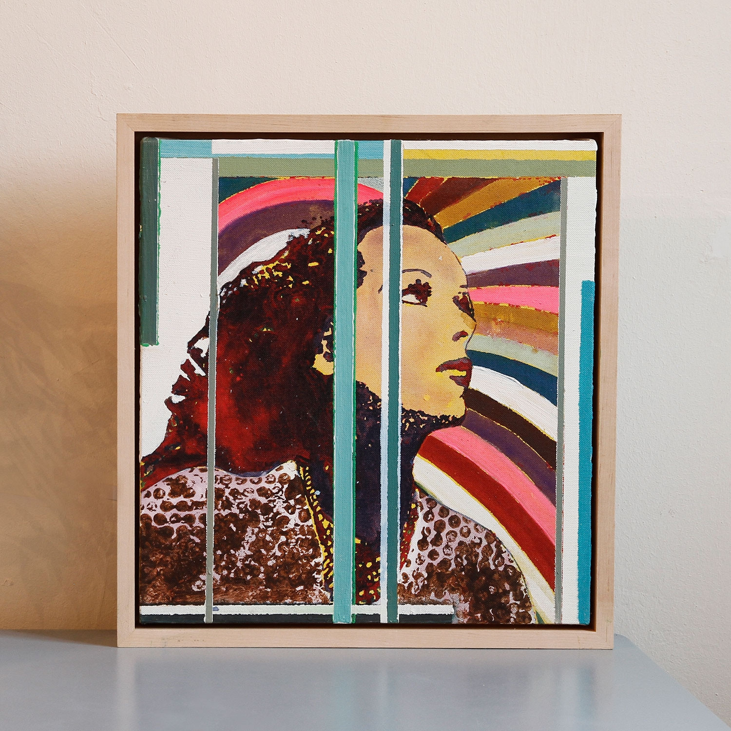 Muches Malerei dieser frühen Zeit zeichnet sich aus durch eine gesteigerte Buntheit, den gleichwertigen Einsatz von Texten und Bildern, eine besondere Art der Figurendarstellung und einen von der Architektur inspirierten Bildaufbau. Dies gilt auch für seine Gemälde „Bleich“, „Oxy“ und „Inhalt“. Sie zeigen jeweils eine Frau, die uns entweder direkt anschaut oder in eine unbestimmte Ferne blickt. Alle drei Darstellungen vermitteln Zuversicht und Selbstbewusstsein. Sind diese Frauen Kämpferinnen und wenn ja, wofür kämpfen sie? Die Farbpalette ist breit angelegt. Farben und Formen strukturieren nicht nur den Hintergrund, sondern greifen auch in die figurative Darstellung ein, durchkreuzen und überschneiden sie. Dieser Bruch mit den Konventionen der Porträtmalerei ist ‚Muche pur’! Darüber hinaus verwendet der Künstler mit dem Wort „Inhalt“ das Medium der Schrift, das sich jedoch einpasst in die malerische Gesamtgestaltung.