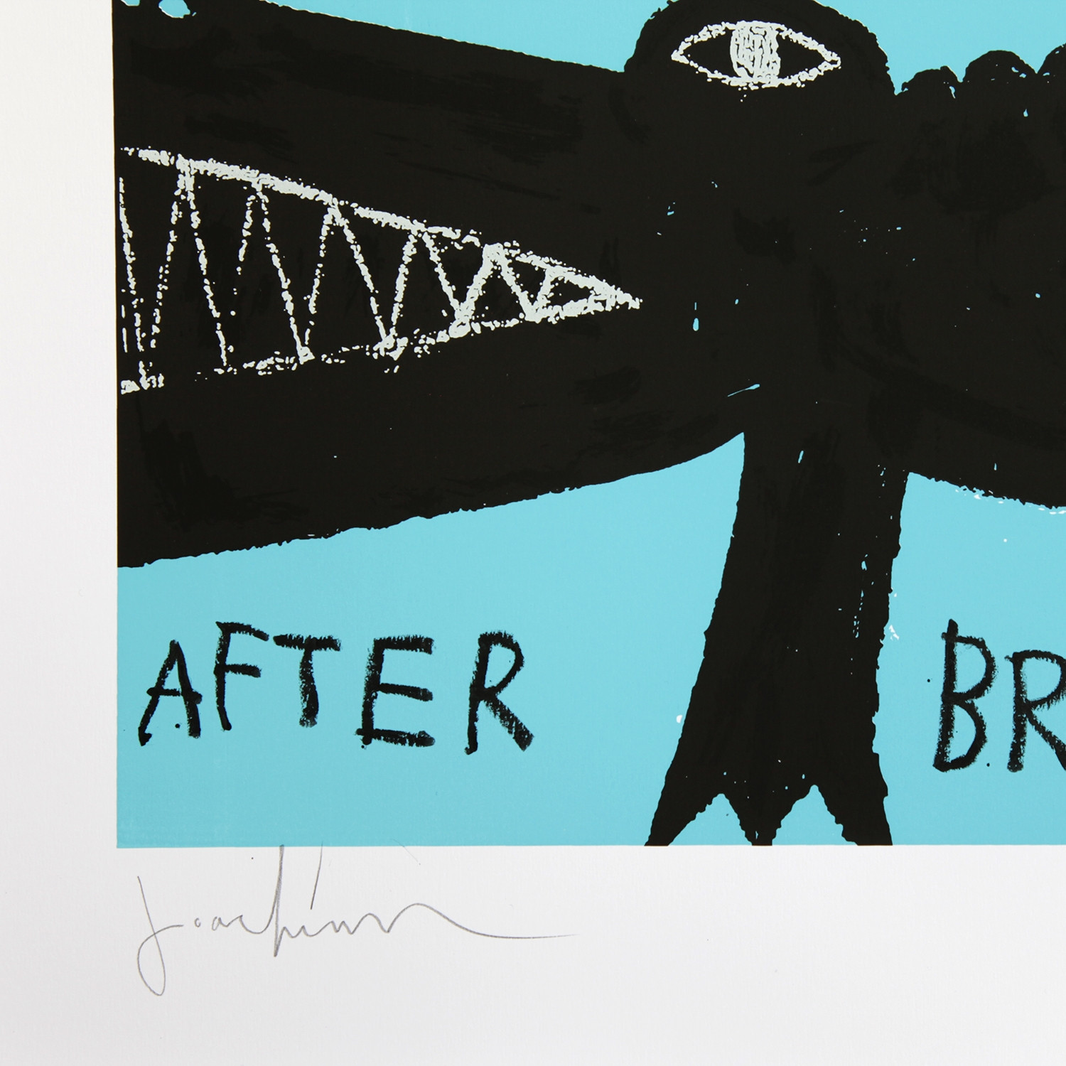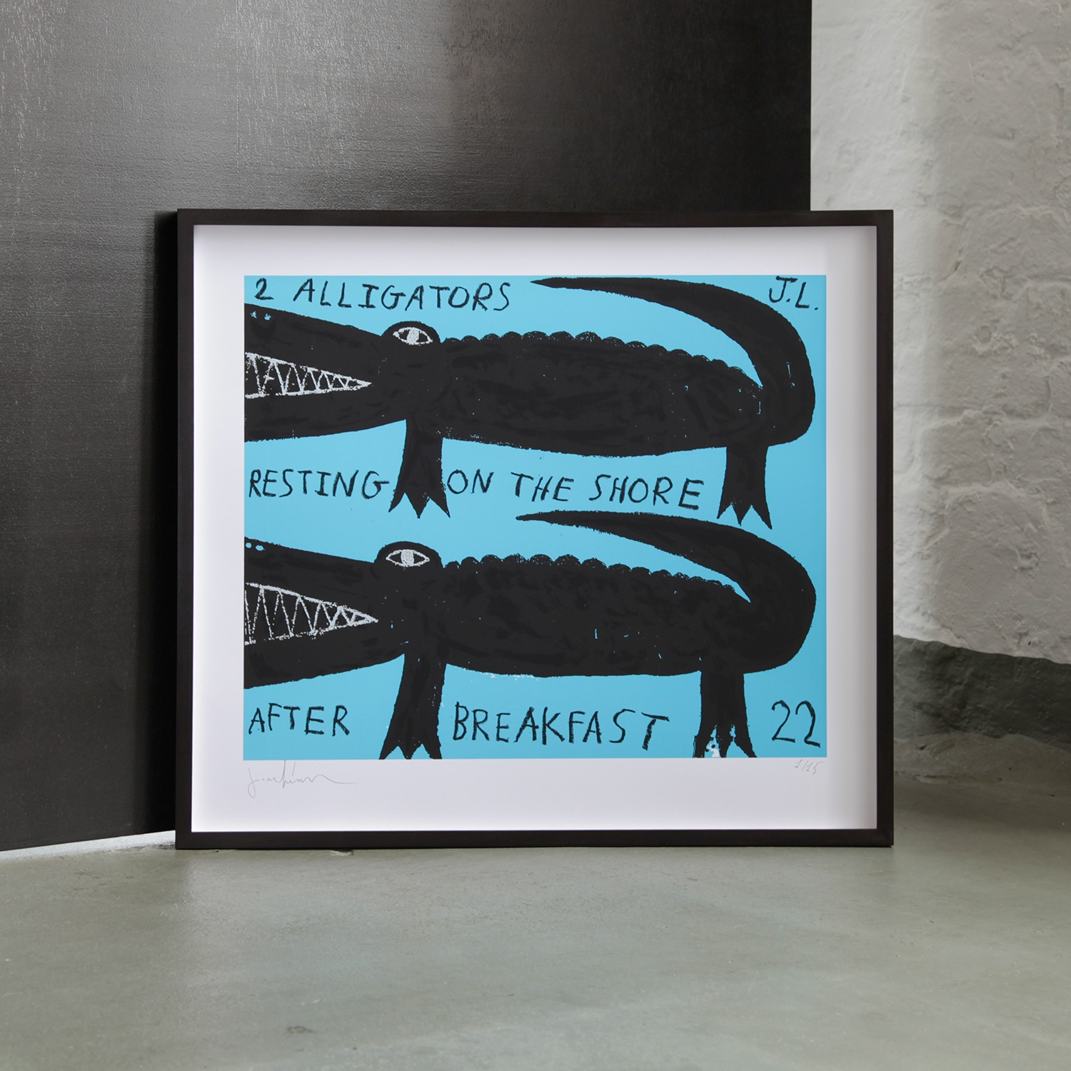 Joachim Lambrechts 2 alligators resting on the shore after breakfast - blue, 2021/2022 Material 4-color silkscreen on 300gr handmade paper, hand-finished (text is handwritten with oil stick) Production Method Produced exclusively for artflash Edition Size 15 Measurement Papersize: ca. 58 x 65 cm Printsize: ca. 55 x 62 cm edition size 15 + 5 AP signed + numbered Details about the frame Handmade, black stained and waxed maple wood frame, 10mm spacer bar, incl. normal glass, outer dimensions: approx. 60.2 x 67.2 cm, incl. rear hanging, dust-proof closed. The new and affordable way to buy contemporary art Strictly limited and signed art editions Limited stock From emerging talents to today’s most sought-after artists Easy and free sign-up to shop our weekly deals SIGN UP NOW Already have an account? About the editions "2 alligators resting on the shore after breakfast" is the title of the 2022 edition created exclusively for artflash, available in sandy yellow or pastel blue. Joachim Lambrechts added this sentence by hand after printing with oil pastels (or oil sticks?), along with his signature. He often integrates text that reflects the humor of his work, describing what we supposedly see, but which also serves him as a formal, compositional structuring element. "Words often keep the painting in balance," he says, and sometimes they are almost as important as the subject itself. The two-dimensional flatness of the crocodiles - typical of Lambrecht's works - once again underscores the unselfconsciousness that underlies the process of creation. And his strategy works: We have no choice but to see in the serigraphy two crocodiles sated with breakfast on the coast, and to enjoy their sight with a smile! about the artist Joachim Lambrechts works without sketches. Unlike the huge murals that the artist – coming from the graffiti scene – realized as commissioned works throughout Europe before he devoted himself exclusively to the canvas. In spontaneity, the Antwerp-born painter (*1986) finds the necessary freedom for his creativity. The former drummer compares his handling of drum sticks to that of paintbrushes: simply and joyfully get going! Music is still a great inspiration for him today. Works by Joachim Lambrechts are part of the Beth Rudin DeWoody Collection (USA) and the collection of The House of KOKO (London), among others. Latest Exhibitions (Selection) Works by Joachim Lambrechts will be on view at art Karlsruhe (July 7-10, 2022). In 2021, the "Allegro" exhibition at the Berlin branch of the Kristin Hjellegjerde Gallery showed Lambrecht´s artistic work. "Facing the Sun" was the name of the group exhibition at Görne Castle in the same year, which also presented works by Lambrechts. Links of Interest (Selection) Joachim Lambrechts on Instagram Lambrechts at Gallery Kristin Hjellegjerde, London/Berlin/Nevlunghavn Joachim Lambrechts as featured artist of the Munchies Art Club Video from Joachim Lambrechts about his „Allegro“-show (2021) Discover More Art Stefan Heyne Ohne Titel (Nr. 94 + Nr. 131 + Nr. 135), 2022 Heinrich Heidersberger VW Bad Wolfsburg, 1961, 1961 / 2022 Julio Le Parc Alchimie, 2018 Joachim Lambrechts 2 alligators resting on the shore after breakfast - yellow, 2021/2022 Bianca Kennedy Serie "Portraits of Taking a Bath in Movies": Curly Sue, 2022 Bianca Kennedy Serie "Portraits of Taking a Bath in Movies": Euphoria 3, 2022