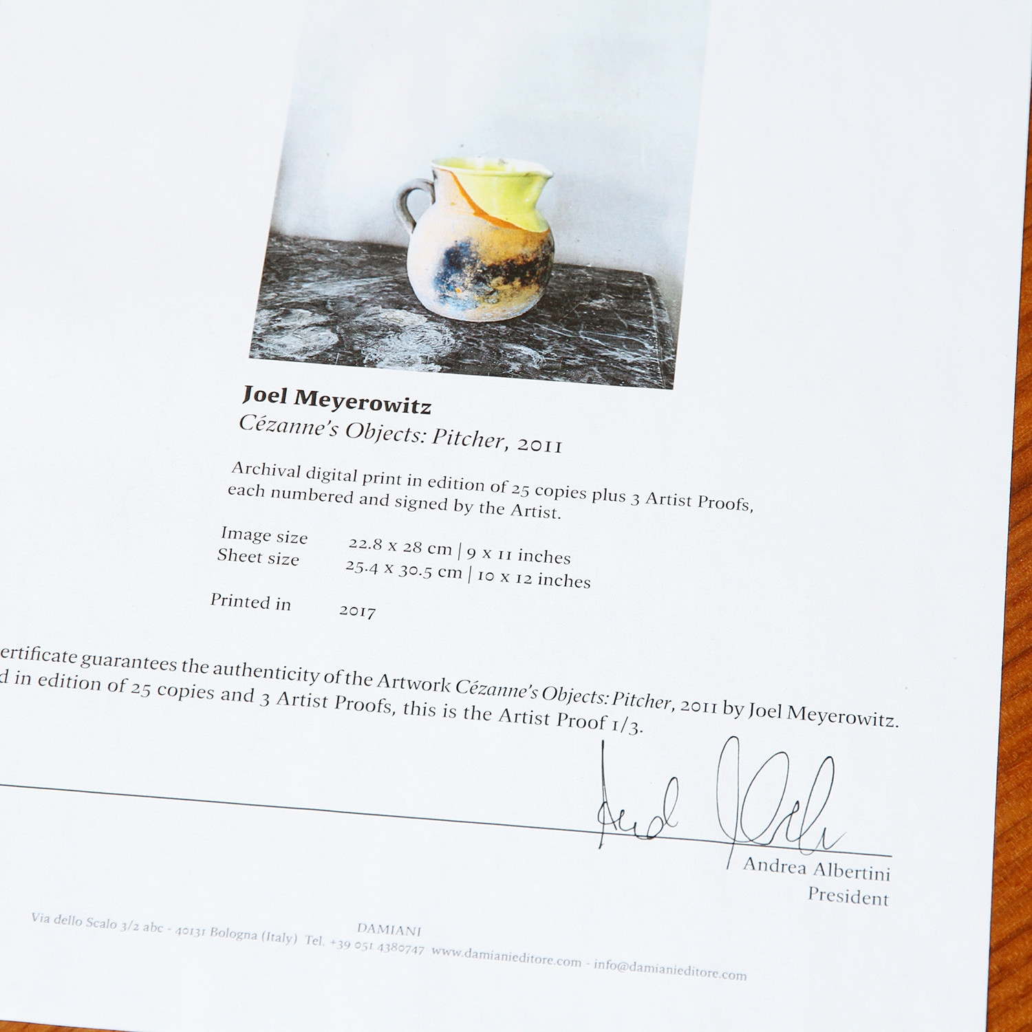 Joel Meyerowitz Cézanne's Objects. Pitcher, 2011/2018 Material Archival Digital Print, 100% Rag Paper, inkl. Buch: Cézanne's Objects Edition Size 25 Measurement Motivgröße: 22,8 x 28 cm Blattgröße: 25,4 x 30,5 cm Auflage 25 + 3 AP rückseitig signiert Details about the frame Handgefertigter nussdunklel gewachster Ahorn-Rahmen, 33 x 38,6 cm, inkl. Museumsglas und Inkl. rückseitiger Aufhängung, staubdicht verschlossen. The new and affordable way to buy contemporary art Strictly limited and signed art editions Limited stock From emerging talents to today’s most sought-after artists Easy and free sign-up to shop our weekly deals SIGN UP NOW Already have an account? Über die Edition Für ein Buchprojekt reiste der in New York und Italien lebende Fotograf Joel Meyerowitz nach Frankreich in die Provence und besuchte in Aix-en-Provence unter anderem das Atelier des Malers Paul Cézanne. Meyerowitz fiel sofort das warme und dunkle Grau auf, mit dem Cézanne seinen Arbeitsraum selbst gestrichen hatte und der sämtlichen Objekten, die von diesem Farbton hinterfangen waren, eine besondere Aura verlieh. Die auf 20 Exemplare limitierte und signierte Fotoedition zeigt einen tönernen Wasserkrug („Pitcher“) vor ebenjener grauen Wand. Das leichte Schattenspiel des Hintergrundes, die Farben des Kruges und die marmorierte Arbeitsfläche bilden in dieser Fotografie eine wunderbare Einheit. Über den Künstler Joel Meyerowitz zählt zu den bedeutendsten Mitbegründern der „Street Photography“ und der „New Color Photography“. Seit 1962 fotografiert er in Farbe ‒ seinerzeit ein Novum, denn nur die Schwarz-Weiß-Fotografie war damals als Kunst anerkannt. Gegenstand von Meyerowitz‘ Momentaufnahmen war das pulsierende Leben auf den Straßen New Yorks. Bis heute prägen seine Fotografien unser Bild von der amerikanischen Metropole. „Farbe hatte mehr beschreibende Kraft als Schwarz und Weiß. Ich verstand es als eine Erweiterung der Bandbreite von Inhalten und Emotionen“, hat Meyerowitz seine Entscheidung erläutert. Als 2001 die Türme des World Trade Centers einstürzten, verschaffte sich der Fotograf Zugang zum tagelang abgesperrten Gelände und fotografierte das rauchende Trümmerfeld. Auch diese dramatischen Bilder haben sich in das kollektive visuelle Gedächtnis in Bezug auf New York eingeschrieben. 1938 wird Meyerowitz in New York geboren, er wächst in der Bronx auf. Zunächst studiert er Malerei an der Ohio State University und arbeitet als Werbegrafiker. 2017 wird er mit dem „Leica Hall of Fame Award“ für sein Lebenswerk ausgezeichnet. Gerade noch, bis zum 11. März 2018, zeigte die C/O Berlin Foundation eine Retrospektive mit Vintageprints des Künstlers. Seit Beginn seiner Karriere wird sein Werk international in zahlreichen Ausstellungen gewürdigt: so etwa schon 1968 im Museum of Modern Art, New York, 1980 im Stedelijk Museum, Amsterdam, 2004 im Whitney Museum of American Art, New York, und 2014 im NRW-Forum, Düsseldorf. Latest Exhibitions (Selection) 2018, Joel Meyerowitz. Why Color?, C/O Foundation, Berlin 2017, Joel Meyerowitz. Where I Find Myself?, Le Botanique, Brüssel 2017, Between the Dog and the Wolf, Howard Greenberg Gallery, New York 2017, Joel Meyerowitz, Towards Colour 1962‒1978, Huxley-Parlour Gallery, London 2017 und 2016, Talking My Time I und II, Polka Galerie, Paris Links of Interest (Selection) Website des Fotografen Retrospektive von Joel Meyerowitz bei C/O Berlin TV-Magazinbeitrag über Joel Meyerowitz in der ARD Ausstellungsbesprechung von „Joel Meyerowitz. Why Color?“ auf Zeit.de Ausstellungsbesprechung von „Joel Meyerowitz. Why Color?” auf Welt.de Interview mit Joel Meyerowitz Joel Meyerowitz bei Howard Greenberg Gallery, New York Artikel zu Joel Meyerowitz‘ Werkserie „Morandi‘s Objects“