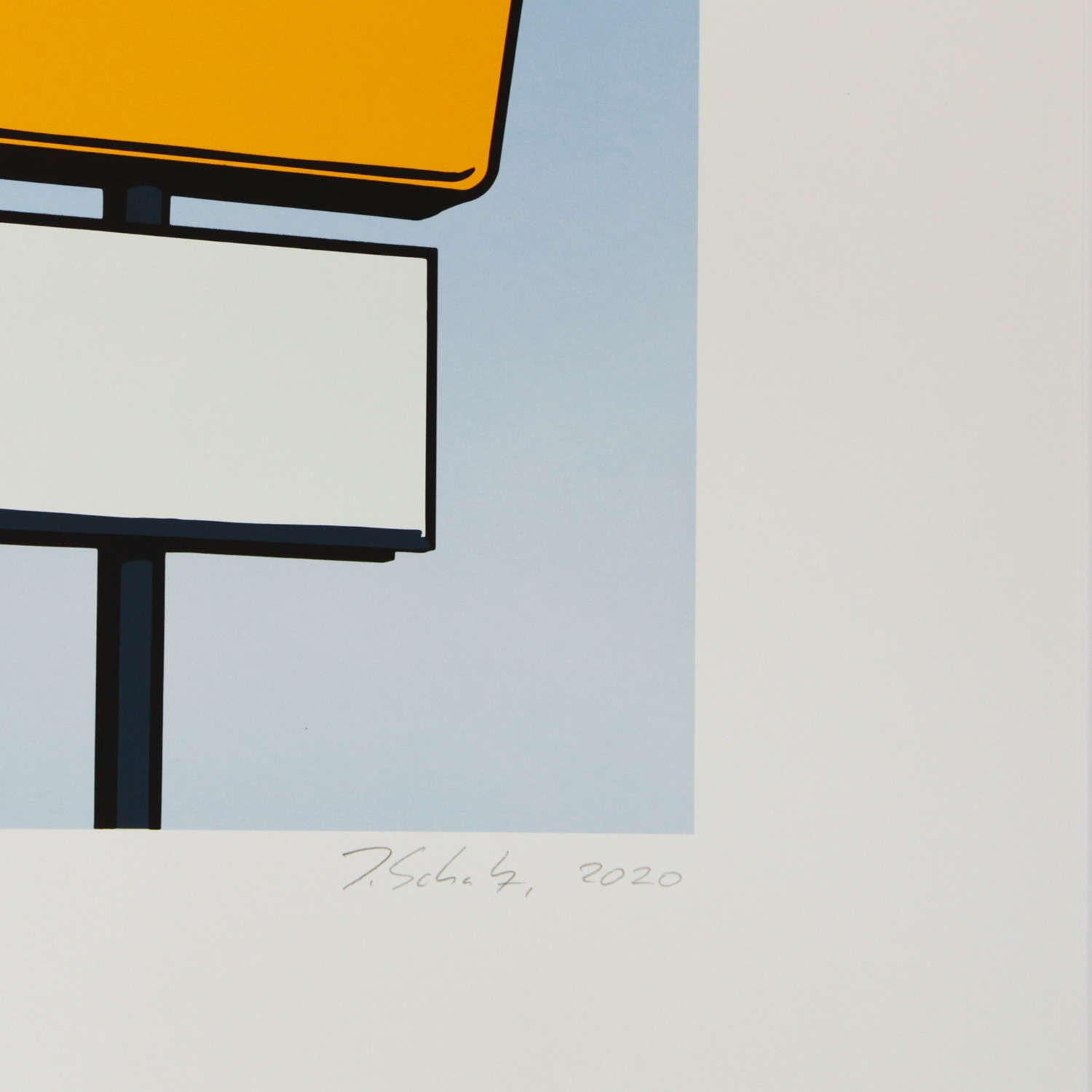Josef Schulz Aus der Serie "Sign Out" Gelb Weiß, 2020 Material Siebdruck, gedruckt auf 300g Hahnemühle Papier Edition Size 33 Measurement Papierformat 50 x 60 cm Motivformat 30 x 40 cm Auflage 33 auf der Vorderseite signiert, datiert und nummeriert Details about the frame Handgefertigter Ahorn-Holzrahmen, Titan weiß gewachst, Außenmaße ca 66,2 x 56,2 cm, inkl. Distanzleiste, hochgestellt montiert, inkl. rückseitiger Aufhängung The new and affordable way to buy contemporary art Strictly limited and signed art editions Limited stock From emerging talents to today’s most sought-after artists Easy and free sign-up to shop our weekly deals SIGN UP NOW Already have an account? Über die Edition Tankstellen, Fast-Food-Ketten, Motels – die großen Werbetafeln entlang der Highways spiegeln den American Way in besonderer Weise. Den Fotografen Josef Schulz haben sie gleich zu einer ganzen Serie animiert. So sind zunächst Fotografien, später Siebdrucke in kleiner Auflage entstanden. „Sign out“ hat er sie genannt und die Schilder darauf radikal ihrer Botschaften und Gebrauchsspuren beraubt. Die Abbildungen gewinnen so eine malerische Qualität. Und es kommen Nostalgie und Wehmut auf: Der Traum von bunten Warenwelten und dem Wohlstandsversprechen für alle scheint endgültig ausgeträumt. Gleichzeitig wird jedoch Platz gemacht für Neues. Denn wer käme beim Anblick dieser einladenden Flächen vor blauem Himmel nicht auf eigene Gedanken, Wünsche und Ideen? Text: Cara Wuchold Über den Künstler Seine Vorliebe für industriell geprägte Landschaften teilt der Fotograf Josef Schulz (*1966) mit einem seiner früheren Professoren an der Düsseldorfer Kunstakademie: Bernd Becher. Der dokumentierte gemeinsam mit seiner Frau Hilla Becher Bergwerke, Fördertürme, Gasbehälter, Hochöfen, Kraftwerke, Kühltürme, Getreidesilos und Lagerhäuser in Europa und Nordamerika. Josef Schulz – später Meisterschüler von Thomas Ruff – wurde bereits mehrfach ausgezeichnet, u.a. als Europäischer Architekturfotograf des Jahres 2001 und als CityARTist NRW 2020. Seine Werke sind in Ausstellungen weltweit zu sehen und gehören zum Bestand zahlreicher Sammlungen, darunter die Art Collection Deutsche Börse, die UBS Art Collection und das Aarhus Art Museum. Latest Exhibitions (Selection) Beim 13. Festival für zeitgenössische Fotografie „OFF Bratislava“ 2022 stellte Josef Schulz unter dem Titel „Passage“ in der FOG Gallery aus. Ebenfalls 2022 zeigte die Galerie Fiebach & Minninger in Köln mit „Terra incognita“ eine Soloschau des Fotografen, zudem waren Werke von ihm in der Gruppenausstellung „Horizon, Interrupted“ in der Garage Rotterdam zu sehen. Im Jahr zuvor, 2021, beteiligte sich Schulz an der Schau „KM 52 ‒ Punto de fuga ‒ Vanishing Point“ im Centro de Arte UNLP im Rahmen der BIENALSUR 2021 in Buenos Aires. Links of Interest (Selection) Webseite von Josef Schulz Discover More Art Nam June Paik o.T. – aus der Sydney Mappe, 1990 Christo & Jeanne-Claude Package on a Hunt, 1988 Joseph Beuys Schamanentopf, 1984 Wolf Vostell Klammerbuch, 1966