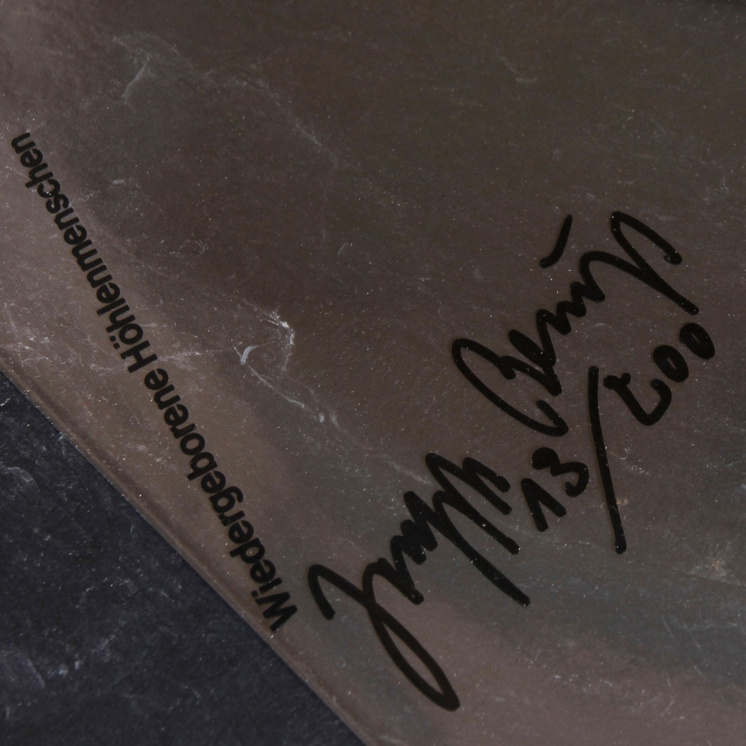 Die Edition „Wiedergeborene Höhlenmenschen“ ist ein berührendes Dokument dieser Freundschaft – und nimmt ein Stück Zeitgeschichte vorweg: Naegeli selbst trug in Riehen als eine Art Maske eine schwarze Kerze mit zwei Sehschlitzen über dem Kopf – wie die Figur neben Beuys. Über diesem schweben Filzumhang und Stock wie Beuys’ eigener Schatten und mit ihm die Erinnerung an die berühmte Kojoten-Performance des Künstlers in New York. Naegeli hat das handsignierte Blatt mit einer seiner unverwechselbaren Gestalten versehen, die er mit wenigen Strichen zu zauberhaftem Leben erweckt.