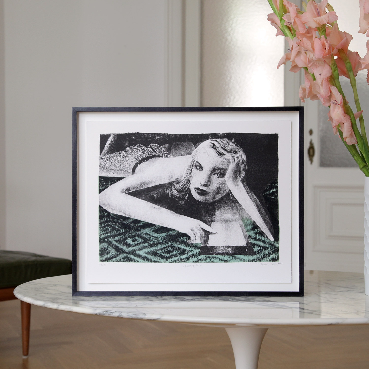 Julius Hofmann Lurking Teen, 2021 Material Lithografie Production Method gedruckt bei Steinwerk Leipzig Edition Size 24 Measurement Blattgröße 42,5 x 33 cm, Motivmaß: 38 x 26,5 cm Auflage 24 signiert + nummeriert Details about the frame Handgefertigter Ahorn-Holzrahmen, schwarz/shabby gebeizt, gewachst, inkl. 8mm Distanzleiste, Blatt ist hochgestellt montiert, Normalglas Außenmaße: ca. 38,4 x 48,0 cm, mit rückseitiger Aufhängung. The new and affordable way to buy contemporary art Strictly limited and signed art editions Limited stock From emerging talents to today’s most sought-after artists Easy and free sign-up to shop our weekly deals SIGN UP NOW Already have an account? Über die Edition Gelangweilt schaut er uns an ‒ oder eher: durch uns hindurch ‒, der weibliche „Lurking Teen“ von Julius Hofmann, den Finger auf dem Touchpad, den Kopf in die Hand gestützt. Mit geschminkten Augen und Lippen und trotzigem Selbstbewusstsein liegt das Mädchen da im Schein des Displays, ein wenig zu verführerisch, aber ebenso verführbar. Hofmanns Porträt spiegelt nicht nur die Fluidität der Gefühle des Coming of Age. Durch den Verweis auf unser digitales Zeitalter ist dieses klassische Sujet ohne die allgegenwärtige Bilderflut inklusive Selfie-Kultur, Voyeurismus und des Problemfelds sensibler Daten im Hinterkopf kaum mehr zu denken oder heutiger: zu konsumieren. Auf diese Weise schafft der Künstler einen spannenden Spagat und schmuggelt die Komplexität der bildergestützten Gegenwart in die alten, künstlerisch seit jeher bearbeiteten Fragen. Über den Künstler Julius Hofmann, geboren 1983, hat sich nichts weniger vorgenommen, als die Malerei mit digitalen Ästhetiken zu verschränken – und zwar vorwärts und rückwärts. Neben der klassischen Ausbildung als Schüler von Neo Rauch und Heribert C. Ottersbach an der Hochschule für Grafik und Buchkunst in Leipzig sind Video- und Computerspiele als weitere Inspirationsquellen für sein Werk nicht zu übersehen. Am direktesten zeigt sich dies an den an Superheroen angelehnten Figuren in seinen Videofilmen, nicht technisch perfekt, sondern spielerisch zusammengesetzt aus am Kubismus orientierten Formen. Ebenso nimmt uns auch seine Malerei mit in fantastische, nicht selten düstere Welten, wird zur Reflexionsfläche der animierten Bilder. Latest Exhibitions (Selection) Im anlaufenden Oktober 2021 stellt Julius Hofmann bei Althuis Hofland Fine Arts in Amsterdam aus. Zudem waren in diesem Jahr in der Gruppenausstellung „The ORGE.net“ in der Pariser Galerie Suzanne Tarasieve bereits Werke von ihm zu sehen. „Will of the Gods is Great Power‟ hieß 2020 die Soloausstellung des Künstlers in der Galerie Kleindienst auf dem Gelände der Spinnerei Leipzig. Links of Interest (Selection) Webseite von Julius Hofmann Instagram-Account des Künstlers 2019 erhielt Julius Hofmann das Arbeitsstipendium der Bonner Stiftung Kunstfonds „Tagespiegel“-Artikel über die Ausstellung „Colors of Descents“ (2017) in der Leipziger G2 Kunsthalle Discover More Art Olaf Hajek Golden Tear, 2020 Martin Parr Glenbeigh Races, County Kerry, 1983 , 2021 Christo & Jeanne-Claude (Set-Angebot) Over the River I & II, 1994 Tal R Lillen, 2019 Tal R Blomster uden titel, 2019 Tal R Rajasthani poppets , 2019