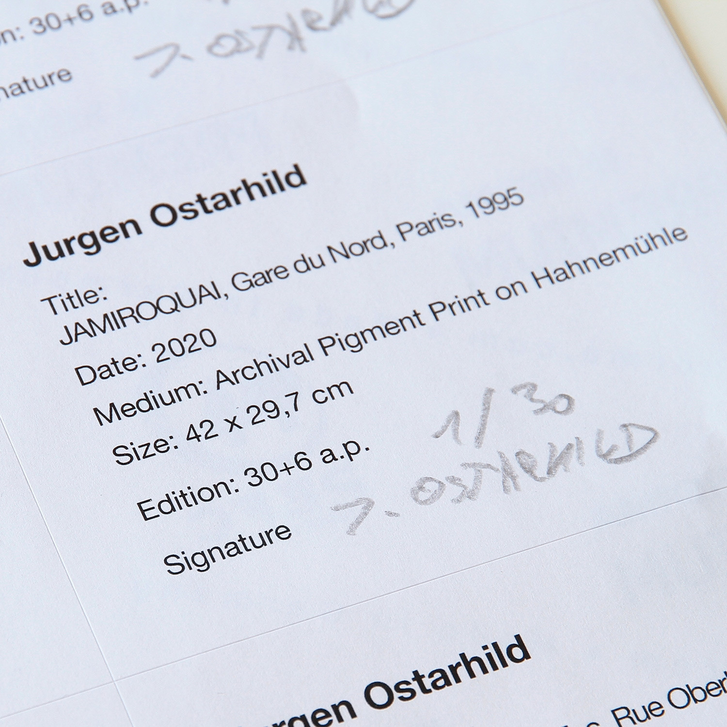 Jurgen Ostarhild JAMIROQUAI Gare du Nord, Paris, 1995, bw, 1995/2020 Material Archival Fine Art Print Production Method rückseitig signiert + separat auf Label signiert, datiert, nummeriert Edition Size 30 Measurement 29,7 x 42 cm Auflage 30 + 6 AP Details about the frame Handgefertigter schwarz gebeizter und gewachster Ahornholz-Rahmen, inkl. 8mm Distanzleiste, Außenmaße: 31,5 x 43,5 cm, inkl. Museumsglas. Inkl. rückseitiger Aufhängung The new and affordable way to buy contemporary art Strictly limited and signed art editions Limited stock From emerging talents to today’s most sought-after artists Easy and free sign-up to shop our weekly deals SIGN UP NOW Already have an account? Über die Edition Die 90er Jahre, dieses feier- und tanzwütige, hedonistische Dezennium am Ende des 20. Jahrhunderts ‒ einer, der zu seinem Soundtrack gehört, ist unbedingt Moby. Ihn traf der deutsche Konzeptkünstler Jurgen Ostarhild zum Shooting im Londoner South Kensington 1991, also genau zur richtigen Zeit. Ostarhild fotografierte damals für das in Bezug auf Bildsprache und Typografie richtungsweisende britische Lifestyle-Magazin „i-D“. Er nutzte den Schnappschuss als ernst zu nehmendes Mittel der Fotografie und schuf schonungslose, teils extrem hell ausgeleuchtete Porträts von großer Nähe und Intensität. Die Musiker Jamiroquai und Air, die Modedesigner John Galliano und Nicolas Ghesquière oder das Supermodel Kate Moss, damals zarte 18 Jahre alt, sie alle ließen sich von Ostarhild ablichten. Entstanden sind stilbildende Porträts, die den Geist der 90er Jahre authentisch und ungefiltert in die Gegenwart transportieren. Über den Künstler Seine Karriere begann Jurgen Ostarhild Ende der 70er Jahre als junger Assistent von Oliviero Toscani, später vieldiskutiert für seine kontroversen Benetton-Kampagnen. Im Sommer 1979 wechselte er nach New York, wo er als Studioassistent des britischen Mode- und Porträtfotografen Albert Watson arbeitete, dessen Arbeiten regelmäßig die Cover der „Vogue“ oder des „Rolling Stone“ schmückten. Zurück in Deutschland, gründete Ostarhild 1982 dann sein eigenes Studio. Später weltweit bekannten Fotografen wie Wolfgang Tillmans, Terry Richardson oder Juergen Teller ebnete er den Weg. Er hingegen ist bis heute zu Unrecht nur Insidern ein Begriff, dabei war seine Arbeit genrebildend. So erkannte er die Qualität des Schnappschusses als fotografisches Ausdrucksmittel, brachte die Action in die Modefotografie, schuf einzigartig intime, schonungslose Porträts und fotografierte superclose. Seit 2010 arbeitet Ostarhild an einer Serie von Werken, die den Hexadezimalcode seiner Digitalfotos zeigen. 2019 zeigte er Beispiele daraus in einer Ausstellung am Institut für Konstruktive Kunst und Konkrete Poesie (IKKP) in Rehau. Mit seinen Maschinenporträts, die er seit einiger Zeit auf Instagram veröffentlicht, hat er sich als Fotograf nun selbst abgeschafft. Die Kreativität steckt hier nicht mehr im Bild, sondern im – von ihm selbst erfundenen – Apparat und im Prozess. Die Bildproduktion ist entkoppelt vom Künstler. Algorithmen ermöglichen das Auslösen der Kamera, eine korrekte Belichtung, eine sofortige digitale Veröffentlichung und die Archivierung der produzierten Bilder. Latest Exhibitions (Selection) 2019 stellte Jurgen Ostarhild Arbeiten, die den Hexadezimalcode seiner Digitalfotos zeigen, am Institut für Konstruktive Kunst und Konkrete Poesie (IKKP) in Rehau aus. 2002 zeigte die Galerie Jerome de Noirmont in Paris in Ostarhilds erster Einzelausstellung unter dem Titel „Überbabes“ Porträts von Transgender-Avataren. Mit diesen mithilfe von Photoshop erstellten Collagen hat Ostarhild eine ganz neue Realität erschaffen. Links of Interest (Selection) Webseite des Künstlers Webseite mit einem Überblick über das Schaffen Jurgen Ostarhilds Über Jurgen Ostarhilds fortlaufendes Kunstprojekt mit 144 Fichten in Berlin-Mitte Link zu Jurgen Ostarhilds Maschinenporträts auf Instagram