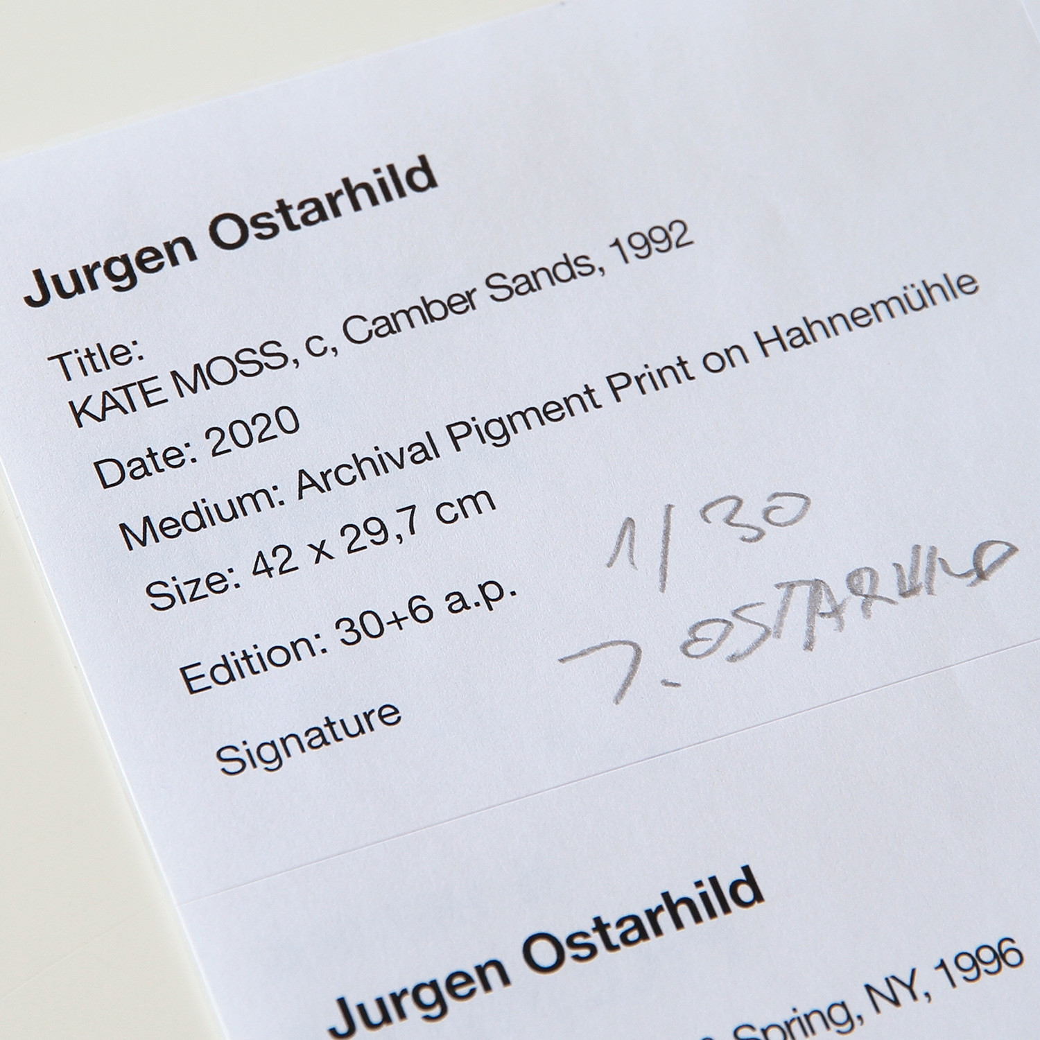 Jurgen Ostarhild KATE MOSS, bw, Camber Sands, 1992, bw, 1992/2020 Material Archival Fine Art Print Edition Size 30 Measurement 29,7 x 42 cm Auflage 30 + 6 AP rückseitig signiert + separat auf Label signiert, datiert, nummeriert Details about the frame Handgefertigter schwarz gebeizter und gewachster Ahornholz-Rahmen, inkl. 8mm Distanzleiste, Außenmaße: 31,5 x 43,5 cm, inkl. Museumsglas. Inkl. rückseitiger Aufhängung The new and affordable way to buy contemporary art Strictly limited and signed art editions Limited stock From emerging talents to today’s most sought-after artists Easy and free sign-up to shop our weekly deals SIGN UP NOW Already have an account? Über die Edition Die 90er Jahre, dieses feier- und tanzwütige, hedonistische Dezennium am Ende des 20. Jahrhunderts ‒ einer, der zu seinem Soundtrack gehört, ist unbedingt Moby. Ihn traf der deutsche Konzeptkünstler Jurgen Ostarhild zum Shooting im Londoner South Kensington 1991, also genau zur richtigen Zeit. Ostarhild fotografierte damals für das in Bezug auf Bildsprache und Typografie richtungsweisende britische Lifestyle-Magazin „i-D“. Er nutzte den Schnappschuss als ernst zu nehmendes Mittel der Fotografie und schuf schonungslose, teils extrem hell ausgeleuchtete Porträts von großer Nähe und Intensität. Die Musiker Jamiroquai und Air, die Modedesigner John Galliano und Nicolas Ghesquière oder das Supermodel Kate Moss, damals zarte 18 Jahre alt, sie alle ließen sich von Ostarhild ablichten. Entstanden sind stilbildende Porträts, die den Geist der 90er Jahre authentisch und ungefiltert in die Gegenwart transportieren. Über den Künstler Seine Karriere begann Jurgen Ostarhild Ende der 70er Jahre als junger Assistent von Oliviero Toscani, später vieldiskutiert für seine kontroversen Benetton-Kampagnen. Im Sommer 1979 wechselte er nach New York, wo er als Studioassistent des britischen Mode- und Porträtfotografen Albert Watson arbeitete, dessen Arbeiten regelmäßig die Cover der „Vogue“ oder des „Rolling Stone“ schmückten. Zurück in Deutschland, gründete Ostarhild 1982 dann sein eigenes Studio. Später weltweit bekannten Fotografen wie Wolfgang Tillmans, Terry Richardson oder Juergen Teller ebnete er den Weg. Er hingegen ist bis heute zu Unrecht nur Insidern ein Begriff, dabei war seine Arbeit genrebildend. So erkannte er die Qualität des Schnappschusses als fotografisches Ausdrucksmittel, brachte die Action in die Modefotografie, schuf einzigartig intime, schonungslose Porträts und fotografierte superclose. Seit 2010 arbeitet Ostarhild an einer Serie von Werken, die den Hexadezimalcode seiner Digitalfotos zeigen. 2019 zeigte er Beispiele daraus in einer Ausstellung am Institut für Konstruktive Kunst und Konkrete Poesie (IKKP) in Rehau. Mit seinen Maschinenporträts, die er seit einiger Zeit auf Instagram veröffentlicht, hat er sich als Fotograf nun selbst abgeschafft. Die Kreativität steckt hier nicht mehr im Bild, sondern im – von ihm selbst erfundenen – Apparat und im Prozess. Die Bildproduktion ist entkoppelt vom Künstler. Algorithmen ermöglichen das Auslösen der Kamera, eine korrekte Belichtung, eine sofortige digitale Veröffentlichung und die Archivierung der produzierten Bilder. Latest Exhibitions (Selection) 2019 stellte Jurgen Ostarhild Arbeiten, die den Hexadezimalcode seiner Digitalfotos zeigen, am Institut für Konstruktive Kunst und Konkrete Poesie (IKKP) in Rehau aus. 2002 zeigte die Galerie Jerome de Noirmont in Paris in Ostarhilds erster Einzelausstellung unter dem Titel „Überbabes“ Porträts von Transgender-Avataren. Mit diesen mithilfe von Photoshop erstellten Collagen hat Ostarhild eine ganz neue Realität erschaffen. Links of Interest (Selection) Webseite des Künstlers Webseite mit einem Überblick über das Schaffen Jurgen Ostarhilds Über Jurgen Ostarhilds fortlaufendes Kunstprojekt mit 144 Fichten in Berlin-Mitte Link zu Jurgen Ostarhilds Maschinenporträts auf Instagram Discover More Art Jurgen Ostarhild MARTIN KIPPENBERGER, bw, Hotel Chelsea, Köln, 1987, 2020 Jurgen Ostarhild JAMIROQUAI Gare du Nord, Paris, 1995, bw, 1995/2020 Jurgen Ostarhild JOHN GALLIANO, Hoxton Square, London, 1992, bw, 1992/2020 Jurgen Ostarhild NICOLAS GHESQUIÈRE, Rue Oberkampf, Paris, 1991, bw, 1991/2020 Jurgen Ostarhild MOBY, South Kensington, London, 1991, bw, 1991/2020 Jurgen Ostarhild MOBY, South Kensington, London, 1991, 1991/2020 Jurgen Ostarhild KATE MOSS, c, Camber Sands, 1992, 1992/2020 Jurgen Ostarhild JOHN GALLIANO, Hoxton Square, London, 1992, c, 1992/2020 Jurgen Ostarhild KISS, Rue des Petites Ecuries, Paris 1999, c, 1999/2020 Jurgen Ostarhild NICOLAS GHESQUIÈRE, Rue Oberkampf, Paris, 1991 c, 1991/2020 Jurgen Ostarhild MAYA, Broadway & Spring, NY, 1996, c, 1996/2020 Jurgen Ostarhild Stilikonen der 90er, Mappe b/w, 2020 Jurgen Ostarhild Stilikonen der 90er, Mappe c, 2020 Jurgen Ostarhild Stilikonen der 90er, Vorzugsausgabe inkl. 12 Fotografien, 2020