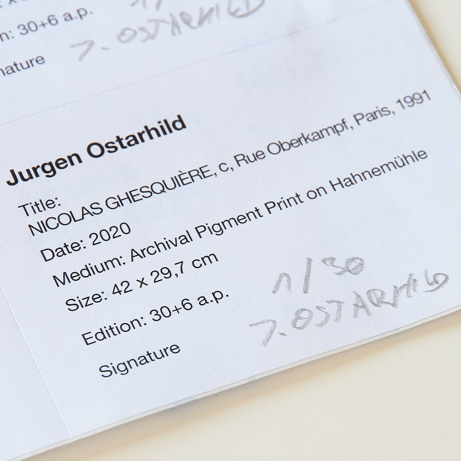 Jurgen Ostarhild NICOLAS GHESQUIÈRE, Rue Oberkampf, Paris, 1991 c, 1991/2020 Material Archival Fine Art Print Production Method rückseitig signiert + separat auf Label signiert, datiert, nummeriert Edition Size 30 Measurement 29,7 x 42 cm Auflage 30 + 6 AP Details about the frame Handgefertigter weiß lasierter Ahornholz-Rahmen, inkl. 8mm Distanzleiste, Außenmaße: 31,5 x 43,5 cm, inkl. Museumsglas. Inkl. rückseitiger Aufhängung The new and affordable way to buy contemporary art Strictly limited and signed art editions Limited stock From emerging talents to today’s most sought-after artists Easy and free sign-up to shop our weekly deals SIGN UP NOW Already have an account? Über die Edition Die 90er Jahre, dieses feier- und tanzwütige, hedonistische Dezennium am Ende des 20. Jahrhunderts ‒ einer, der zu seinem Soundtrack gehört, ist unbedingt Moby. Ihn traf der deutsche Konzeptkünstler Jurgen Ostarhild zum Shooting im Londoner South Kensington 1991, also genau zur richtigen Zeit. Ostarhild fotografierte damals für das in Bezug auf Bildsprache und Typografie richtungsweisende britische Lifestyle-Magazin „i-D“. Er nutzte den Schnappschuss als ernst zu nehmendes Mittel der Fotografie und schuf schonungslose, teils extrem hell ausgeleuchtete Porträts von großer Nähe und Intensität. Die Musiker Jamiroquai und Air, die Modedesigner John Galliano und Nicolas Ghesquière oder das Supermodel Kate Moss, damals zarte 18 Jahre alt, sie alle ließen sich von Ostarhild ablichten. Entstanden sind stilbildende Porträts, die den Geist der 90er Jahre authentisch und ungefiltert in die Gegenwart transportieren. Über den Künstler Seine Karriere begann Jurgen Ostarhild Ende der 70er Jahre als junger Assistent von Oliviero Toscani, später vieldiskutiert für seine kontroversen Benetton-Kampagnen. Im Sommer 1979 wechselte er nach New York, wo er als Studioassistent des britischen Mode- und Porträtfotografen Albert Watson arbeitete, dessen Arbeiten regelmäßig die Cover der „Vogue“ oder des „Rolling Stone“ schmückten. Zurück in Deutschland, gründete Ostarhild 1982 dann sein eigenes Studio. Später weltweit bekannten Fotografen wie Wolfgang Tillmans, Terry Richardson oder Juergen Teller ebnete er den Weg. Er hingegen ist bis heute zu Unrecht nur Insidern ein Begriff, dabei war seine Arbeit genrebildend. So erkannte er die Qualität des Schnappschusses als fotografisches Ausdrucksmittel, brachte die Action in die Modefotografie, schuf einzigartig intime, schonungslose Porträts und fotografierte superclose. Seit 2010 arbeitet Ostarhild an einer Serie von Werken, die den Hexadezimalcode seiner Digitalfotos zeigen. 2019 zeigte er Beispiele daraus in einer Ausstellung am Institut für Konstruktive Kunst und Konkrete Poesie (IKKP) in Rehau. Mit seinen Maschinenporträts, die er seit einiger Zeit auf Instagram veröffentlicht, hat er sich als Fotograf nun selbst abgeschafft. Die Kreativität steckt hier nicht mehr im Bild, sondern im – von ihm selbst erfundenen – Apparat und im Prozess. Die Bildproduktion ist entkoppelt vom Künstler. Algorithmen ermöglichen das Auslösen der Kamera, eine korrekte Belichtung, eine sofortige digitale Veröffentlichung und die Archivierung der produzierten Bilder. Latest Exhibitions (Selection) 2019 stellte Jurgen Ostarhild Arbeiten, die den Hexadezimalcode seiner Digitalfotos zeigen, am Institut für Konstruktive Kunst und Konkrete Poesie (IKKP) in Rehau aus. 2002 zeigte die Galerie Jerome de Noirmont in Paris in Ostarhilds erster Einzelausstellung unter dem Titel „Überbabes“ Porträts von Transgender-Avataren. Mit diesen mithilfe von Photoshop erstellten Collagen hat Ostarhild eine ganz neue Realität erschaffen. Links of Interest (Selection) Webseite des Künstlers Webseite mit einem Überblick über das Schaffen Jurgen Ostarhilds Über Jurgen Ostarhilds fortlaufendes Kunstprojekt mit 144 Fichten in Berlin-Mitte Link zu Jurgen Ostarhilds Maschinenporträts auf Instagram Discover More Art Jurgen Ostarhild MARTIN KIPPENBERGER, bw, Hotel Chelsea, Köln, 1987, 2020 Jurgen Ostarhild JAMIROQUAI Gare du Nord, Paris, 1995, bw, 1995/2020 Jurgen Ostarhild JOHN GALLIANO, Hoxton Square, London, 1992, bw, 1992/2020 Jurgen Ostarhild KATE MOSS, bw, Camber Sands, 1992, bw, 1992/2020 Jurgen Ostarhild NICOLAS GHESQUIÈRE, Rue Oberkampf, Paris, 1991, bw, 1991/2020 Jurgen Ostarhild MOBY, South Kensington, London, 1991, bw, 1991/2020 Jurgen Ostarhild MOBY, South Kensington, London, 1991, 1991/2020 Jurgen Ostarhild KATE MOSS, c, Camber Sands, 1992, 1992/2020 Jurgen Ostarhild JOHN GALLIANO, Hoxton Square, London, 1992, c, 1992/2020 Jurgen Ostarhild KISS, Rue des Petites Ecuries, Paris 1999, c, 1999/2020