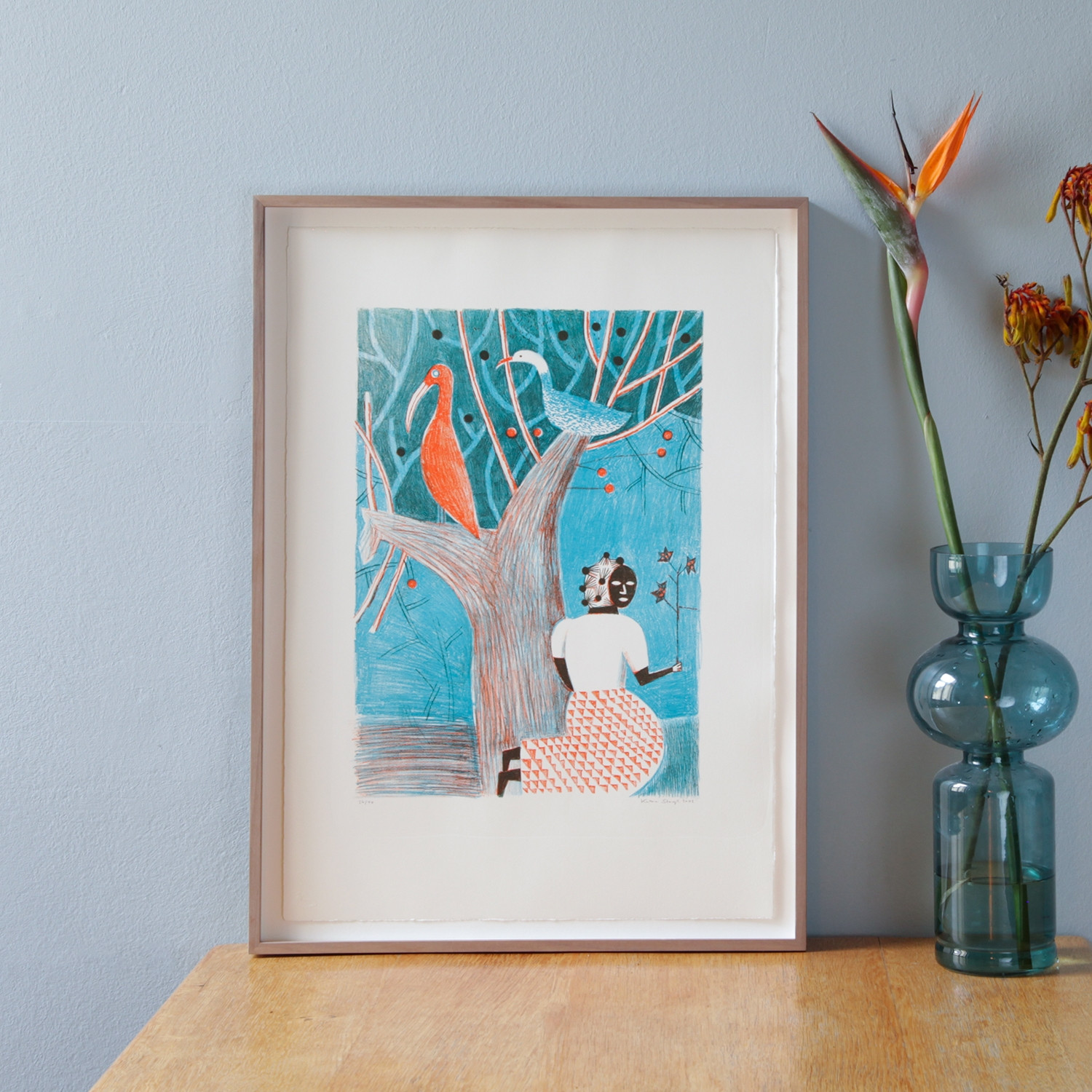 Katrin Stangl Sumatra, 2008 Material 3 Farben Lithografie Edition Size 40 Measurement 59,4 x 42 cm Auflage 40 auf der Vorderseite signiert, datiert und nummeriert Details about the frame Handgefertigter Nussbaum Holzrahmen, inkl. 10mm Distanzleiste und Normalglas. Außenmaße ca. 64,2 x 47,2 cm. Inkl. rückseitiger Aufhängung The new and affordable way to buy contemporary art Strictly limited and signed art editions Limited stock From emerging talents to today’s most sought-after artists Easy and free sign-up to shop our weekly deals SIGN UP NOW Already have an account? Über die Künstlerin und die Edition Der blaudominierten Nachtszene in Katrin Stangls Lithografie „Sumatra“ haftet etwas Traumhaftes, Geheimnisvolles an: Der Blick der knienden, einen Ast balancierenden Frau mit maskenhaftem Gesicht trifft uns vielsagend. Die tropisch anmutenden Vögel scheinen für den blätterlosen, mit vereinzelten Früchten bespickten Baum überdimensioniert. Die Grafik gehört zu einem anderen Blatt der Künstlerin mit dem Titel „Nachts im Wald“, von einer realen Reise nach Madagaskar inspiriert. Ihre nach der indonesischen Insel Sumatra benannte, spannungsgeladene Arbeit wiederum fußt auf keinem realen Hintergrund, alles ist fantasievoll-frei erfunden. Wenige Farben braucht Katrin Stangl, um uns hineinzukatapultieren in eine Geschichte, deren Anfang und Ende wir nicht kennen, die hier aber eine entscheidende Wendung zu nehmen scheint. Wer würde nicht wissen wollen, wie es weitergeht? Fest steht: Mit Geschichten kennt sich die Autorin, Illustratorin und Grafikerin aus: Für ihre Buchkunst und Ihre Illustrationen wurde Katrin Stangl vielfach ausgezeichnet, u.a. mit dem Gestalterpreis der Büchergilde Gutenberg und dem Preis der Stiftung Buchkunst. Seit 2009 ist sie Mitglied der Künstlerinnengruppe SPRING. Latest Exhibitions (Selection) Katrin Stangl war 2023 beim „„Let’s print in Leipzig – LAB“ vom Museum für Druckkunst Leipzig beteiligt. Im August 2023 zeigte Stangl Arbeiten in der Gruppenausstellung "Himbeergeist und Sauerampfer" bei Thalergrafik Leipzig. Im April 2023 stellte Katrin Stangl Originale, Druckgrafiken und Keramik in der Galerie Segunda in Bilbao aus. Unter dem Titel „Scheitern“ erschien 2022 die 19. Ausgabe des „Spring“-Magazins vom SPRING-Kollektiv, zu dem Katrin Stangl gehört, das laut „Tagesspiegel“ „längst zu den interessantesten deutschen Comicanthologien gehört“. Links of Interest (Selection) Homepage von Katrin Stangl Instagram der Künstlerin „Deutschlandfunk“-Interview mit Katrin Stangl und ihrer Atelier-Kollegin Heike Herold Discover More Art Anna Stahn Newspaper Print, 2022 Joachim Lambrechts Marilyn Monroe in New York, 2022/2023 Jordan Sullivan Hotel Traymore, 2022 Nadine Wölk Symposium 1, 2022 Stefan Marx Our Future, 2023