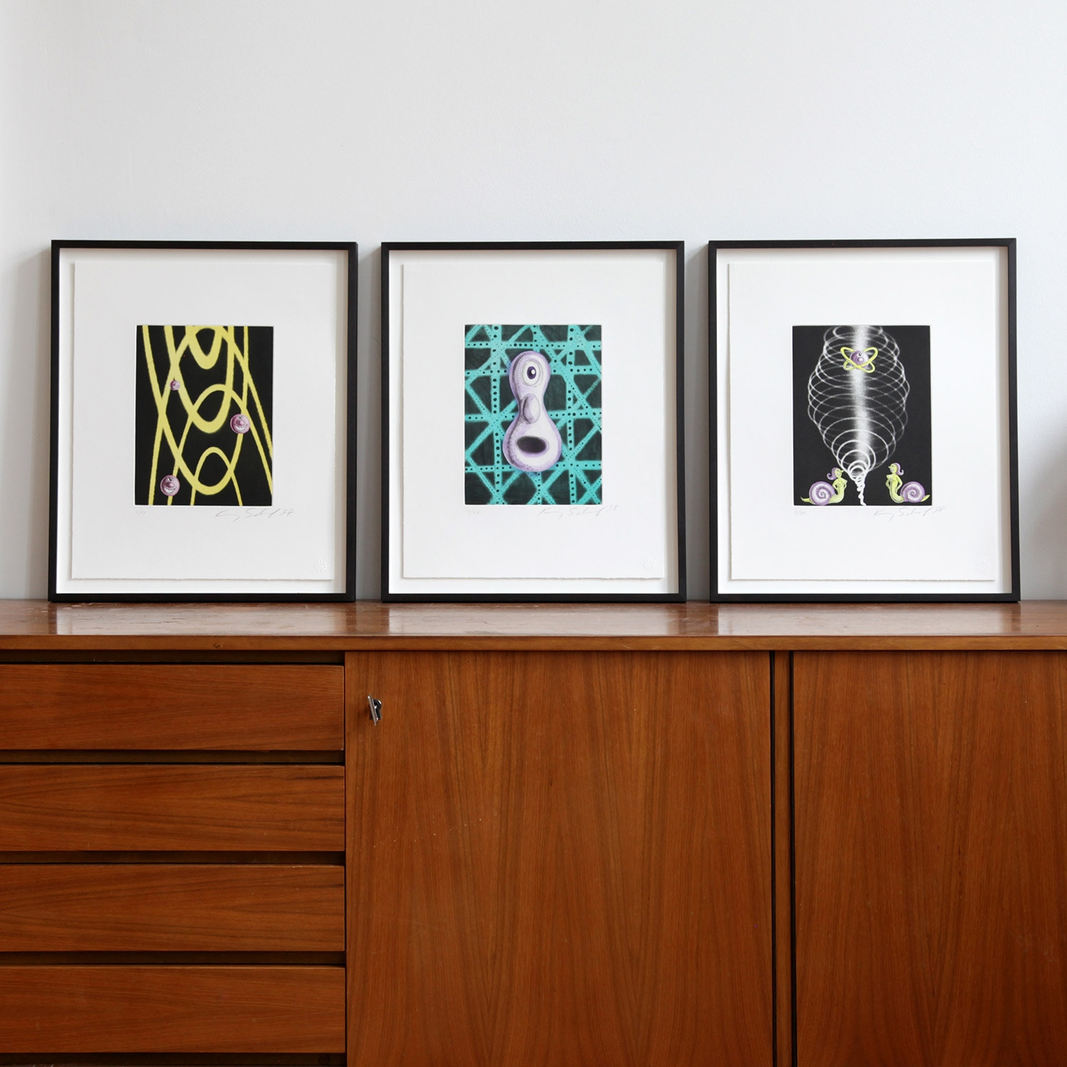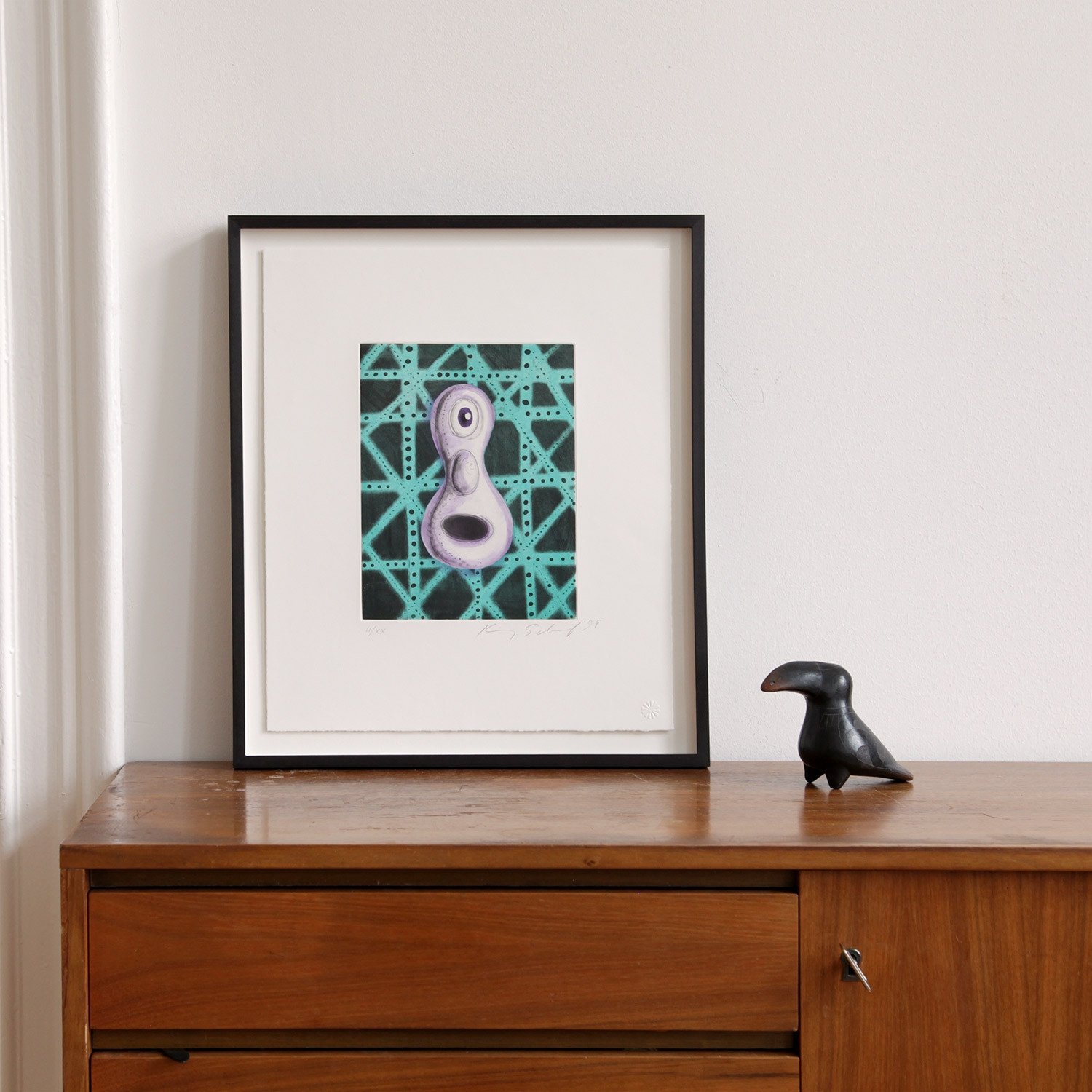 Kenny Scharf Gordi, 1998 Material 3 Farb-Radierung Edition Size 40 Measurement 17,5 x 22,5 auf 33 x 39,4 cm Auflage 40 + XX handsigniert, datiert und nummeriert Details about the frame Handgefertigter schwarz gebeizter und gewachster Ahorn-Holzrahmen, inkl. 8mm Distanzleiste, Außenmaße ca. 53,7 x 38,4 cm. Inkl. Museumsglas und rückseitiger Aufhängung, staubdicht verschlossen. The new and affordable way to buy contemporary art Strictly limited and signed art editions Limited stock From emerging talents to today’s most sought-after artists Easy and free sign-up to shop our weekly deals SIGN UP NOW Already have an account? Über die Edition In Kenny Scharfs handsignierter und nummerierter Radierung „Gordi“ schaut uns ein biomorphes, einäugiges Wesen an: Kontakt aufnehmend, fragend, bittend, staunend oder fassungslos? Das Werk des kalifornischen Künstlerstars Kenny Scharf (*1958 in Los Angeles) ist voll von popkulturellen Einflüssen und cartoonartigen Figuren. Hochemotional im Ausdruck, erzählen sie uns viel – und vieldeutig – über den Zustand unserer komplexen Gegenwart. Nehmen uns mit in den Weltraum, den Scharf in seiner Kunst immer wieder bereist: wie in den retro-futuristisch anmutenden Editionen „Orbiting“ und „Snail Nymphs“, in denen beseelte Planeten kreisen, beobachtet von Naturgeistern aus der Mythologie. In Scharfs Malereien, Skulpturen, Installationen und Performances hält alles Einzug, was auf ihn einprasselt und er aufsaugt: von Zeichentrickfiguren wie den Jetsons aus seiner Kindheit bis hin zur menschengemachten Zerstörung der Natur. Was sich davon ablagert im Unterbewusstsein, versucht Scharf anzuzapfen für seine Kunst, die er als „Pop-Surrealismus“ begreift. Über den Künstler Himmel, Hölle, Himmel ... Mit einer Schaukel bewegte sich Kenny Scharf in seiner Installation „Heaven and Hell‟ zwischen seinen Wandmalereien mit Szenen beider Extreme hin und her. Das war Anfang der 1980er Jahre im New Yorker PS1. Damals prägte er zusammen mit Keith Haring und Jean-Michel Basquiat die Kunstszene im East Village der Metropole. Die drei Künstler machten keinen Unterschied zwischen Kunst und Leben, zwischen Street Art und Fine Art. Das spiegelt sich bis heute in Scharfs ikonischen, überbordenden, knallbunten und superlebendigen Werken. Himmel, Hölle, Himmel ... – das Helle ist bei Scharf nicht ohne das Dunkle zu haben. Seine Kunst ist humorvoll, verschmitzt, aber auch kritisch bis apokalyptisch. Sie ist vollgepumpt mit der Welt – und die hält Ablenkung wie Abgründe gleichermaßen bereit. Es ist das genauso verspielte wie ernst zu nehmende Werk eines Wahrheitssuchenden, der mahnt und dabei doch kindlichen Optimismus versprüht. Scharf ist in zahlreichen Museumssammlungen vertreten, darunter das Whitney Museum of American Art und das MoMA in New York, das Museum of Contemporary Art in Los Angeles, das Stedelijk Museum in Amsterdam und das Museum Ludwig in Köln. Latest Exhibitions (Selection) „From the Street“ heißt die aktuelle Gruppenschau in der Rosenfeld Gallery in Miami, in der Werke von Kenny Scharf zusammen mit Arbeiten von Keith Haring, Jean-Michel Basquiat, Futura 2000, Banksy und KAWS zu sehen sind (bis 10. April 2022). 1985 stellte Scharf im Rahmen der Whitney Biennale erstmals im Whitney Museum of American Art in New York aus, u.a. mit John Baldessari, Barbara Kruger, Bruce Nauman und Jenny Holzer. „Celebration of the Space Age“ lautete der Titel seiner Installation, die 1979 im „Club 57“ im East Village in New York präsentiert wurde, jenem legendären Nachtclub, dem das MoMA 2018 eine eigene Ausstellung widmete. Links of Interest (Selection) Webseite von Kenny Scharf Trailer zum Dokumentarfilm „Kenny Scharf. When Worlds Collide“ (2021), benannt nach einem seiner bekanntesten Kunstwerke, das zur Sammlung des Whitney Museum of American Art in New York gehört Künstlerwebseite bei Galerie Almine Rech, Paris, Brüssel, London, New York, Shanghai Kenny Scharf im „Interview Magazine“ (2020) Discover More Art Paul Wunderlich Stillleben , 1999 Kenny Scharf Orbiting, 1998 Kenny Scharf Snail Nymphs, 1998