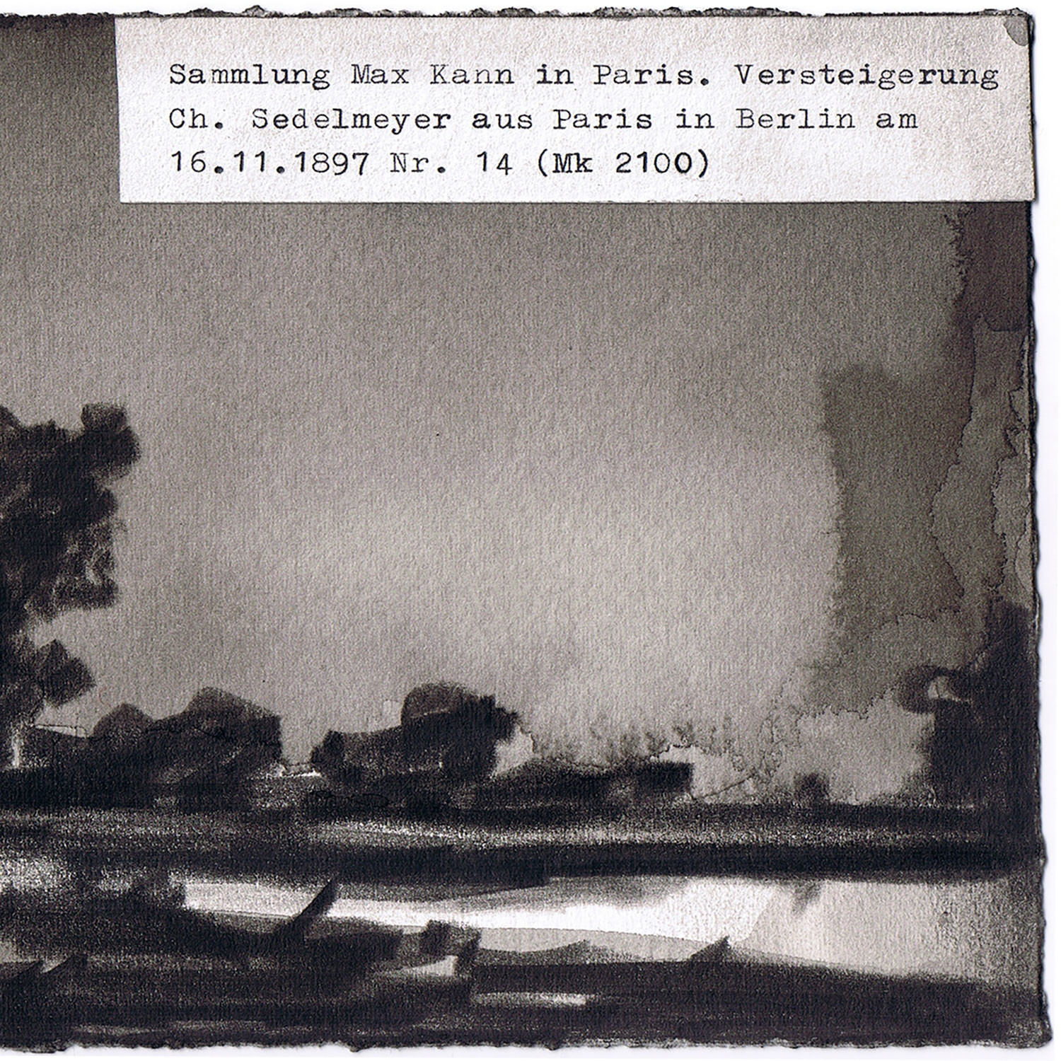 Die zwei Originalzeichnungen mit Nero-Stift gehören zu einer von van Eeden mit „Short Stories“ betitelten und auf insgesamt zehn Zeichnungen angelegten Serie. Die Bilder erzählen von Spionage und Auftragsmord wie gleichermaßen von der bildenden Kunst. Das dunkle, monochrome Kolorit verleiht den Motiven ‒ hier sind es Landschaften ‒ etwas Nostalgisches, zugleich aber auch Unheimliches. Dieses Moment der Verunsicherung wird noch gesteigert durch die Existenz von mit der Schreibmaschine geschriebenen Etiketten, die sich in ihrem Weiß wirkungsvoll von dem Schwarz der Szenerien abheben und mit ihren Texten für Verwirrung sorgen. Hier steht geschrieben: „Versteigerung Dr. P. Müller in Paris am 25.5.1910 Nr. 26 mit Abb. (ffrs 3800). Sammlung W. Mohnen in Mannheim“ bzw. „Sammlung Max Kann in Paris. Versteigerung Ch. Sedelmeyer aus Paris in Berlin am 16.11.1897 Nr. 14 (Mk 2100)“. Subtil baut van Eeden in den kleinen, assoziationsreichen Zeichnungen durch sein so eigenes Spiel aus Bild und Schrift Spannung auf.