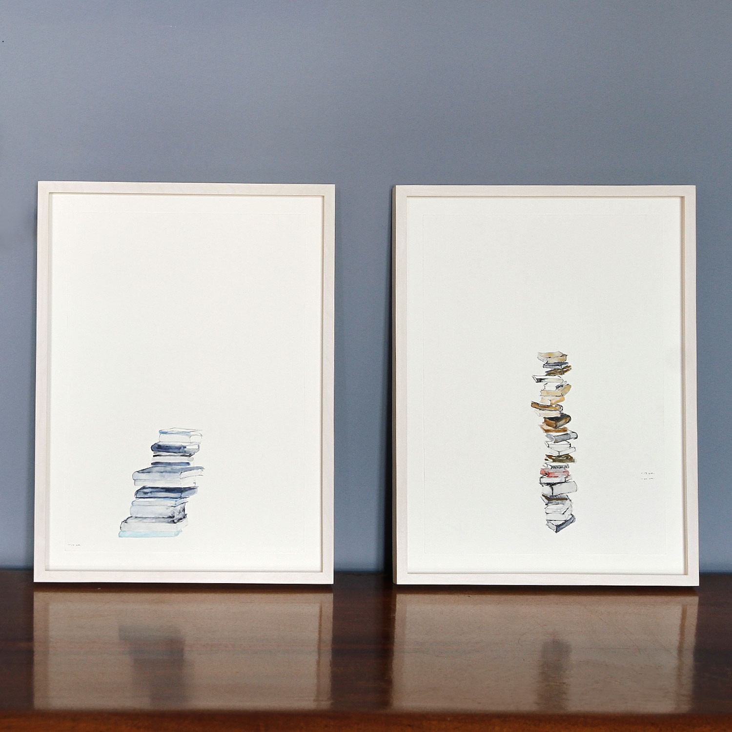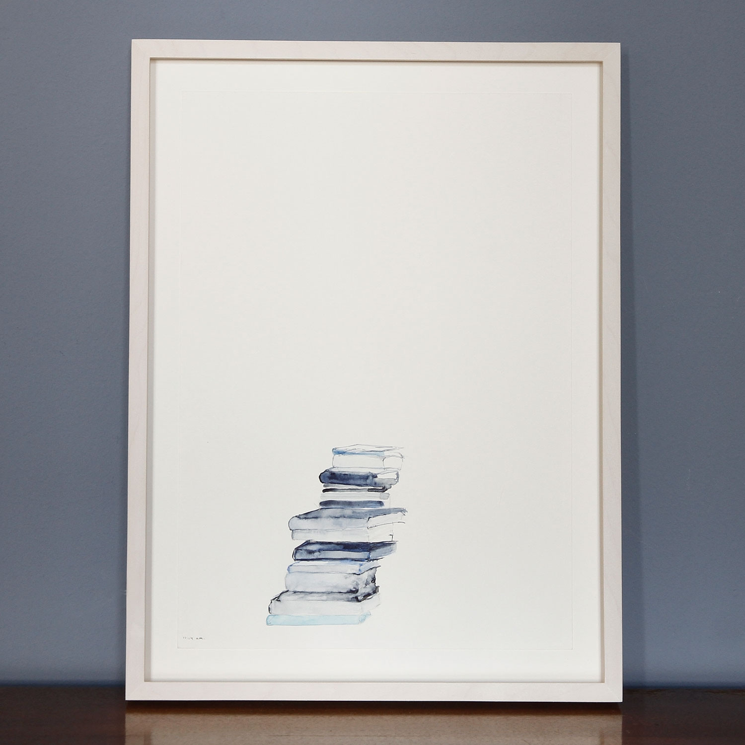 „Stacks Left Behind No 1“ und „Stacks Left Behind No 2“ heißen diese zwei zarten Aquarellarbeiten der in Los Angeles geborenen und heute wieder dort lebenden Künstlerin Marisa Mandler und wecken damit unsere Neugierde: Welche Bücher genau wurden da zurückgelassen und warum? Die Antwort bleibt uns die Künstlerin schuldig, denn die Bücherrücken tragen keine Titel. Im Fall von Nummer 2 sind sie zudem so gestapelt, dass es einem mit Blick auf die Stabilität dieses Bücherturms angst und bange werden kann. Aber vielleicht geht es der Künstlerin gar nicht um das Erzählen einer bestimmten Geschichte, sondern vielmehr um die Frage, wie sich ein Bild bzw. ein Objekt verändert, wenn wir es isoliert betrachten?