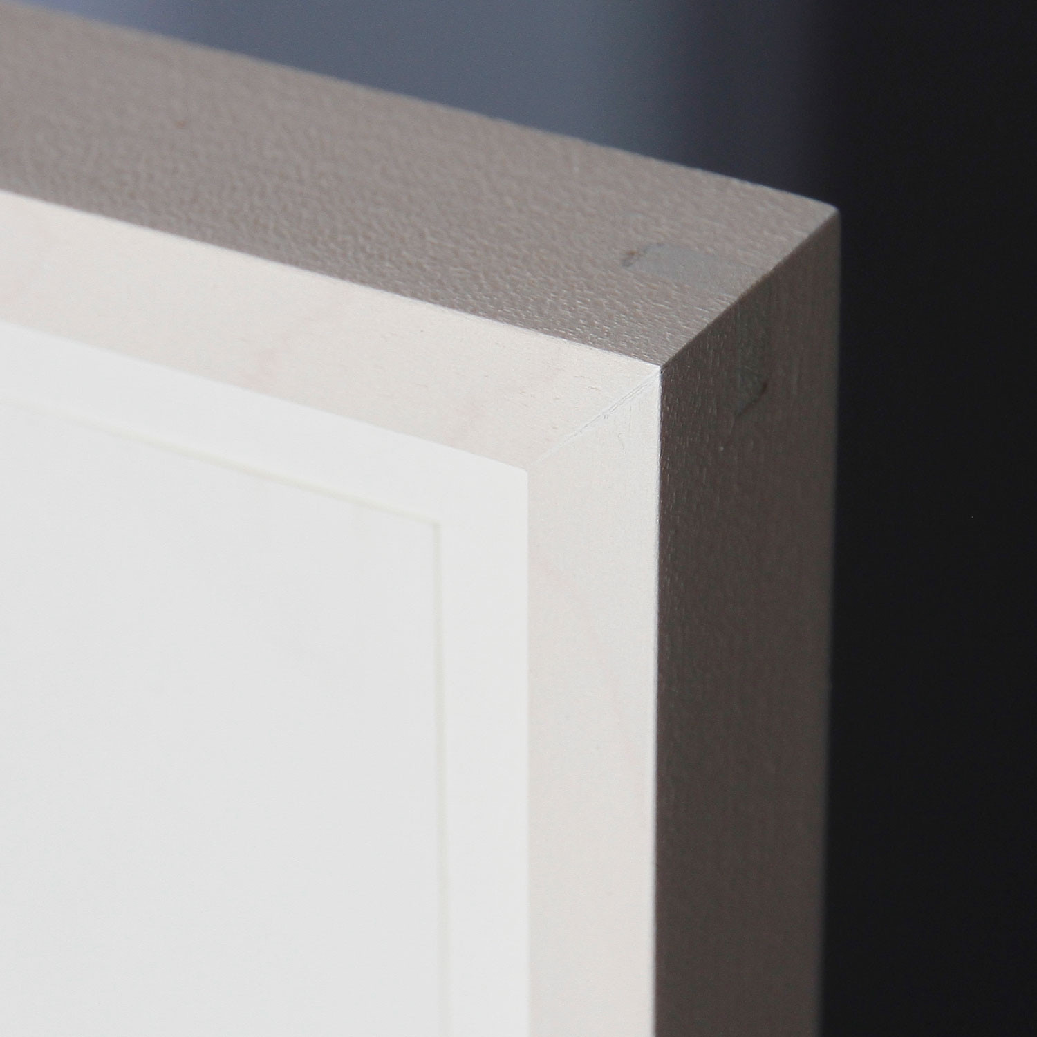 Handgefertigter, edler lasierter Ahorn-Holzrahmen mit 10mm Distanzleiste, mit den Außenmaßen 26 x 34,8 cm, inkl. rückseitiger Hängeleiste zum einfachen Aufhängen.