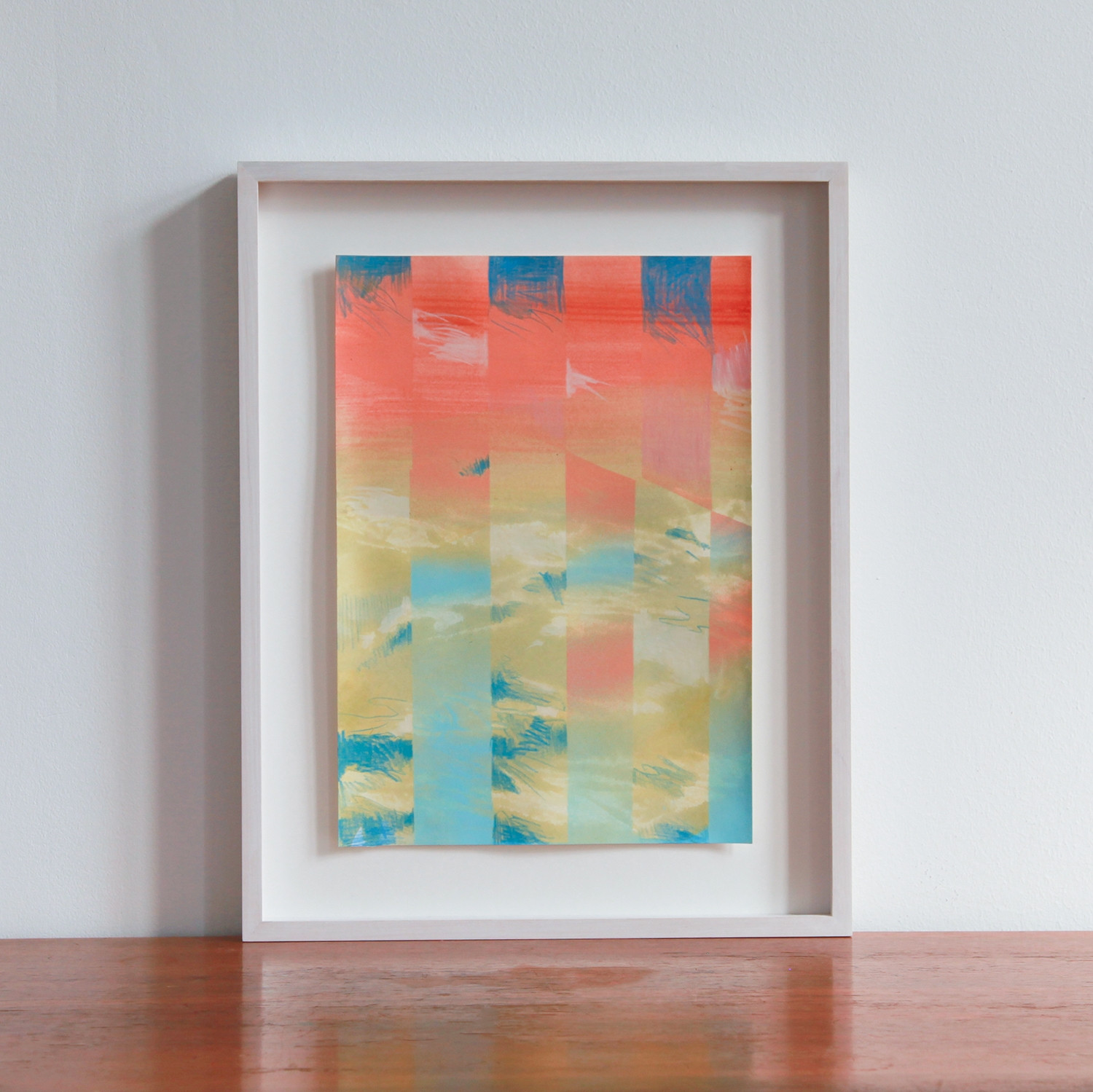 Handgefertigter weiß lasierter und gewachster Ahorn-Holzrahmen, Außenmaße ca. 38,5 x 30,2 cm. Das Werk ist hochgestellt montiert, inkl. 10mm Distanzleiste, Museumsglas sowie rückseitiger Aufhängung