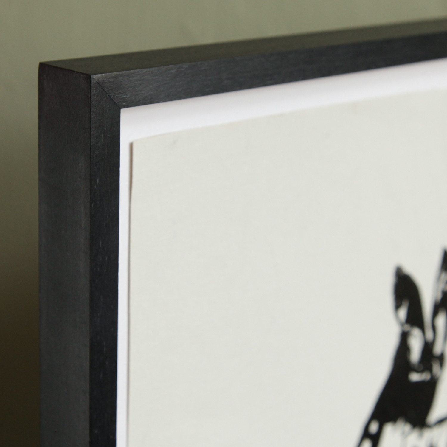 Handmade black stained and waxed maple wood frame, external dimensions of the frame approx. 57.9 x 46.7 cm, incl. 10mm spacer bar and normal glass as well as rear suspension