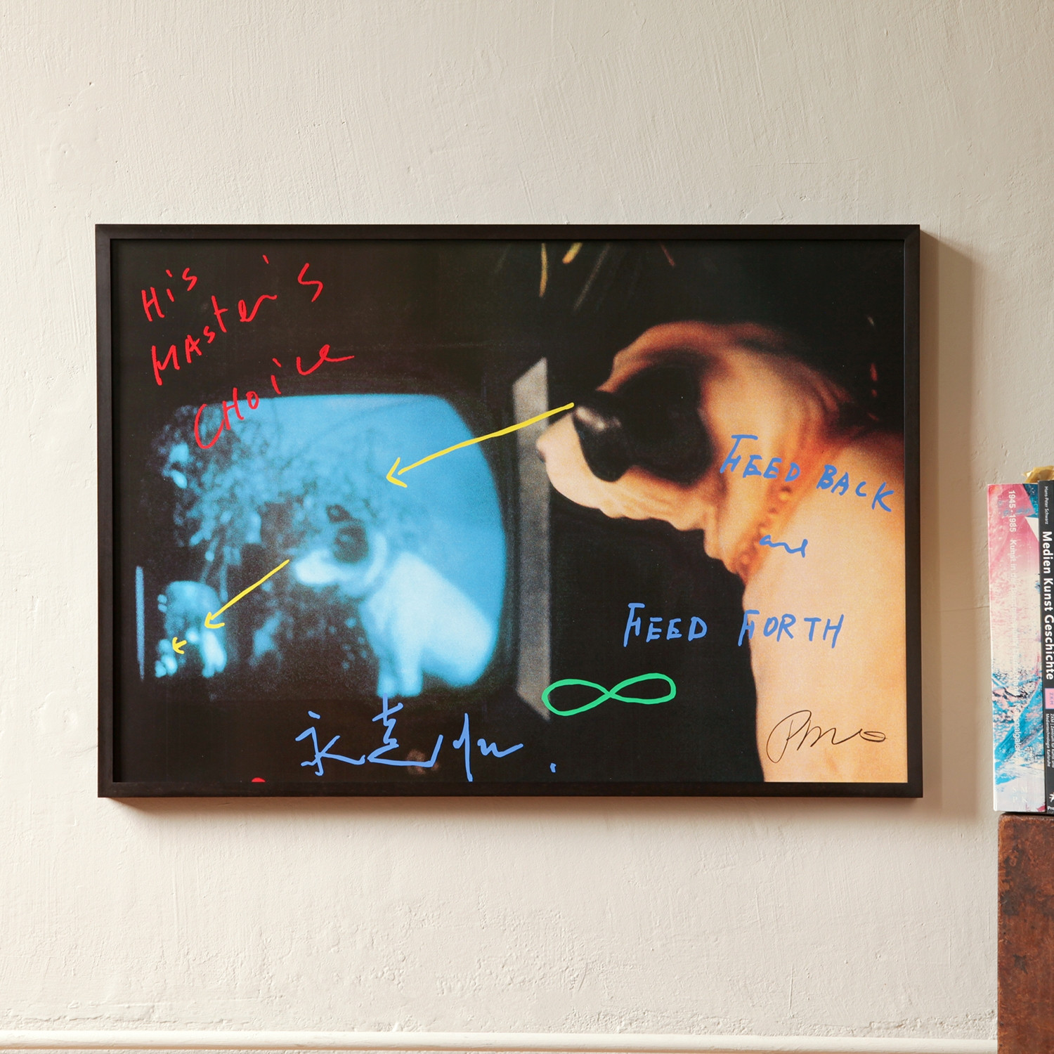 Nam June Paik TV Dog, 1994 Material Farb-Offset Siebdruck Edition Size 60 Measurement 55,4 x 82 cm Auflage 60 signiert Details about the frame Handgefertigter schwarz lasierter und gewachster Ahorn-Holzrahmen, Außenmaße ca. 57,7 x 83,0 cm, inkl. 10mm Distanzleiste und Museumsglas und rückseitiger Aufhängung The new and affordable way to buy contemporary art Strictly limited and signed art editions Limited stock From emerging talents to today’s most sought-after artists Easy and free sign-up to shop our weekly deals SIGN UP NOW Already have an account? Über die Edition Nam June Paiks meditierender, im Fernsehen sein eigenes Bild betrachtender „TV-Buddha“ (1974) ist eine Ikone der Videokunst. Schon ein Jahrzehnt früher hatte der Medienkünstler eine der ersten tragbaren Videokameras gekauft und verkündet: „Das Fernsehen hat uns ein Leben lang attackiert, jetzt schlagen wir zurück und machen unser Fernsehen selbst.“ Die TV-Monitore bevölkerten bereits früh und nachhaltig sein Werk. Neben Mensch-Maschine-Hybriden spielen auch Hunde dabei eine wichtige Rolle. So baute Nam June Paik Hundeskulpturen aus Fernsehgeräten mit Titeln wie „Watchdog“ oder „Dogmatic“ und entwickelte damit schon früh eine eindrückliche künstlerische Form, um auf die Gefahren von Überwachung und Indoktrination aufmerksam zu machen. Sein 1994 entstandener „TV Dog“, angelehnt an den berühmten „TV-Buddha“, steigert die Selbstbespiegelung ins Unendliche. Der Mensch hinter dem beliebten Haustier ist hier immer mitzudenken: Der Hinweis „His Master’s Choice“ deutet hin auf Abhängigkeitsverhältnisse und verborgene Machtstrukturen ‒ wie auch auf Paiks stets von Humor geprägte Strategien, uns mit den Fallstricken des modernen Lebens zu konfrontieren. Über den Künstler Ursprünglich begann Nam June Paik (1932‒2006) seine künstlerische Laufbahn als Komponist. Sein Lehrer Wolfgang Fortner hielt den gebürtigen Koreaner allerdings für eine „so extraordinäre Erscheinung“, dass er sich nicht für ihn zuständig fühlte und ihn an das Studio für Elektronische Musik beim WDR in Köln empfahl. Hier traf er auf Karlheinz Stockhausen und auch Joseph Beuys wurde zu seinem künstlerischen Wegbegleiter. Entscheidend war die Begegnung mit dem amerikanischen Komponisten John Cage 1958. Danach ging Nam June Paik mit seiner Aktionsmusik ganz neue Wege – und als „destruction artist“ in die Kunstgeschichte ein. „Das Klavier ist ein Tabu. Es muss zerstört werden.“ Das ist so ein Paik-Satz aus dieser Zeit. Dazu gehören auch seine Experimente mit neuen Technologien, er gilt nicht zuletzt als Pionier der Videokunst. „Ich wollte das Fernsehen zu einer Kunstform erheben, die ebenso hoch geschätzt wird wie die Musik von Johann Sebastian Bach“, sagte er rückblickend auf sein reiches und vielbeachtetes Werk. Nam June Paik vertrat Deutschland 1993 gemeinsam mit Hans Haacke auf der Biennale in Venedig und gewann den Goldenen Löwen für den besten Länderpavillon. Die Werke des Künstlers sind in zahlreichen Sammlungen zu sehen, u.a. im LACMA ‒ Los Angeles County Museum of Art, dem Centre Georges Pompidou, Paris, dem Hamburger Bahnhof ‒ Museum für Gegenwart ‒ Berlin sowie dem Düsseldorfer K21. Latest Exhibitions (Selection) Nam June Paik ‒ Art in Process: Part One, Gagosian Gallery, New York (2022) Writing the History of the Future, Die Sammlung des ZKM, Karlsruhe (2022) Nam June Paik, San Francisco Museum of Modern Art (SFMOMA), San Francisco (2021) Look at This, Pinakothek der Moderne, München (2021) Einen Überblick über die Ausstellungsvita von Nam June Paik finden Sie hier: Links of Interest (Selection) Webseite zum Vermächtnis des Künstlers Kunst von Nam June Paik auf „UbuWeb“ Nachruf in der „taz“ (2006) „Spiegel“-Interview mit Nam June Paik (2000) Website der Sydney Biennale 1990 Discover More Art John Cage Mozart Mix, 1991 Nam June Paik Fluxband, 1985 Christo & Jeanne-Claude Package on a Hunt, 1988 Wolf Vostell Klammerbuch, 1966