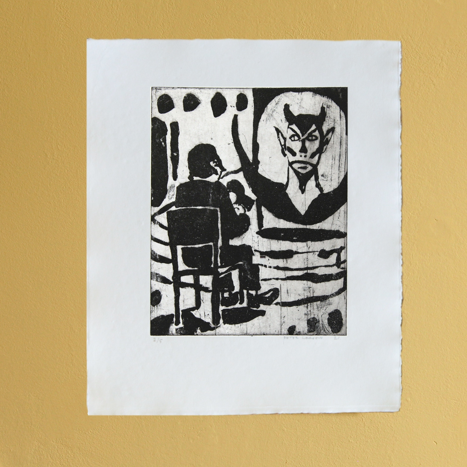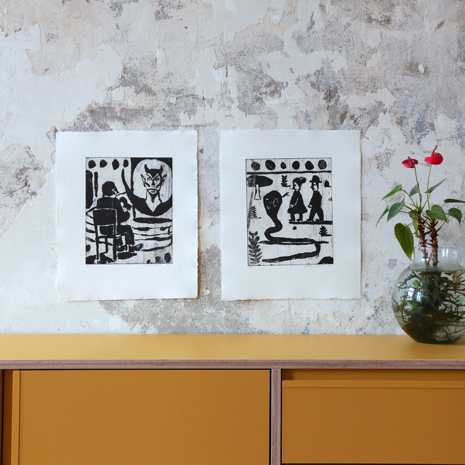 Peter Larsen Ohne Titel (1), 2021 Material Linoldruck auf 300 g bkf Rives Bütten Papier Edition Size 50 Measurement 32,5 x 38 cm Auflage 5 vorderseitig signiert, nummeriert und datiert Details about the frame Handgefertigter, schwarz gewachster Ahorn-Holzrahmen, 10mm Distanzleiste, Außenmaße ca. 37,7 x 44,2 cm, inkl. Normalglas und rückseitiger Aufhängung The new and affordable way to buy contemporary art Strictly limited and signed art editions Limited stock From emerging talents to today’s most sought-after artists Easy and free sign-up to shop our weekly deals SIGN UP NOW Already have an account? Über den Künstler und die Edition „Somehow caught between two worlds, as if awake but stuck in a dream“, so beschreibt die Kopenhagener Galerie Bricks die Werke von Peter Larsen. Und tatsächlich entführen uns die vier signierten und nummerierten Schwarz-Weiß-Linoldrucke „o.T.“ (2021) des dänischen Künstlers in surreale Bilderwelten. Der Teufel, die Schlange, die Chimäre oder auch der Mond und ein Augenpaar – Larsens Arbeiten sind kunstgeschichtlich und mythologisch aufgeladen. Darüber gelingt ihnen ein wundersamer Spagat: Die figurativen Szenen wirken gleichermaßen aus der Zeit gefallen wie absolut gegenwärtig. Menschheitsthemen werden hier verhandelt, mehr noch: alles, was zwischen Himmel, Hölle und Erde passt. Dabei ist Larsen auch ein Meister der Form, der sich allerdings nie in seinem Können verliert, weil er um die Kraft unserer Gedanken weiß. Peter Larsen graduierte 2013 an der Royal Danish Academy of Fine Arts. Seine Werke sind in zahlreichen Einzel- und Gruppenausstellungen in Dänemark wie auch auf internationaler Ebene u.a. in London und Belgrad zu sehen. Latest Exhibitions (Selection) Aktuell sind Werke Peter Larsens in einer Doppelausstellung mit Mugi Takei in der Galerie Pulp in Holyoke (Mass.) zu sehen. Zudem werden Arbeiten von ihm derzeit unter dem Titel „Why the Long Face“ bei FRMD in London gezeigt. „Hocus Pocus Therapy“ hieß die Soloschau des Künstlers, die 2022 in der Galerie Bricks in Kopenhagen stattfand. Links of Interest (Selection) Instagram-Account des Künstlers Künstlerseite von Peter Larsen bei Galerie Bricks, Kopenhagen Discover More Art Christiane Wöhler Möwenmädchen, 2013 Rose Wylie Things around the house IV, 2016 Juan de la Rica Saltadora, 2022 Bettina Krieg EASE, 2022 Peter Larsen Ohne Titel (2), 2021 Peter Larsen Ohne Titel (3), 2021 Peter Larsen Ohne Titel (4), 2021 Peter Larsen Ohne Titel (5), 2021 Peter Larsen Ohne Titel (6), 2021
