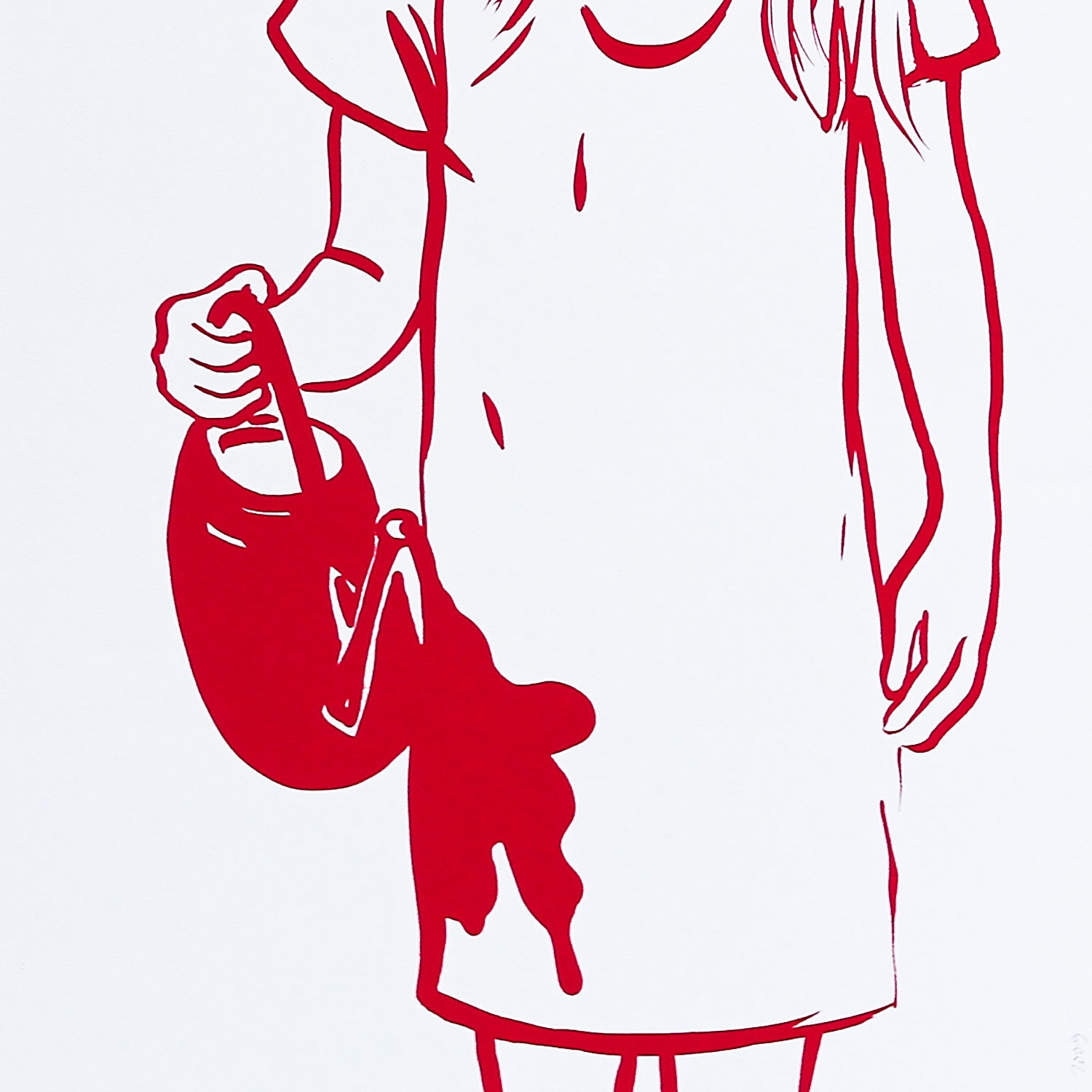 „Rougir“, deutsch „erröten“, so heißt eine ganze Serie von Siebdrucken der Künstlerin Françoise Pétrovitch. Mit der Grundfarbe Rot, einer Farbe, die Emotionen und Gefahr symbolisiert, wurde diese Arbeit gedruckt. Weiß ist die zweite Hauptfarbe des Bildes, nicht nur als Hintergrund.