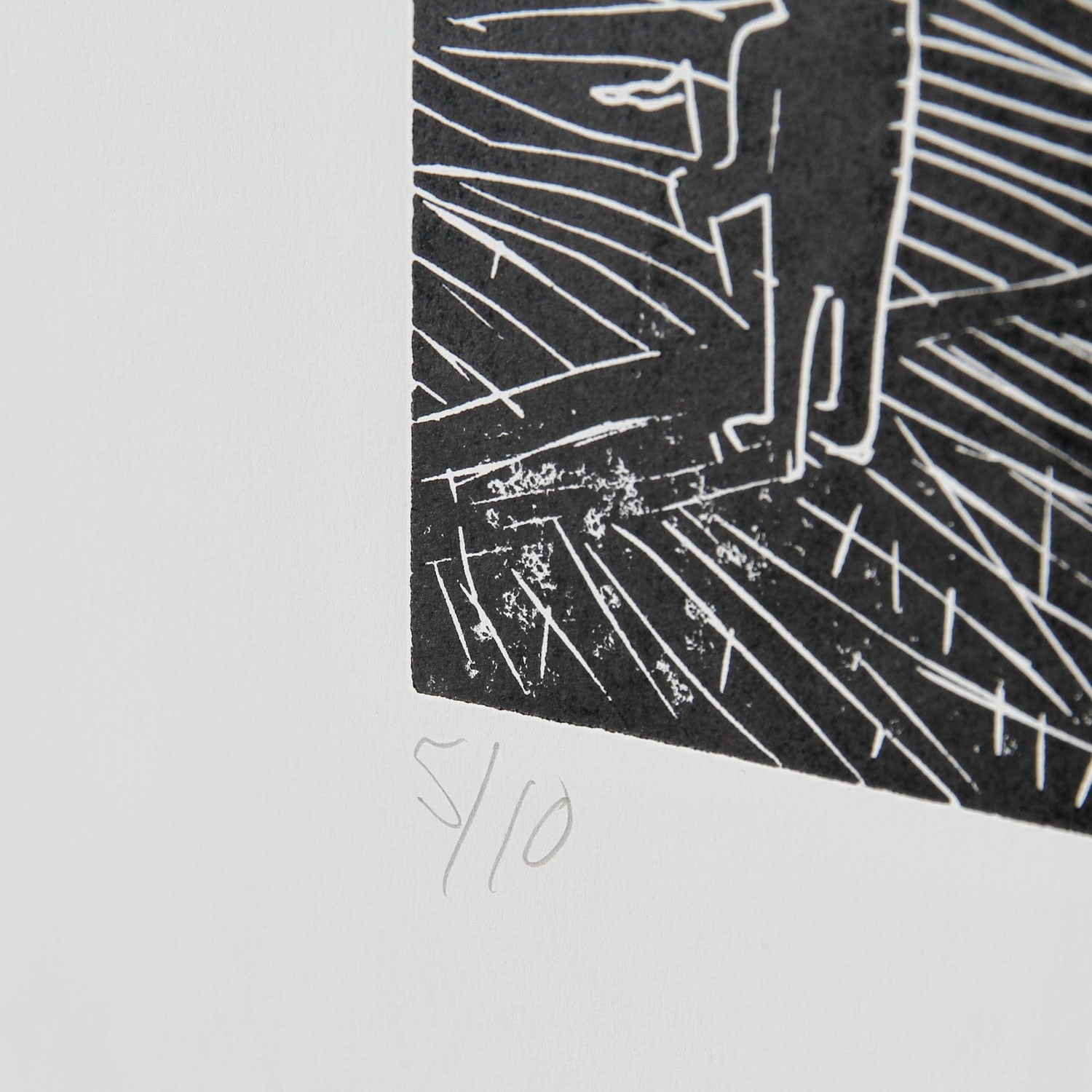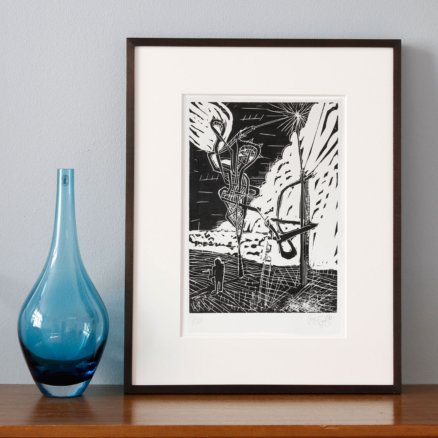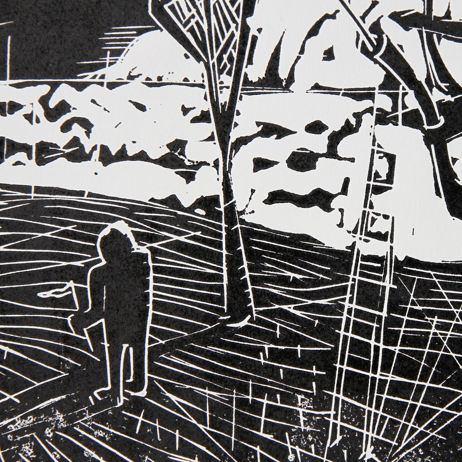 Merkwürdige Wesen und Maschinen bevölkern die apokalyptisch anmutenden Landschaften in seinen handsignierten Linolschnitten, die Werke mit einem großen Erzählpotenzial sind. Grözinger selbst beschreibt den künstlerischen Schaffensprozess als eine Reise nach innen: „Ich muss meinen Weg erfühlen, als wäre ich in einem Labyrinth“, so der Künstler in einem „artfridge“-Interview. „Dieses Den-Weg-Erfühlen ist es, was mir das größte Vergnügen bereitet.“
