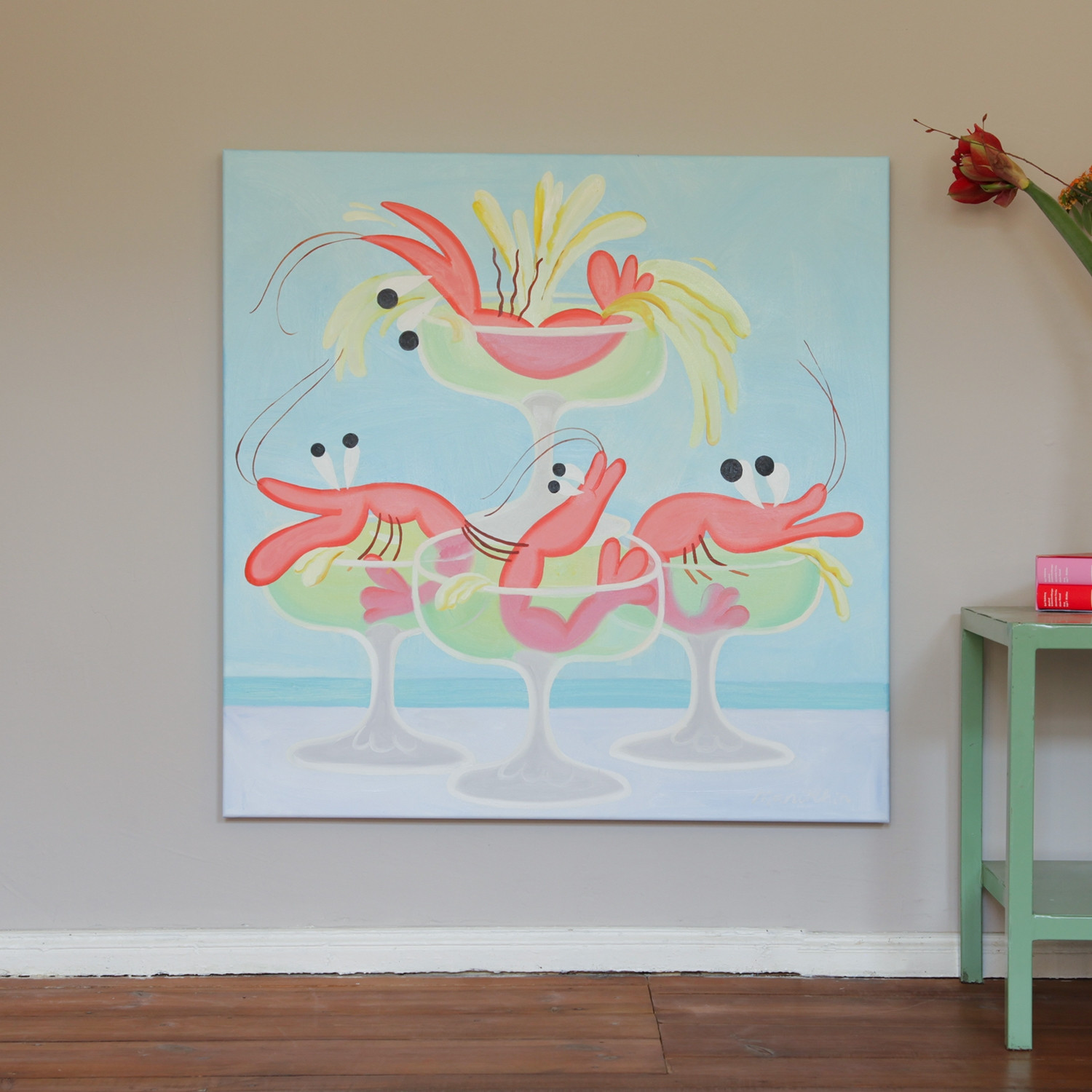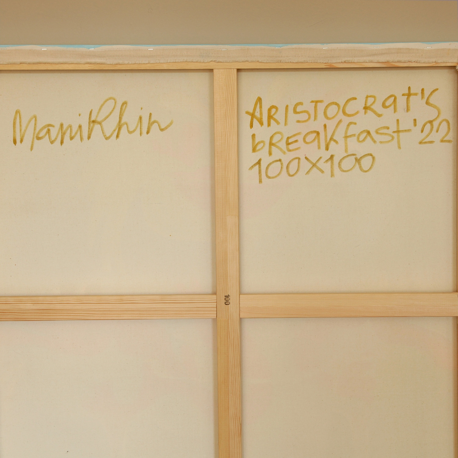 Das Bild „Aristocrat’s Breakfast“ ist in Motiv und Farbpalette ein typischer Manikhin und gleichzeitig ein besonderes Einzelstück. Es geht mit ironischer Ambivalenz noch über die Serie „Hummer gehen“ aus dem Jahr 2020 hinaus, auf der sich die zum Verzehr bestimmten Schalentiere noch halb rebellisch aus den präsentierten Gefäßen herausstehlen. Hier scheinen die Hummer genüsslich das Büffet übernommen zu haben, baden im Champagner und drehen den Spieß um, indem sie vom Objekt zum Akteur werden. Manikhin spielt hier so zugänglich wie klug mit den Formen des klassischen Stilllebens, das hier zur Freude des Betrachters aus der akademischen Tradition humorvoll zum Leben erwacht.