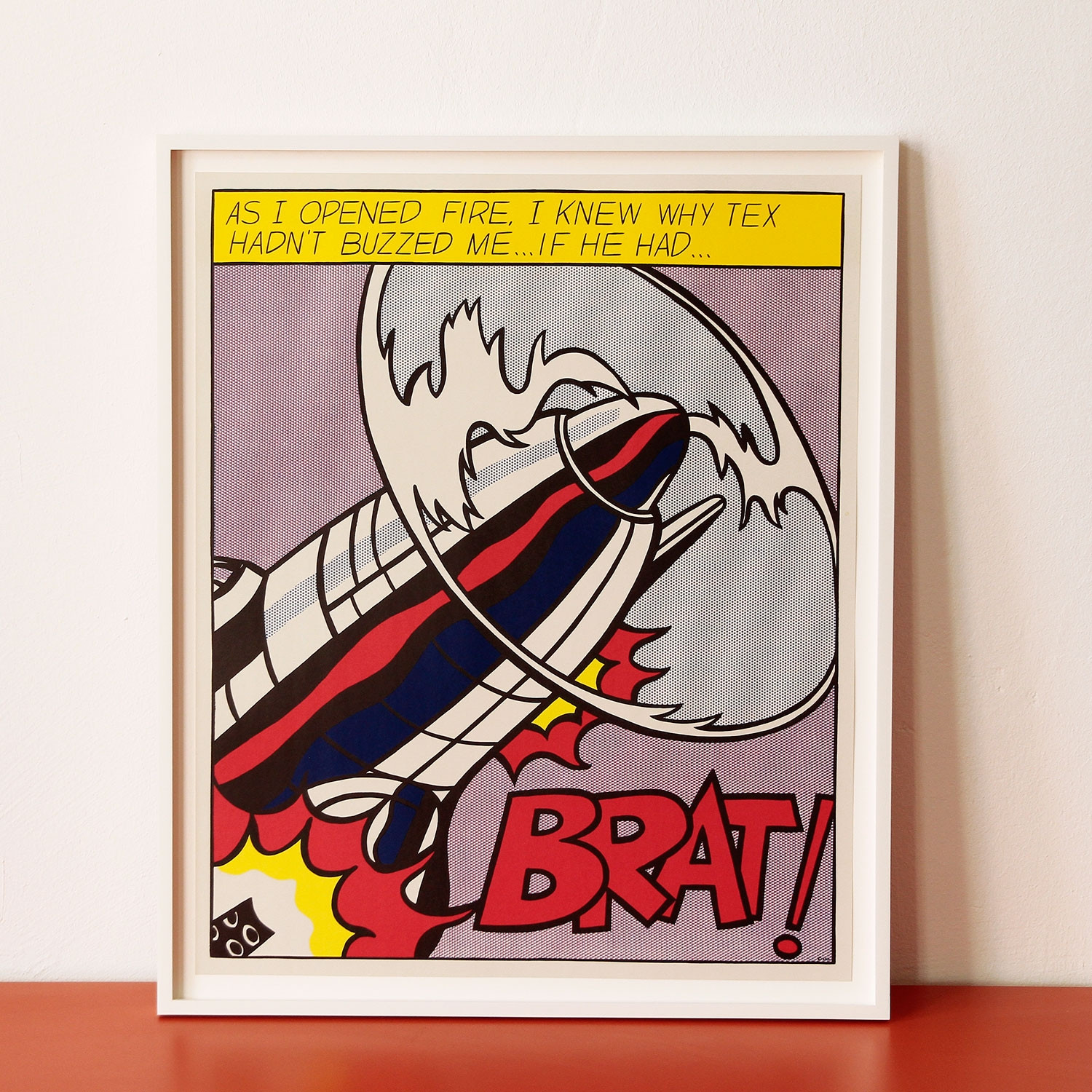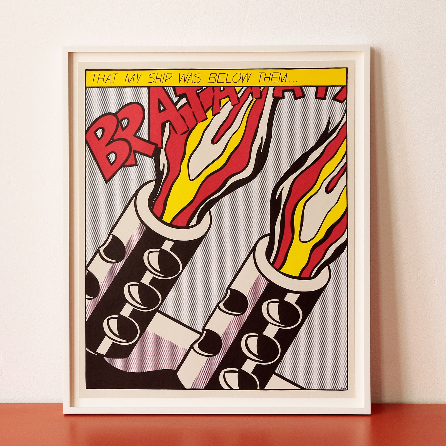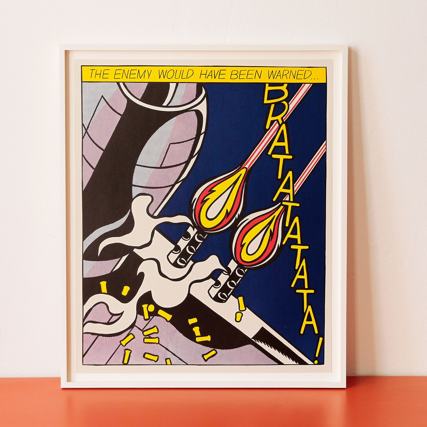 Roy Lichtenstein As I Opened the Fire, 1964 / 2000 Material Farb-Offset-Lithografie auf Karton Production Method unsignierte Auflage verlegt vom Stedelijk Museum, Amsterdam Edition Size 3000 Measurement 64 x 53 cm Triptychon, Set bestehend aus 3 einzelnen Blättern Details about the frame Der Rahmenpreis inkludiert 3 handgearbeitete Holzrahmen (Triptychon) mit 10mm Distanzleiste, Normalglas, Maße je 57,9 x 69,4 cm, staubdicht verschlossen, inkl. rückseitiger Aufhängung. The new and affordable way to buy contemporary art Strictly limited and signed art editions Limited stock From emerging talents to today’s most sought-after artists Easy and free sign-up to shop our weekly deals SIGN UP NOW Already have an account? Über die Edition „A minor purpose of my war paintings is to put military aggressiveness in an absurd light‟, sagte Roy Lichtenstein einmal – und die Offset-Lithografie aus dem Jahr 1964 (Reprint 2000) löst diesen Anspruch ein. Der 1923 in New York geborene Künstler (gest. 1997) wurde 1943 zum Militärdienst einberufen und zwei Jahre später in den Krieg nach Europa geschickt. Der originale Siebdruck gilt als eines seiner kritischsten Werke. Über den Künstler Wer ist Freund, wer ist Feind? Wer hier spricht, das ist auf Roy Lichtensteins nach „Whaam!“ berühmtestem Kriegsbild nicht ganz klar. „As I Opened the Fire“ ist ein Triptychon, das wenige Sekunden zweier Kampfflugzeuge während der Schlacht zeigt. Das erste und das letzte der einem DC Comic mit dem Titel „All American Men of War“ nachempfundenen Panels vertauschte der gefeierte Pop-Art-Künstler, was das Verständnis dieser kurzen Episode zusätzlich erschwert. „As I Opened the Fire“ steht für Lichtensteins Vorliebe für Cartoons und Comics zu Beginn seiner Karriere und den Rückgriff auf die Populärkultur, mit der er und seine Weggenossen die bildende Kunst revolutionieren sollten. Latest Exhibitions (Selection) 1962 erste Ausstellung der Comicwerke in der New Yorker Leo Castelli Gallery, einer der wichtigsten Adressen für zeitgenössische Kunst zu dieser Zeit; Lichtenstein verkauft alle Arbeiten und die Schau macht ihn berühmt. 1968 erste Retrospektive in Europa im Stedelijk Museum in Amsterdam. 1969 erste große Werkschau in New York im Solomon R. Guggenheim Museum. Danach bis heute vielfältigst in nationalen und internationalen Ausstellungen vertreten, Beispiele seines Schaffens finden sich zudem in den wichtigsten Sammlungen zeitgenössischer Kunst weltweit. Links of Interest (Selection) Das 170 x 430 cm große Original in Öl und Acryl (Magna) auf Leinwand von „As I Opened Fire“ ist im Besitz des Stedelijk Museum in Amsterdam – hier die Werkbeschreibung Webseite der Roy Lichtenstein Foundation Discover More Art Roy Lichtenstein Big Painting No. 6, 2000 Joachim Lambrechts 2 alligators resting on the shore after breakfast - blue, 2021/2022 Bianca Kennedy Serie "Portraits of Taking a Bath in Movies": Curly Sue, 2022