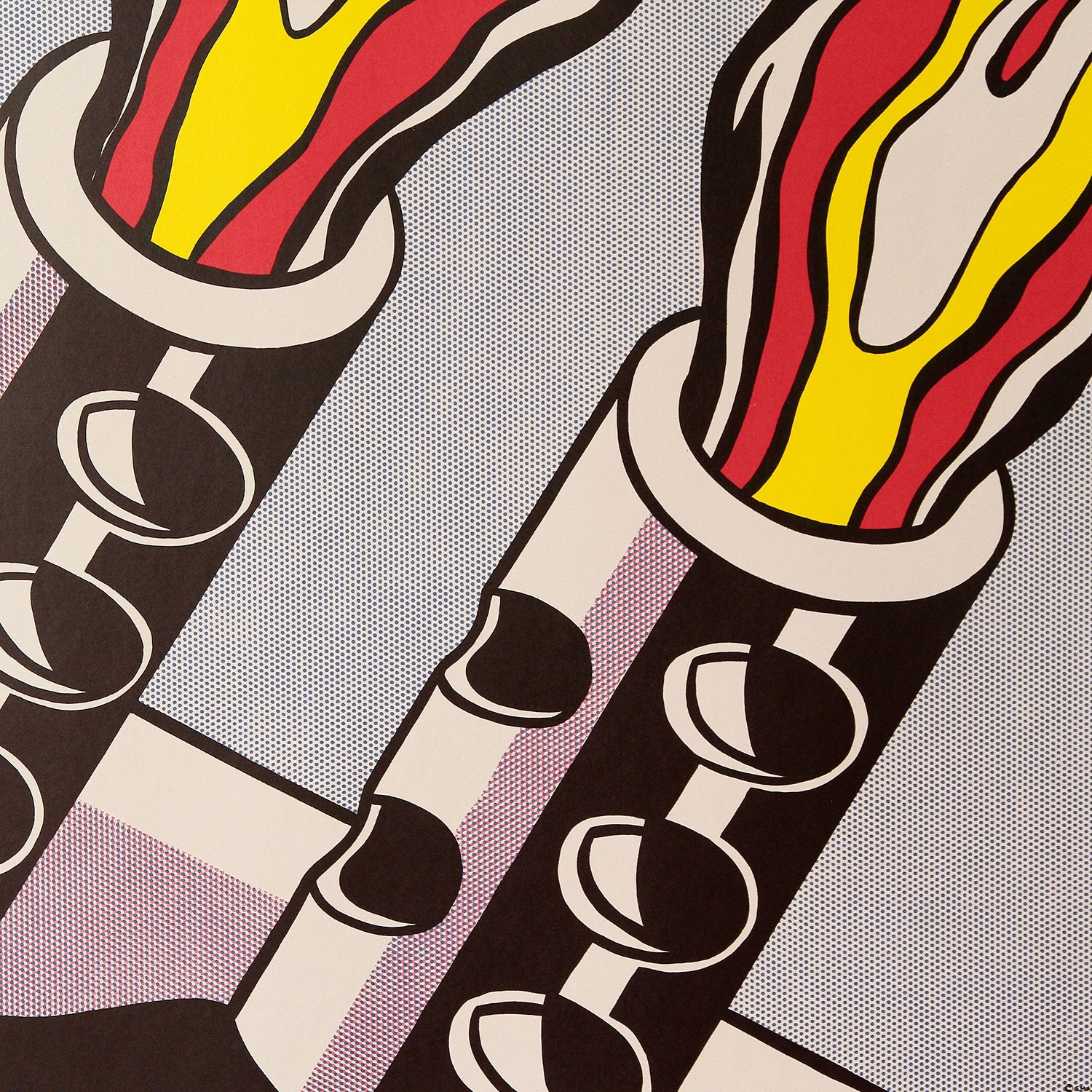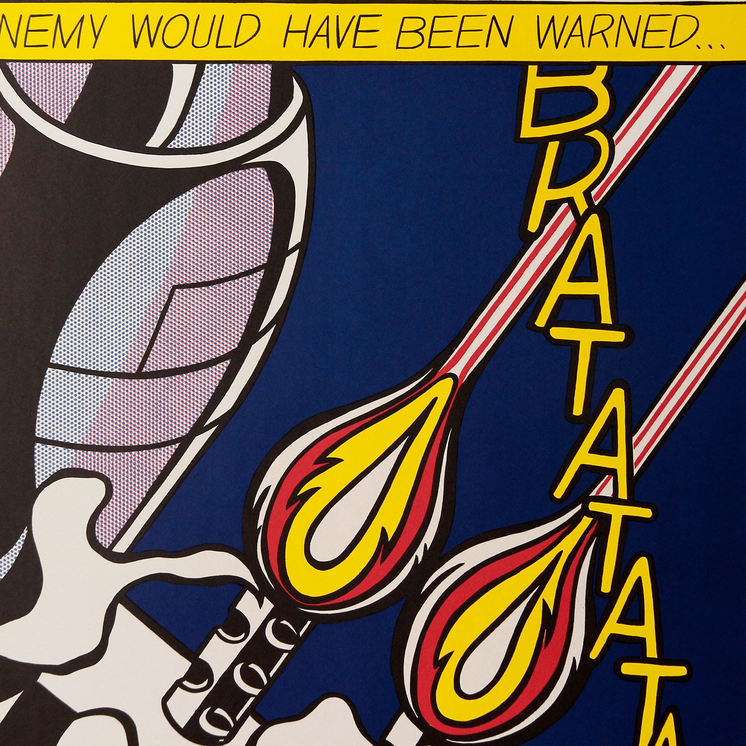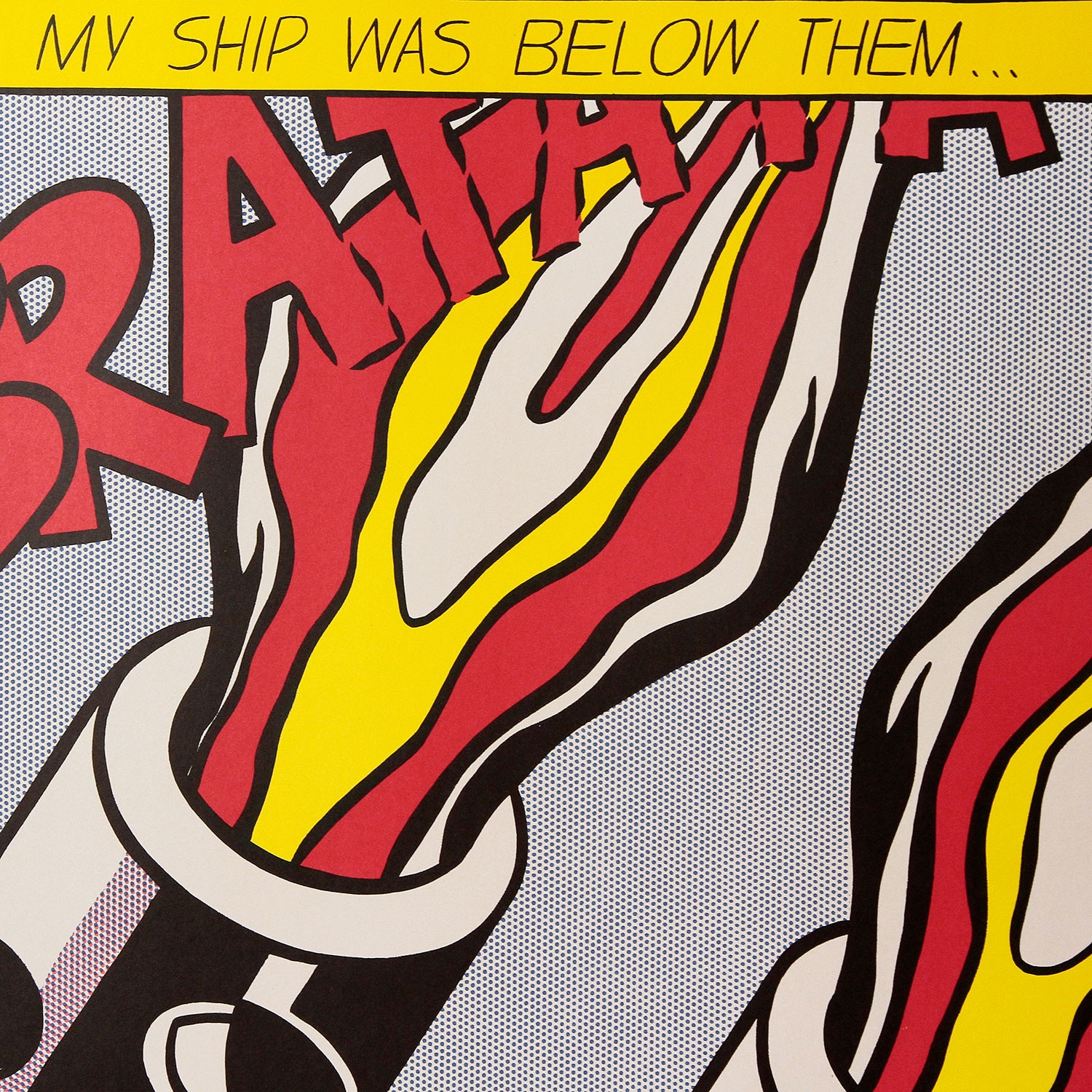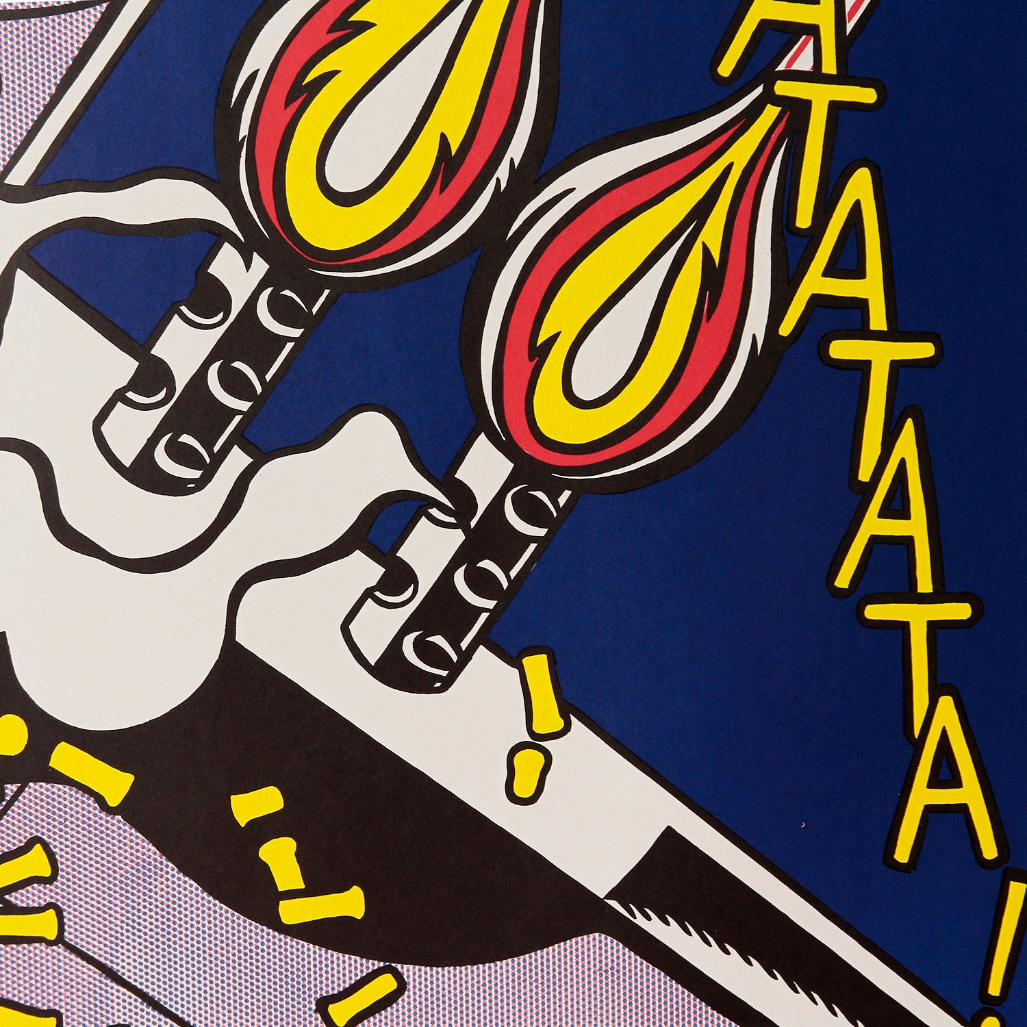 Roy Lichtenstein As I Opened the Fire, 1964 / 2000 Material Farb-Offset-Lithografie auf Karton Production Method unsignierte Auflage verlegt vom Stedelijk Museum, Amsterdam Edition Size 3000 Measurement 64 x 53 cm Triptychon, Set bestehend aus 3 einzelnen Blättern Details about the frame Der Rahmenpreis inkludiert 3 handgearbeitete Holzrahmen (Triptychon) mit 10mm Distanzleiste, Normalglas, Maße je 57,9 x 69,4 cm, staubdicht verschlossen, inkl. rückseitiger Aufhängung. The new and affordable way to buy contemporary art Strictly limited and signed art editions Limited stock From emerging talents to today’s most sought-after artists Easy and free sign-up to shop our weekly deals SIGN UP NOW Already have an account? Über die Edition „A minor purpose of my war paintings is to put military aggressiveness in an absurd light‟, sagte Roy Lichtenstein einmal – und die Offset-Lithografie aus dem Jahr 1964 (Reprint 2000) löst diesen Anspruch ein. Der 1923 in New York geborene Künstler (gest. 1997) wurde 1943 zum Militärdienst einberufen und zwei Jahre später in den Krieg nach Europa geschickt. Der originale Siebdruck gilt als eines seiner kritischsten Werke. Über den Künstler Wer ist Freund, wer ist Feind? Wer hier spricht, das ist auf Roy Lichtensteins nach „Whaam!“ berühmtestem Kriegsbild nicht ganz klar. „As I Opened the Fire“ ist ein Triptychon, das wenige Sekunden zweier Kampfflugzeuge während der Schlacht zeigt. Das erste und das letzte der einem DC Comic mit dem Titel „All American Men of War“ nachempfundenen Panels vertauschte der gefeierte Pop-Art-Künstler, was das Verständnis dieser kurzen Episode zusätzlich erschwert. „As I Opened the Fire“ steht für Lichtensteins Vorliebe für Cartoons und Comics zu Beginn seiner Karriere und den Rückgriff auf die Populärkultur, mit der er und seine Weggenossen die bildende Kunst revolutionieren sollten. Latest Exhibitions (Selection) 1962 erste Ausstellung der Comicwerke in der New Yorker Leo Castelli Gallery, einer der wichtigsten Adressen für zeitgenössische Kunst zu dieser Zeit; Lichtenstein verkauft alle Arbeiten und die Schau macht ihn berühmt. 1968 erste Retrospektive in Europa im Stedelijk Museum in Amsterdam. 1969 erste große Werkschau in New York im Solomon R. Guggenheim Museum. Danach bis heute vielfältigst in nationalen und internationalen Ausstellungen vertreten, Beispiele seines Schaffens finden sich zudem in den wichtigsten Sammlungen zeitgenössischer Kunst weltweit. Links of Interest (Selection) Das 170 x 430 cm große Original in Öl und Acryl (Magna) auf Leinwand von „As I Opened Fire“ ist im Besitz des Stedelijk Museum in Amsterdam – hier die Werkbeschreibung Webseite der Roy Lichtenstein Foundation Discover More Art Roy Lichtenstein Big Painting No. 6, 2000 Joachim Lambrechts 2 alligators resting on the shore after breakfast - blue, 2021/2022 Bianca Kennedy Serie "Portraits of Taking a Bath in Movies": Curly Sue, 2022