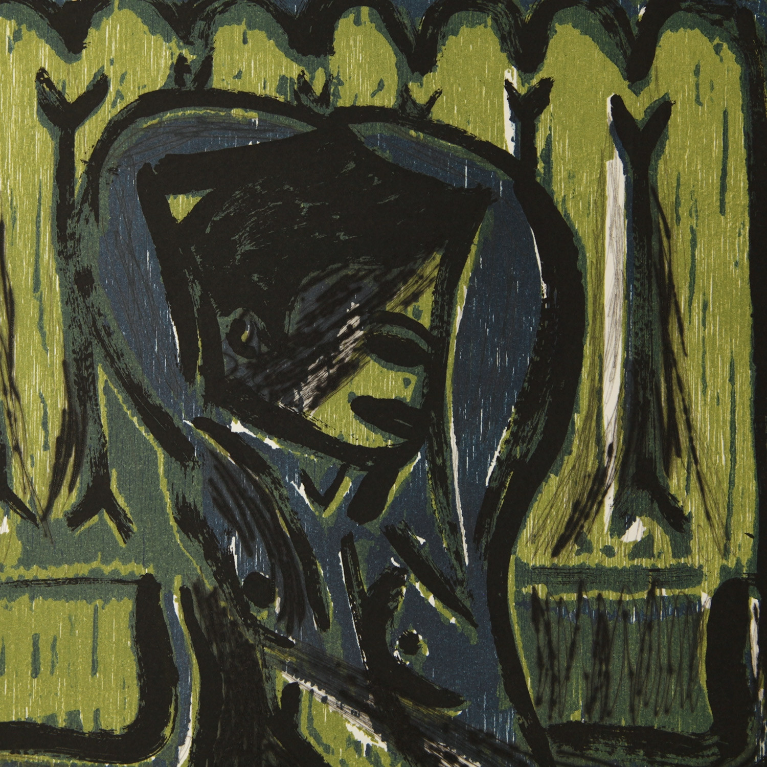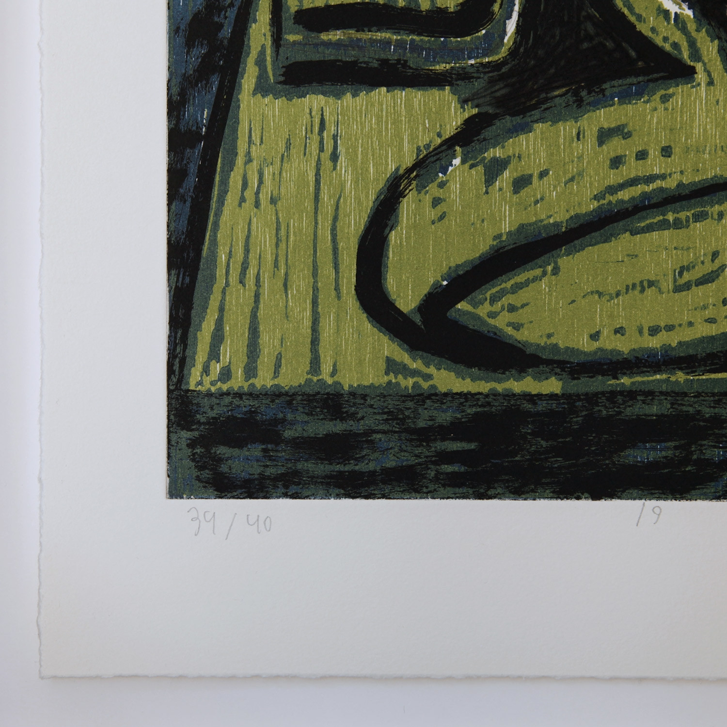 Frühere Holzschnitte von Tal R entstanden schon mal aus selbst geschnitzten Blöcken aus gebrauchten Küchenschneidebrettern von Flohmärkten, wie der Künstler vor einigen Jahren in einem Interview ausführte. „Und wir bringen die Farbe von Hand mit einem Löffel auf, das ist ein sehr langwieriger Prozess, bei dem man dem Unerwarteten viel Raum gibt“, so Tal R weiter. Perfektion ist also nicht, wonach der in Kopenhagen lebende und arbeitende Maler strebt. Der Bildaufbau jedoch ist streng, die Motive seiner „: tingsted‟-Serie sind klassisch. Tal R bezieht sich darin auf Menschen, die er kennt, auf Objekte, zu denen er eine persönliche Verbindung hat. Und Intimität strahlen diese Werke tatsächlich aus: der uns Betrachter*innen zugewandte weibliche Akt, der mit Blumen und Vase geschmückte private Raum, die Figur mit dem uns fixierenden Blick. Den Doppelpunkt – hier Teil des Titels der Werkreihe – benutzt Tal R, um die Beziehung zwischen Vergangenheit, Gegenwart und Zukunft zu illustrieren. Und auch sein Stillleben erzählt von der verstreichenden Zeit. „Sobald du die Blumen pflückst, weißt du, dass sie sterben werden“, sagt Tal R. Vielleicht berührt uns ihre Schönheit genau deshalb umso mehr. Herausgeber BORCH Editions Kopenhagen / Berlin