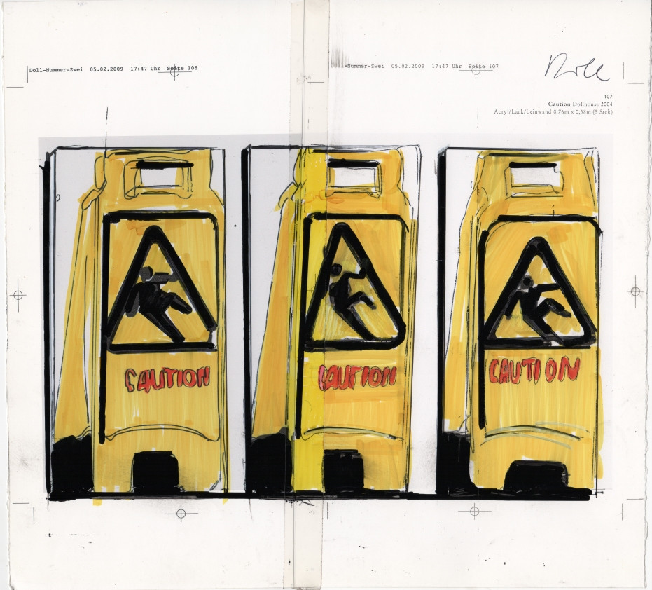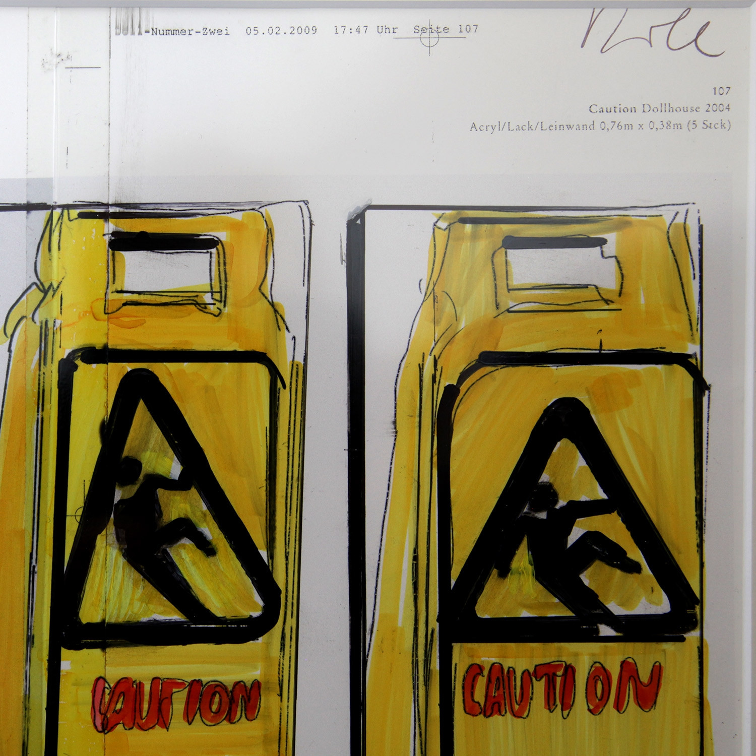 Tatjana Doll Nr. 107, Caution Dollhouse , 2006/2021 Material Gescannte Handzeichnung, ausgedruckt als Katalogproof, weitergezeichnet, bemalt und handbearbeitet Edition Size 1 Measurement ca. 31,2 x 41 cm handsigniert inkl. Katalog: Tatjana Doll, DOLL, 2005, anlässl. der Ausstellung "Bier Für Öl + Ein Blinder Passagier" im Kunstverein Bremerhaven, 2005 Details about the frame Inkl. HALBE-Rahmen in Silber + Passepartout, Größe ca. 32 x 42 cm The new and affordable way to buy contemporary art Strictly limited and signed art editions Limited stock From emerging talents to today’s most sought-after artists Easy and free sign-up to shop our weekly deals SIGN UP NOW Already have an account? Über die Werke Der rote Ferrari ist auch eins der Motive in den Unikaten, die auf der Grundlage des Katalogs „DOLL“ aus dem Jahr 2005 entstanden sind. Darin sehen wir Tatjana Dolls Malereien in Form von Collagen in den städtischen Raum montiert. Die linearen Edding-Zeichnungen stammen aus dem Jahr darauf, zunächst waren sie gedacht als Wiederholung des Gedruckten in Schwarz-Weiß, wurden dann gescannt und wiederum als Print aufs Papier gebracht. Die Künstlerin hat sie später manuell durch malerisch-farbige Flächen ergänzt. Zudem holte sie den urbanen Raum dieses Mal in die Zeichnung und die Malerei hinein. „So, als wäre er wie die Malereien, die darin platziert sind, genauso ausgedacht“, erklärt Doll. Wer sich auf ihre Arbeiten einlässt, sollte sich also wappnen für das Wechselspiel zwischen Kunst und Wirklichkeit. „Die Piktogrammschilder ‚Caution‘ habe ich gemalt, um vor meinen eigenen Bildern zu warnen“, sagt sie auch. Die Warnung lässt sich aber ebenso als Aufforderung verstehen, die eigene Vorstellungskraft mindestens so wichtig zu nehmen wie die vorformulierten visuellen Erzählungen, von denen wir umgeben sind. Tatjana Dolls mutiges Werk macht vor, wie das geht. Über die Künstlerin Der Malerei traut Tatjana Doll einiges zu. „Wenn ich einen Ferrari male, dann sollte es so sein, als öffnete ich eine große Lackdose und er würde zu einem Auto schon in dem Moment, in dem ich den Lack auf die Leinwand gieße, nicht durch Ingenieurskenntnisse, sondern einfach durch das Material und die Farbe“, sagt die Künstlerin. Die Grenze zwischen Abbild und Wirklichkeit zieht sie nicht entlang der materiellen Realität. Oft übersteigt die Größe der Alltagsgegenstände in ihrer Kunst die ‚wahren‘ Maße bei Weitem. Genauso wie die Symbolkraft eines Ferraris seine Funktion als Rennwagen und Automobil bei Weitem übertrifft. „Ich wollte malen, was da ist“, erklärt Doll und holt auf diese Weise eine Welt in die Kunst, die uns alle umgibt. Bei Doll ist der Schaffensprozess als ein Akt der subjektiven Aneignung zu verstehen, der Gegenstand an sich tritt hinter das Bild zurück. Möglich also, dass wir in dem LKW-Rücklicht plötzlich nur noch einen gelben Lackfleck sehen – und fernab vorgegebener Denkmuster auf produktivste Art und Weise auf uns selbst zurückgeworfen sind. Latest Exhibitions (Selection) Tatjana Doll stellt als Rompreisträgerin der Deutschen Akademie Rom Villa Massimo gemeinsam mit den anderen ausgezeichneten Künstler*innen aktuell auf Schloss Neuhardenberg aus (bis 31.10.2021). „Was heißt Untergrund?“ ist der Titel ihrer Soloschau im KINDL ‒ Zentrum für zeitgenössische Kunst in Berlin (bis 27.2.2022). 2018 wurde Doll zudem mit dem Konrad-von-Soest-Preis des Landschaftsverbands Westfalen-Lippe ausgezeichnet, ihre Werke zeigte man seinerzeit ebenfalls im Rahmen einer Soloausstellung. Links of Interest (Selection) Webseite von Tatjana Doll 2021 erhielt Tatjana Doll den Fred-Thieler-Preis für Malerei, verliehen von der Berlinischen Galerie „art in berlin“-Interview mit Tatjana Doll (2015