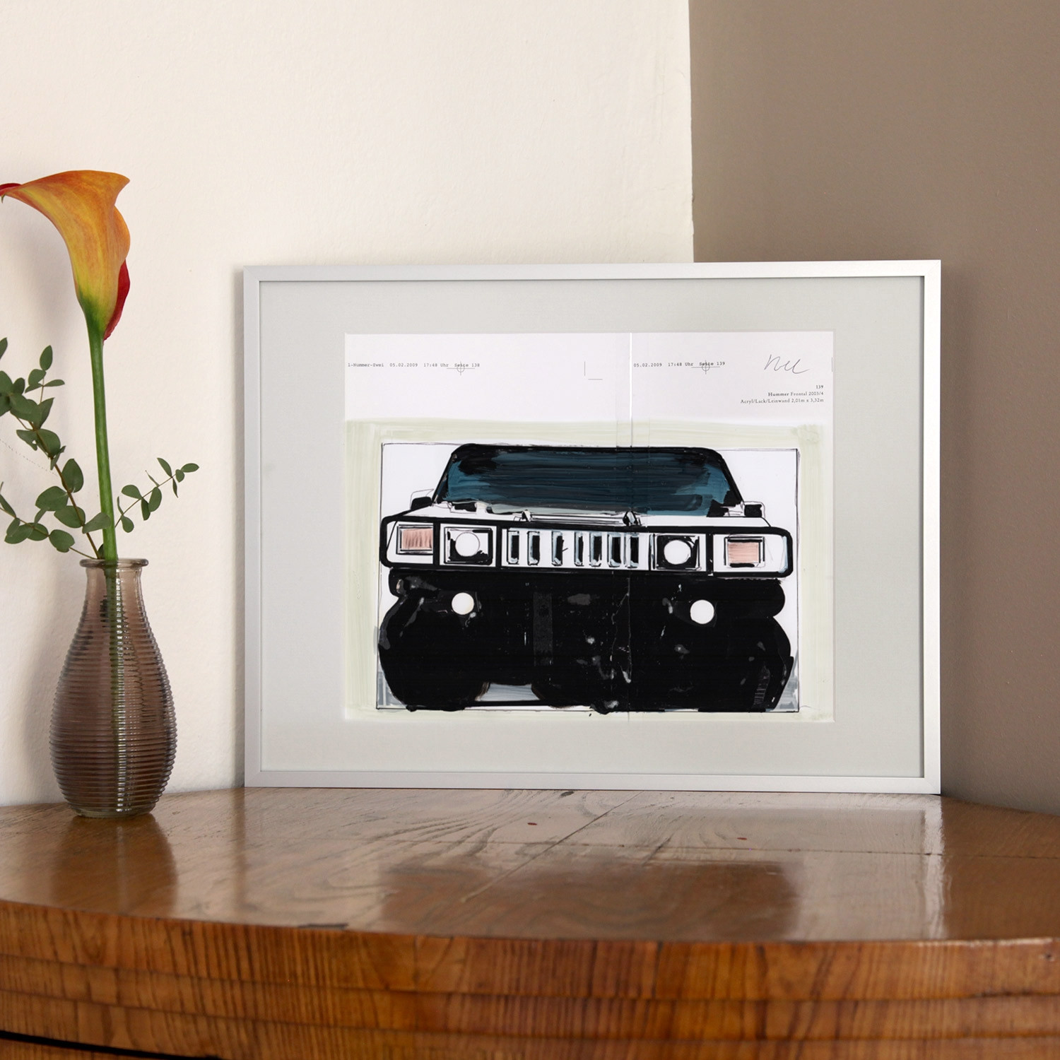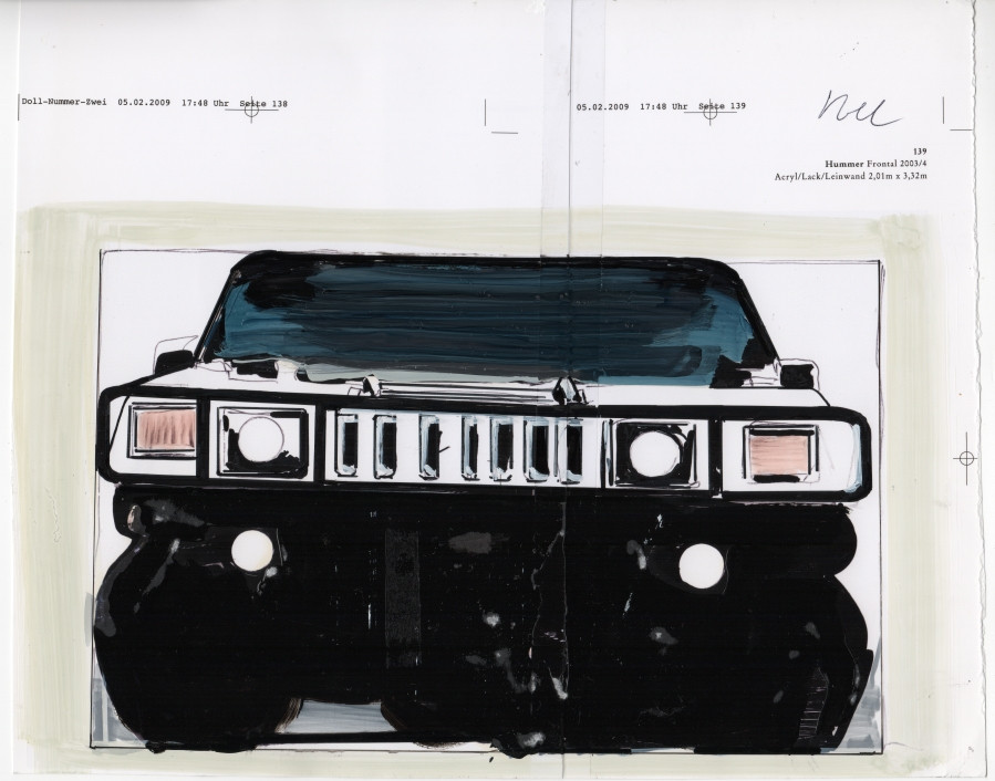 Tatjana Doll Nr. 139, Hummer Frontal , 2006/2021 Material Gescannte Handzeichnung, ausgedruckt als Katalogproof, weitergezeichnet, bemalt und handbearbeitet Edition Size 1 Measurement ca. 31,2 x 41 cm handsigniert inkl. Katalog: Tatjana Doll, DOLL, 2005, anlässl. der Ausstellung "Bier Für Öl + Ein Blinder Passagier" im Kunstverein Bremerhaven, 2005 Details about the frame Inkl. HALBE-Rahmen in Silber + Passepartout, Größe ca. 32 x 42 cm The new and affordable way to buy contemporary art Strictly limited and signed art editions Limited stock From emerging talents to today’s most sought-after artists Easy and free sign-up to shop our weekly deals SIGN UP NOW Already have an account? Über die Werke Der rote Ferrari ist auch eins der Motive in den Unikaten, die auf der Grundlage des Katalogs „DOLL“ aus dem Jahr 2005 entstanden sind. Darin sehen wir Tatjana Dolls Malereien in Form von Collagen in den städtischen Raum montiert. Die linearen Edding-Zeichnungen stammen aus dem Jahr darauf, zunächst waren sie gedacht als Wiederholung des Gedruckten in Schwarz-Weiß, wurden dann gescannt und wiederum als Print aufs Papier gebracht. Die Künstlerin hat sie später manuell durch malerisch-farbige Flächen ergänzt. Zudem holte sie den urbanen Raum dieses Mal in die Zeichnung und die Malerei hinein. „So, als wäre er wie die Malereien, die darin platziert sind, genauso ausgedacht“, erklärt Doll. Wer sich auf ihre Arbeiten einlässt, sollte sich also wappnen für das Wechselspiel zwischen Kunst und Wirklichkeit. „Die Piktogrammschilder ‚Caution‘ habe ich gemalt, um vor meinen eigenen Bildern zu warnen“, sagt sie auch. Die Warnung lässt sich aber ebenso als Aufforderung verstehen, die eigene Vorstellungskraft mindestens so wichtig zu nehmen wie die vorformulierten visuellen Erzählungen, von denen wir umgeben sind. Tatjana Dolls mutiges Werk macht vor, wie das geht. Über die Künstlerin Der Malerei traut Tatjana Doll einiges zu. „Wenn ich einen Ferrari male, dann sollte es so sein, als öffnete ich eine große Lackdose und er würde zu einem Auto schon in dem Moment, in dem ich den Lack auf die Leinwand gieße, nicht durch Ingenieurskenntnisse, sondern einfach durch das Material und die Farbe“, sagt die Künstlerin. Die Grenze zwischen Abbild und Wirklichkeit zieht sie nicht entlang der materiellen Realität. Oft übersteigt die Größe der Alltagsgegenstände in ihrer Kunst die ‚wahren‘ Maße bei Weitem. Genauso wie die Symbolkraft eines Ferraris seine Funktion als Rennwagen und Automobil bei Weitem übertrifft. „Ich wollte malen, was da ist“, erklärt Doll und holt auf diese Weise eine Welt in die Kunst, die uns alle umgibt. Bei Doll ist der Schaffensprozess als ein Akt der subjektiven Aneignung zu verstehen, der Gegenstand an sich tritt hinter das Bild zurück. Möglich also, dass wir in dem LKW-Rücklicht plötzlich nur noch einen gelben Lackfleck sehen – und fernab vorgegebener Denkmuster auf produktivste Art und Weise auf uns selbst zurückgeworfen sind. Latest Exhibitions (Selection) Tatjana Doll stellt als Rompreisträgerin der Deutschen Akademie Rom Villa Massimo gemeinsam mit den anderen ausgezeichneten Künstler*innen aktuell auf Schloss Neuhardenberg aus (bis 31.10.2021). „Was heißt Untergrund?“ ist der Titel ihrer Soloschau im KINDL ‒ Zentrum für zeitgenössische Kunst in Berlin (bis 27.2.2022). 2018 wurde Doll zudem mit dem Konrad-von-Soest-Preis des Landschaftsverbands Westfalen-Lippe ausgezeichnet, ihre Werke zeigte man seinerzeit ebenfalls im Rahmen einer Soloausstellung. Links of Interest (Selection) Webseite von Tatjana Doll 2021 erhielt Tatjana Doll den Fred-Thieler-Preis für Malerei, verliehen von der Berlinischen Galerie „art in berlin“-Interview mit Tatjana Doll (2015
