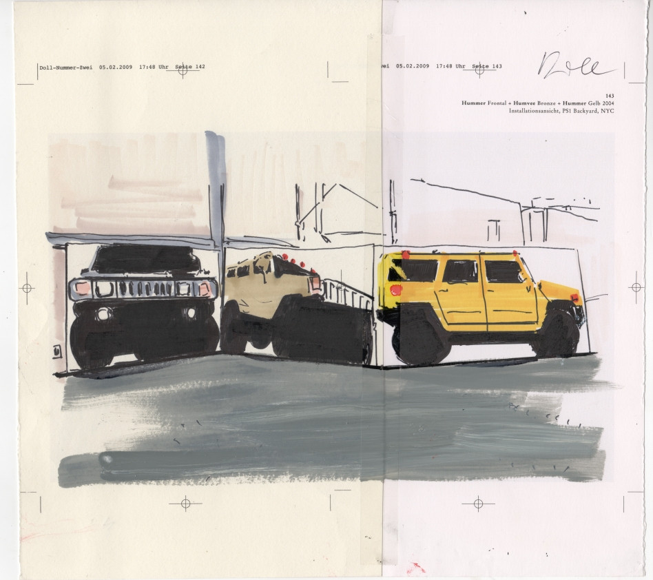 Tatjana Doll Nr. 143, Hummer Frontal + Humvee Bronze + Hummer Gelb, 2006/2021 Material Gescannte Handzeichnung, ausgedruckt als Katalogproof, weitergezeichnet, bemalt und handbearbeitet Edition Size 1 Measurement ca. 31,2 x 41 cm handsigniert inkl. Katalog: Tatjana Doll, DOLL, 2005, anlässl. der Ausstellung "Bier Für Öl + Ein Blinder Passagier" im Kunstverein Bremerhaven, 2005 Details about the frame Inkl. HALBE-Rahmen in Silber + Passepartout, Größe ca. 32 x 42 cm The new and affordable way to buy contemporary art Strictly limited and signed art editions Limited stock From emerging talents to today’s most sought-after artists Easy and free sign-up to shop our weekly deals SIGN UP NOW Already have an account? Über die Werke Der rote Ferrari ist auch eins der Motive in den Unikaten, die auf der Grundlage des Katalogs „DOLL“ aus dem Jahr 2005 entstanden sind. Darin sehen wir Tatjana Dolls Malereien in Form von Collagen in den städtischen Raum montiert. Die linearen Edding-Zeichnungen stammen aus dem Jahr darauf, zunächst waren sie gedacht als Wiederholung des Gedruckten in Schwarz-Weiß, wurden dann gescannt und wiederum als Print aufs Papier gebracht. Die Künstlerin hat sie später manuell durch malerisch-farbige Flächen ergänzt. Zudem holte sie den urbanen Raum dieses Mal in die Zeichnung und die Malerei hinein. „So, als wäre er wie die Malereien, die darin platziert sind, genauso ausgedacht“, erklärt Doll. Wer sich auf ihre Arbeiten einlässt, sollte sich also wappnen für das Wechselspiel zwischen Kunst und Wirklichkeit. „Die Piktogrammschilder ‚Caution‘ habe ich gemalt, um vor meinen eigenen Bildern zu warnen“, sagt sie auch. Die Warnung lässt sich aber ebenso als Aufforderung verstehen, die eigene Vorstellungskraft mindestens so wichtig zu nehmen wie die vorformulierten visuellen Erzählungen, von denen wir umgeben sind. Tatjana Dolls mutiges Werk macht vor, wie das geht. Über die Künstlerin Der Malerei traut Tatjana Doll einiges zu. „Wenn ich einen Ferrari male, dann sollte es so sein, als öffnete ich eine große Lackdose und er würde zu einem Auto schon in dem Moment, in dem ich den Lack auf die Leinwand gieße, nicht durch Ingenieurskenntnisse, sondern einfach durch das Material und die Farbe“, sagt die Künstlerin. Die Grenze zwischen Abbild und Wirklichkeit zieht sie nicht entlang der materiellen Realität. Oft übersteigt die Größe der Alltagsgegenstände in ihrer Kunst die ‚wahren‘ Maße bei Weitem. Genauso wie die Symbolkraft eines Ferraris seine Funktion als Rennwagen und Automobil bei Weitem übertrifft. „Ich wollte malen, was da ist“, erklärt Doll und holt auf diese Weise eine Welt in die Kunst, die uns alle umgibt. Bei Doll ist der Schaffensprozess als ein Akt der subjektiven Aneignung zu verstehen, der Gegenstand an sich tritt hinter das Bild zurück. Möglich also, dass wir in dem LKW-Rücklicht plötzlich nur noch einen gelben Lackfleck sehen – und fernab vorgegebener Denkmuster auf produktivste Art und Weise auf uns selbst zurückgeworfen sind. Latest Exhibitions (Selection) Tatjana Doll stellt als Rompreisträgerin der Deutschen Akademie Rom Villa Massimo gemeinsam mit den anderen ausgezeichneten Künstler*innen aktuell auf Schloss Neuhardenberg aus (bis 31.10.2021). „Was heißt Untergrund?“ ist der Titel ihrer Soloschau im KINDL ‒ Zentrum für zeitgenössische Kunst in Berlin (bis 27.2.2022). 2018 wurde Doll zudem mit dem Konrad-von-Soest-Preis des Landschaftsverbands Westfalen-Lippe ausgezeichnet, ihre Werke zeigte man seinerzeit ebenfalls im Rahmen einer Soloausstellung. Links of Interest (Selection) Webseite von Tatjana Doll 2021 erhielt Tatjana Doll den Fred-Thieler-Preis für Malerei, verliehen von der Berlinischen Galerie „art in berlin“-Interview mit Tatjana Doll (2015