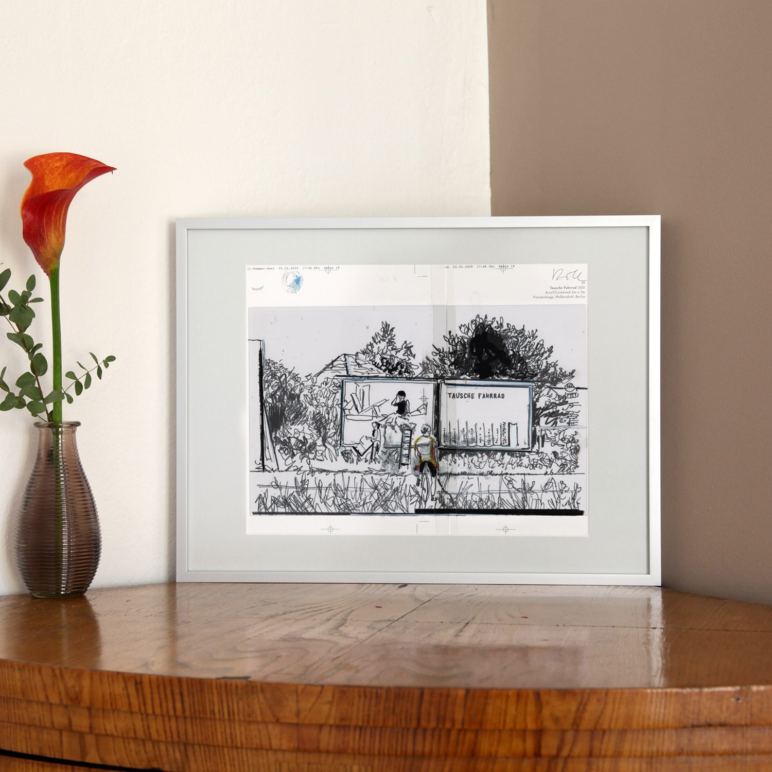 Tatjana Doll Nr. 19, Tausche Fahrrad, 2006/2021 Material Gescannte Handzeichnung, ausgedruckt als Katalogproof, weitergezeichnet, bemalt und handbearbeitet Edition Size 1 Measurement ca. 31,2 x 41 cm handsigniert inkl. Katalog: Tatjana Doll, DOLL, 2005, anlässl. der Ausstellung "Bier Für Öl + Ein Blinder Passagier" im Kunstverein Bremerhaven, 2005 Details about the frame Inkl. HALBE-Rahmen in Silber + Passepartout, Größe ca. 32 x 42 cm The new and affordable way to buy contemporary art Strictly limited and signed art editions Limited stock From emerging talents to today’s most sought-after artists Easy and free sign-up to shop our weekly deals SIGN UP NOW Already have an account? Über die Werke Der rote Ferrari ist auch eins der Motive in den Unikaten, die auf der Grundlage des Katalogs „DOLL“ aus dem Jahr 2005 entstanden sind. Darin sehen wir Tatjana Dolls Malereien in Form von Collagen in den städtischen Raum montiert. Die linearen Edding-Zeichnungen stammen aus dem Jahr darauf, zunächst waren sie gedacht als Wiederholung des Gedruckten in Schwarz-Weiß, wurden dann gescannt und wiederum als Print aufs Papier gebracht. Die Künstlerin hat sie später manuell durch malerisch-farbige Flächen ergänzt. Zudem holte sie den urbanen Raum dieses Mal in die Zeichnung und die Malerei hinein. „So, als wäre er wie die Malereien, die darin platziert sind, genauso ausgedacht“, erklärt Doll. Wer sich auf ihre Arbeiten einlässt, sollte sich also wappnen für das Wechselspiel zwischen Kunst und Wirklichkeit. „Die Piktogrammschilder ‚Caution‘ habe ich gemalt, um vor meinen eigenen Bildern zu warnen“, sagt sie auch. Die Warnung lässt sich aber ebenso als Aufforderung verstehen, die eigene Vorstellungskraft mindestens so wichtig zu nehmen wie die vorformulierten visuellen Erzählungen, von denen wir umgeben sind. Tatjana Dolls mutiges Werk macht vor, wie das geht. Über die Künstlerin Der Malerei traut Tatjana Doll einiges zu. „Wenn ich einen Ferrari male, dann sollte es so sein, als öffnete ich eine große Lackdose und er würde zu einem Auto schon in dem Moment, in dem ich den Lack auf die Leinwand gieße, nicht durch Ingenieurskenntnisse, sondern einfach durch das Material und die Farbe“, sagt die Künstlerin. Die Grenze zwischen Abbild und Wirklichkeit zieht sie nicht entlang der materiellen Realität. Oft übersteigt die Größe der Alltagsgegenstände in ihrer Kunst die ‚wahren‘ Maße bei Weitem. Genauso wie die Symbolkraft eines Ferraris seine Funktion als Rennwagen und Automobil bei Weitem übertrifft. „Ich wollte malen, was da ist“, erklärt Doll und holt auf diese Weise eine Welt in die Kunst, die uns alle umgibt. Bei Doll ist der Schaffensprozess als ein Akt der subjektiven Aneignung zu verstehen, der Gegenstand an sich tritt hinter das Bild zurück. Möglich also, dass wir in dem LKW-Rücklicht plötzlich nur noch einen gelben Lackfleck sehen – und fernab vorgegebener Denkmuster auf produktivste Art und Weise auf uns selbst zurückgeworfen sind. Latest Exhibitions (Selection) Tatjana Doll stellt als Rompreisträgerin der Deutschen Akademie Rom Villa Massimo gemeinsam mit den anderen ausgezeichneten Künstler*innen aktuell auf Schloss Neuhardenberg aus (bis 31.10.2021). „Was heißt Untergrund?“ ist der Titel ihrer Soloschau im KINDL ‒ Zentrum für zeitgenössische Kunst in Berlin (bis 27.2.2022). 2018 wurde Doll zudem mit dem Konrad-von-Soest-Preis des Landschaftsverbands Westfalen-Lippe ausgezeichnet, ihre Werke zeigte man seinerzeit ebenfalls im Rahmen einer Soloausstellung. Links of Interest (Selection) Webseite von Tatjana Doll 2021 erhielt Tatjana Doll den Fred-Thieler-Preis für Malerei, verliehen von der Berlinischen Galerie „art in berlin“-Interview mit Tatjana Doll (2015