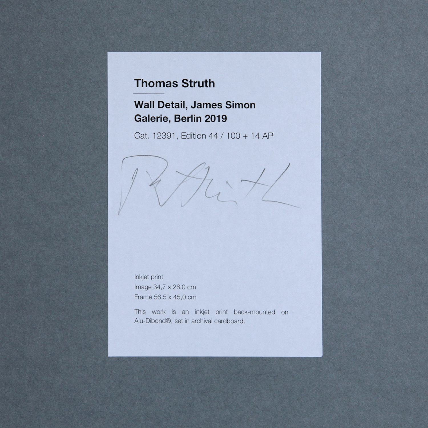 Thomas Struth Wall Detail, James Simon Galerie, Berlin 2019, 2019 Material Inkjet Print Edition Size 100 Measurement Motivmaß: 39,7 x 31 cm, Außenmaß: 56,5 x 45 cm auf Aludibond montiert, in Archivkarton gefasst Auflage 100 + 14 AP Signiert auf Label Details about the frame Handgefertigter grau gebeizter und gewachster Ahorn-Holzrahmen, inkl. Passepartout und Museumsglas, Außenmaße ca. 56 x 47 cm. Inkl. rückseitiger Aufhängung, staubdicht verschlossen. The new and affordable way to buy contemporary art Strictly limited and signed art editions Limited stock From emerging talents to today’s most sought-after artists Easy and free sign-up to shop our weekly deals SIGN UP NOW Already have an account? Über die Edition Ein kleines „Wall Detail“ aus der 2019 in Berlin eröffneten James-Simon-Galerie – benannt nach dem wichtigsten Mäzen der Staatlichen Museen zu Berlin – zeigt Thomas Struth in dieser Foto-Edition. Zwischen Neuem Museum und Kupfergraben gelegen, ist die Galerie das zentrale Empfangsgebäude für die Museumsinsel. Struth hat den Neubau von Stararchitekt David Chipperfield in vielen verschiedenen Facetten porträtiert: sowohl in seinem städtebaulichen Kontext als auch in Nahaufnahmen. Die Fensterfronten und das Kolonnadenmotiv sind charakteristisch für das imposante Gebäude mit seinen Durchblicken zum Wasser und auf den Hof. Die Kassettenfenster, die Struth hier in den Fokus genommen hat, sind jedoch blind. Eine Schicht aus hellem, hauchdünnem Marmor aus Thassos im Norden Griechenlands schirmt das Innere der Galerie von der Außenwelt und dem mächtig aufragenden Pergamonmuseum ab. Der Fotograf nimmt uns mit in einen intimen Winkel des Foyers – und erzählt gleichzeitig von der Qualität und den aufwendigen Details der Bauten Chipperfields. Der spannende Kontrast zwischen hellem Fenster, schwarzen Streben und grau-glattem Sichtbeton mündet, gesehen durch seine Linse, geradezu in der Abstraktion. Über den Künstler Straßenfluchten, Familienporträts, Technik-, Dschungel-, Museumsbilder – Thomas Struths fotografische Sicht ist eine sehr persönliche Dokumentation der Welt von heute. Seine meist großformatigen Farbfotografien wirken auf den ersten Blick vertraut, auf den zweiten jedoch fremd. Nach längerer Betrachtung ermöglichen seine Bilderserien und Einzelwerke immer einen Zugewinn an Wissen. Das präzise Sehen, das den Dingen auf den Grund geht, zeichnet seine Fotografie aus. Es macht ihn zu einem der bedeutendsten Fotografen unserer Zeit. Struth, geboren 1954 in Geldern am Niederrhein, ist neben Andreas Gursky, Candida Höfer und Thomas Ruff einer der Protagonist*innen der berühmten Düsseldorfer Fotoschule. Zunächst studierte er Malerei bei Gerhard Richter, bevor er 1976 in die neu gegründete Klasse von Bernd Becher wechselte – und sich ganz der Fotografie zuwandte. In den 1990er Jahren hatte Struth eine Professur an der Staatlichen Hochschule für Gestaltung in Karlsruhe inne. Er lebt und arbeitet in Berlin. Weltweit befinden sich seine Arbeiten in bedeutenden öffentlichen Sammlungen. Allein in Deutschland ist die Liste lang: Hamburger Kunsthalle, Galerie für Zeitgenössische Kunst, Leipzig, Hamburger Bahnhof – Museum für Gegenwart, Berlin, Kunstmuseum Bonn, Museum Ludwig, Köln, Pinakothek der Moderne, München, und Museum Folkwang, Essen. Latest Exhibitions (Selection) Bereits 1978 erhielt Thomas Struth eine Einzelausstellung im MoMA PS1, der Künstler war damals Stipendiat der Kunstakademie Düsseldorf in New York. Einige dieser frühen Werke waren auch Teil seiner Soloschau im Metropolitan Museum of Art im Jahr 2003. Mit „Figure Ground“ zeigte das Haus der Kunst in München 2017 erstmals eine Auswahl seiner umfassenden Werkgruppen unter dem Aspekt des sozialen Interesses, das die Entwicklung des künstlerischen Werks von Struth prägt. 2019/20 präsentierte das Guggenheim Museum in Bilbao eine große Retrospektive des Künstlers. Links of Interest (Selection) [Websites des Künstlers](http://www.thomasstruth25.com; http://www.thomasstruth32.com) Thomas Struth bei Galerie Max Hetzler, Berlin Thomas Struth bei Galerie Marian Goodman, New York/Paris/London Video zur Ausstellung von Thomas Struth im Haus der Kunst, München (2017) Discover More Art Sandra Mann 091000-0005 VIP, 2000 Antje Engelmann Spange, 2008/2020 Martin Parr Glenbeigh Races, County Kerry, 1983 , 2021 Jasper Sebastian Stürup Ohne Titel, 2021