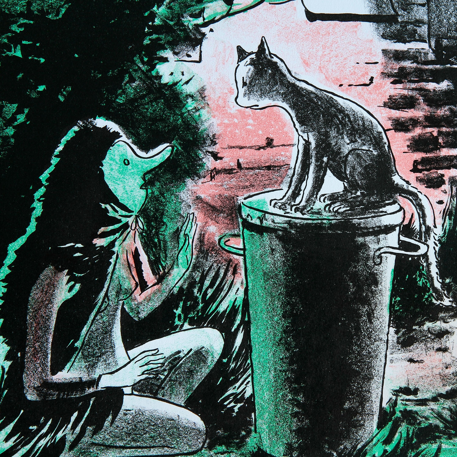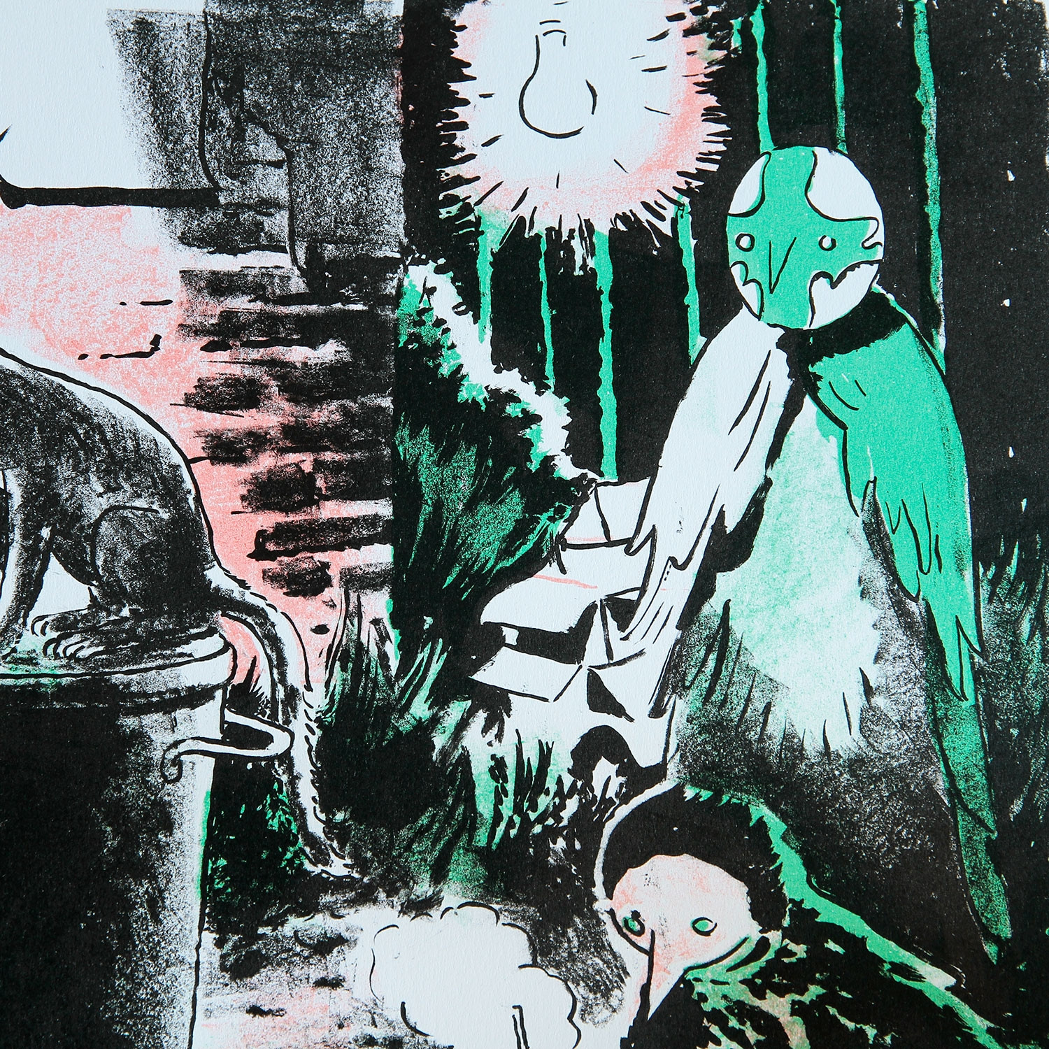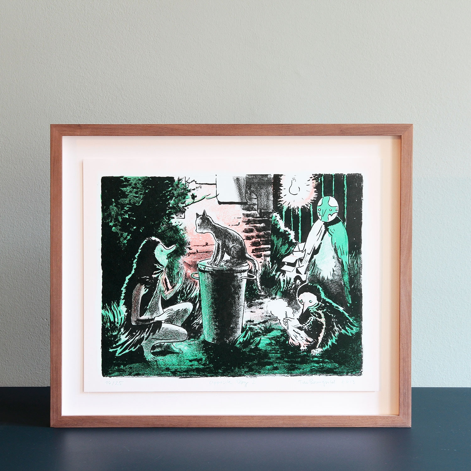 Traum oder Albtraum? In Tilo Baumgärtels Hinterhofkulisse von „Opposite Day“ (2013) ist die Katze auf der Mülltonne das einzig „wahr“ wirkende Wesen. Sie ist umgeben von Mischwesen, die in ihrer Gestalt Elemente von Mensch und Vogel verbinden. Die Katze, so scheint es, hört einem dieser „Vogelmenschen“ aufmerksam zu. Worüber sie sprechen, welche Mission sie verfolgen, bleibt der Fantasie des Betrachters überlassen.