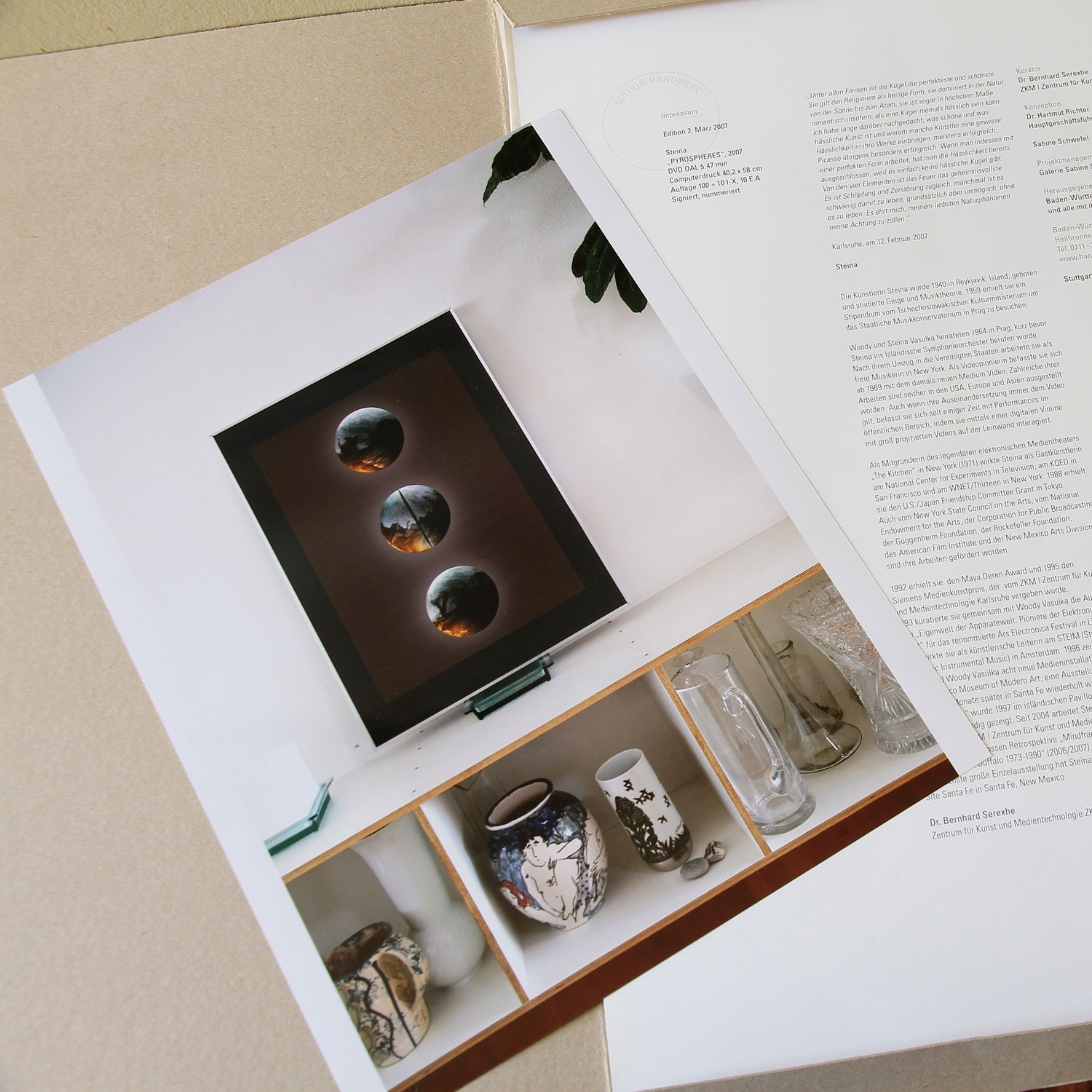 Steina Vasulka Pyrospheres, 2007 Material Pigment-Print, inkl. DVD PAL 5:47 min. Edition Size 100 Measurement 58,5 x 40,5 cm Auflage 100 verso signiert und nummeriert Beide Arbeiten (Print und Video-Mitschnitt auf DVD) hat Steina Vasulka 2006 bei ihrem Gastaufenthalt im ZKM in Karlsruhe geschaffen: Aufnahmen von Feuer auf einer rotierenden Kugel. Ein Mitschnitt von 5:47 min, der in Dauerschleife abgespielt werden kann, ist als DVD-Disc Teil ihrer Arbeit. Die speziell angefertigte Mappe wird mitgeliefert. Details about the frame Metallrahmen Nielsen Walnuss, inkl. Passepartout dorée museo, Außenmaße 50 x 70 cm, inkl. 60% invisible UV Glas, staubdicht verschlossen. The new and affordable way to buy contemporary art Strictly limited and signed art editions Limited stock From emerging talents to today’s most sought-after artists Easy and free sign-up to shop our weekly deals SIGN UP NOW Already have an account? Über die Edition Es gilt als Wiege der Videokunst: der avantgardistische Kunstspace The Kitchen, ein 1971 von Steina und Woody Vasulka mitgegründetes alternatives Zentrum für Videokunst, Musik und Performance in New York – und es existiert bis heute. Eine ähnliche Kontinuität haben Steina Vasulkas Experimente mit der Kamera und elektronischen Bildern sowie ihr Interesse an Soundeffekten. Sie spielte mit Bildmanipulationen und brach mit filmischen Konventionen, lange vor Software-Erfindungen wie den Face Filter Apps. „Pyroglyphs“ (1994) und „Pyroshpere“ (2005), beides Videoarbeiten mit Sound, realisierte sie gemeinsam mit dem Schmied und Künstler Tom Joyce. Es sind spektakuläre Meditationen über das Element Feuer, aus dem sie hypnotische Landschaften entstehen lässt. Steina Vasulka ist fasziniert von der Kraft des Feuers, Materialien in gänzlich neue Formen transformieren zu können. Die Edition „Pyrospheres“ entwickelte sie in ihrer Zeit als Artist in Residence im ZKM Karlsruhe. Es ist ein Computerdruck in hoher Qualität, erschienen als signierte und nummerierte Auflage, der eine DVD PAL beiliegt. Über die Künstlerin Bevor Steina Vasulka (geb. 1940 in Reykjavík) gemeinsam mit ihrem Mann Woody Vasulka die Medienkunst revolutionierte, war sie – studiert in klassischer Violine – Mitglied im Isländischen Symphonieorchester. In ihrer Performance-Arbeit „Violine Power“ verwebte sie 1979 Audio- mit Videosignalen – und erzielte erstaunliche Effekte. Was Steina und Woody Vasulka in ihren frühen Arbeiten einte, war ihr Interesse an dem Medium Video. Beide hatten großen Anteil daran, dass sich Videokunst als eigenes künstlerisches Genre etablieren konnte, als sich Ende der 1970er Jahre das Fernsehen als Massenmedium ausbreitete. Sie experimentierten mit der elektronischen Technologie, um das Verhältnis von Bild und Ton neu zu definieren, und nutzten Verfahren der Farbmanipulation und Überblendung oder elektronische Bildbeeinflussungen durch Synthesizer mit dem Ziel, die filmische Dramaturgie und die narrativen Möglichkeiten zu erweitern. Steina Vasulka erhielt zahlreiche Preise und Stipendien, bespielte den Isländischen Pavillon auf der Venedig-Biennale (1997) und ist heute in zahlreichen namhaften Sammlungen vertreten, darunter dem MoMA in New York und dem ZKM Karlsruhe. Links of Interest (Selection) Webseite der Künstlerin Webseite von The Kitchen Künstlerinnenseite auf der LIMA-Homepage Einen guten Eindruck von der Arbeit gibt es auf folgender Seite; in das Suchfeld „Steina Seven Spheres“ eingeben [Steina and Woody Vasulka Fonds](Werke von Steina und Woody Vasulka auf UbuWeb) [Video-Interview mit Steina und Woody Vasulka](https://www.youtube.com/watch?v=Ylow_1ytoiE Videoausschnitt aus "Pyroglyphs" Archiv der Vasulkas Discover More Art Gabriel Orozco Boulder Whale, 2012 Imi Knoebel o.T. (2), 1995 Imi Knoebel o.T. (3), 1995 Wolfgang Tillmans It´s Only Love – Give It Away, 2018