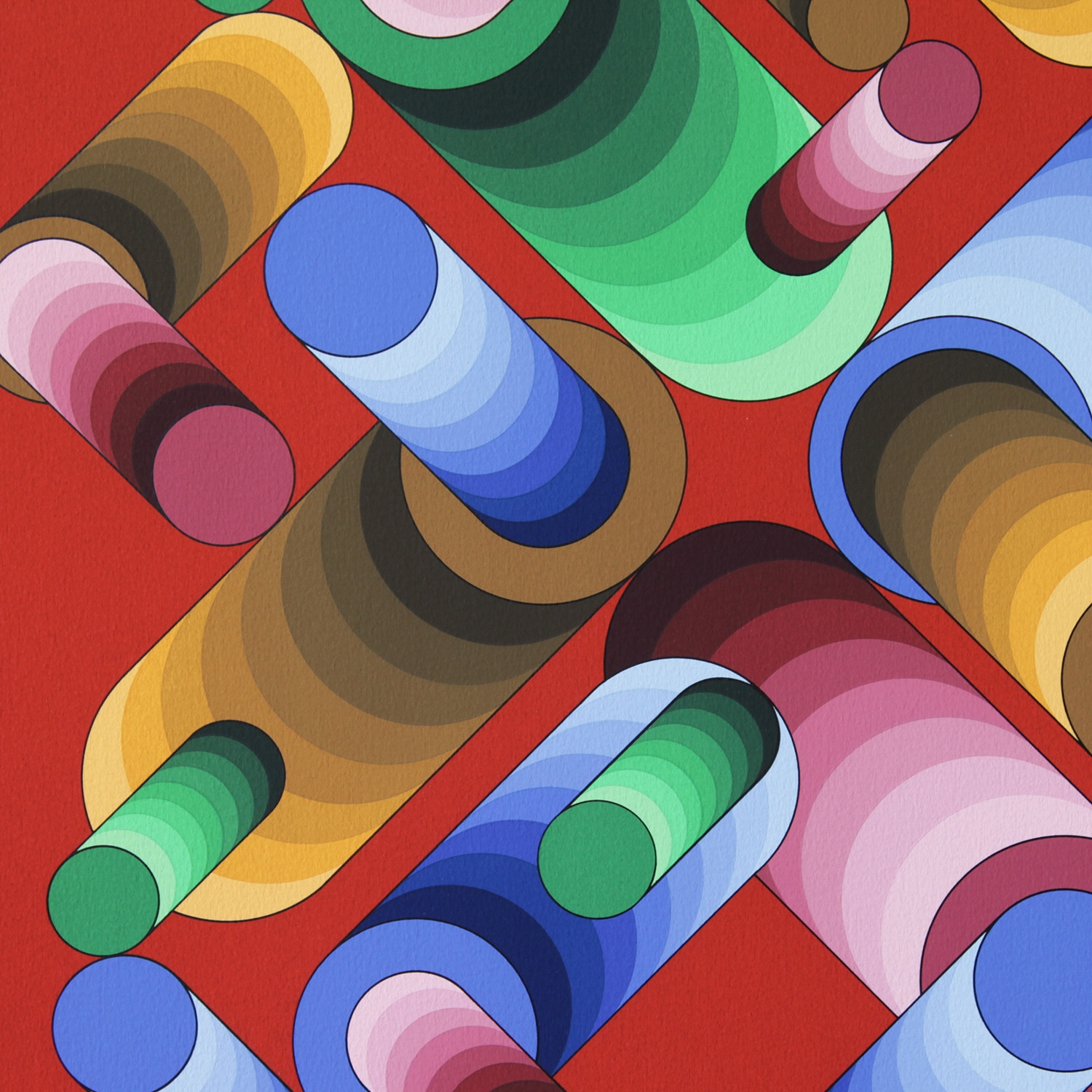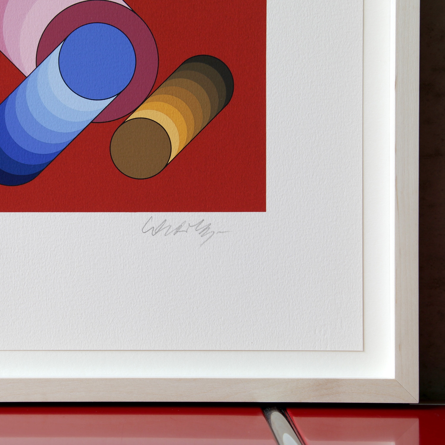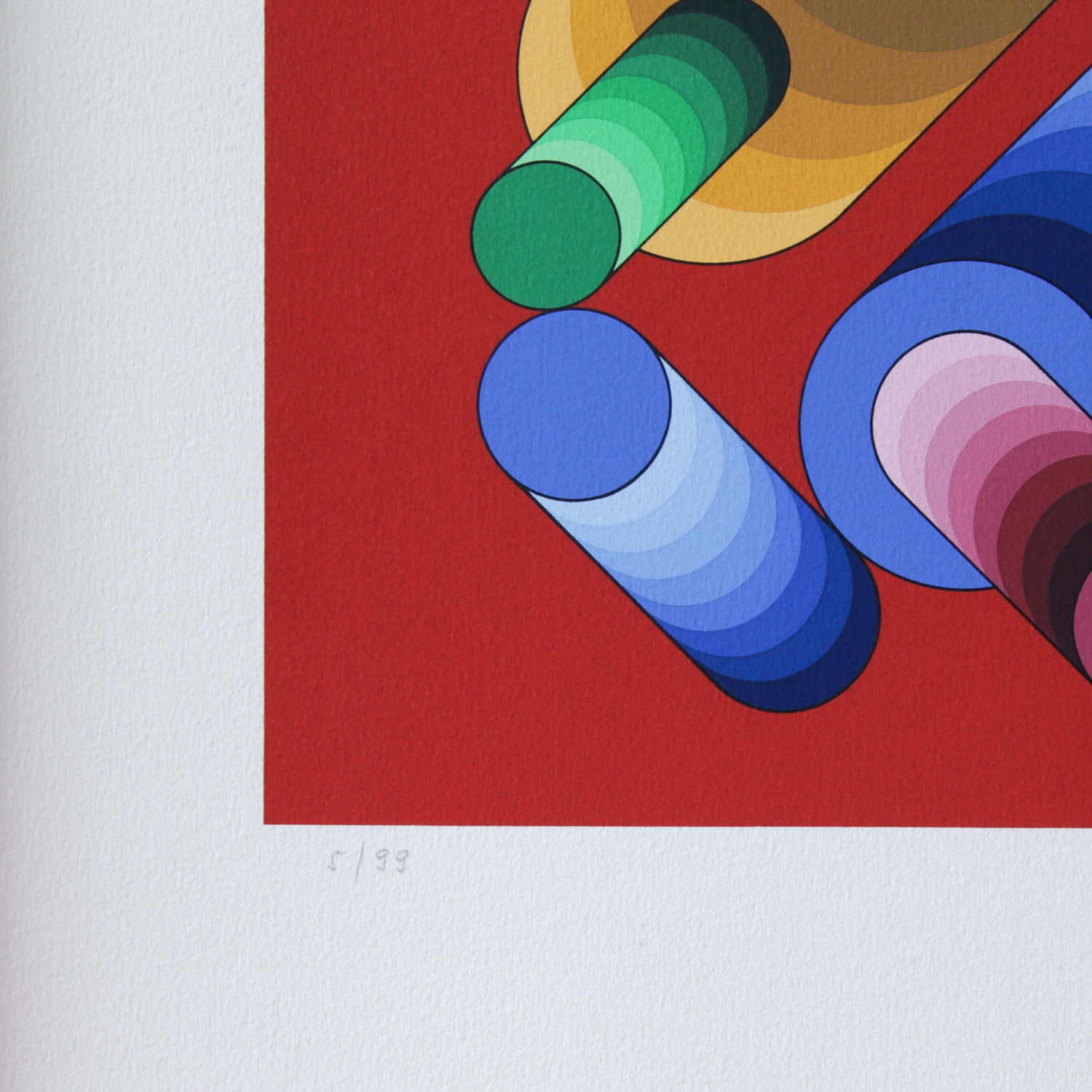 Kreis und Quadrat, viel mehr brauchte Victor Vasarely nicht, um ein beeindruckendes und variantenreiches Werk zu schaffen, mit dem ihm Mitte der 1950er Jahre in Paris der Durchbruch gelang. Seine aus geometrischen Mustern aufgebauten Strukturen traten einen weltweiten Siegeszug an ‒ nicht zuletzt, weil der Künstler es schaffte, neue Ideen von Raum, Materie und Energie zu vermitteln, indem er auf unsere Sinnesempfindungen zielte. Vasarely betrachtete Form und Farbe als Einheit, sprach von einer „unité plastique“: „In ihrer leuchtenden Einfachheit ist sie die Essenz der Dinge, aber zugleich [ist sie] auch von einer extremen Vielschichtigkeit, wie chemische Elemente“, wird der Künstler zitiert. Durch die Wiederholung einzelner Formen – wie des Kreises in „Oslop“, seiner handsignierten Farblithografie aus dem Jahr 1989 –, deren Drehung oder Spiegelung erzielte er etwas scheinbar Paradoxes: eine ruhige Gleichmäßigkeit, die zugleich eine vibrierende Bewegung in sich birgt, der wir uns nicht entziehen können, mehr noch: die uns teilhaben lässt an diesem faszinierenden Werk.