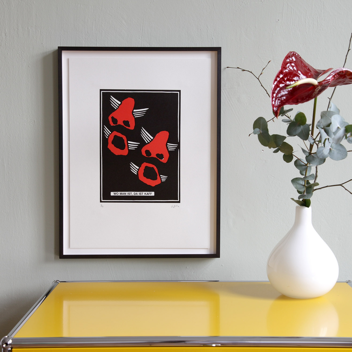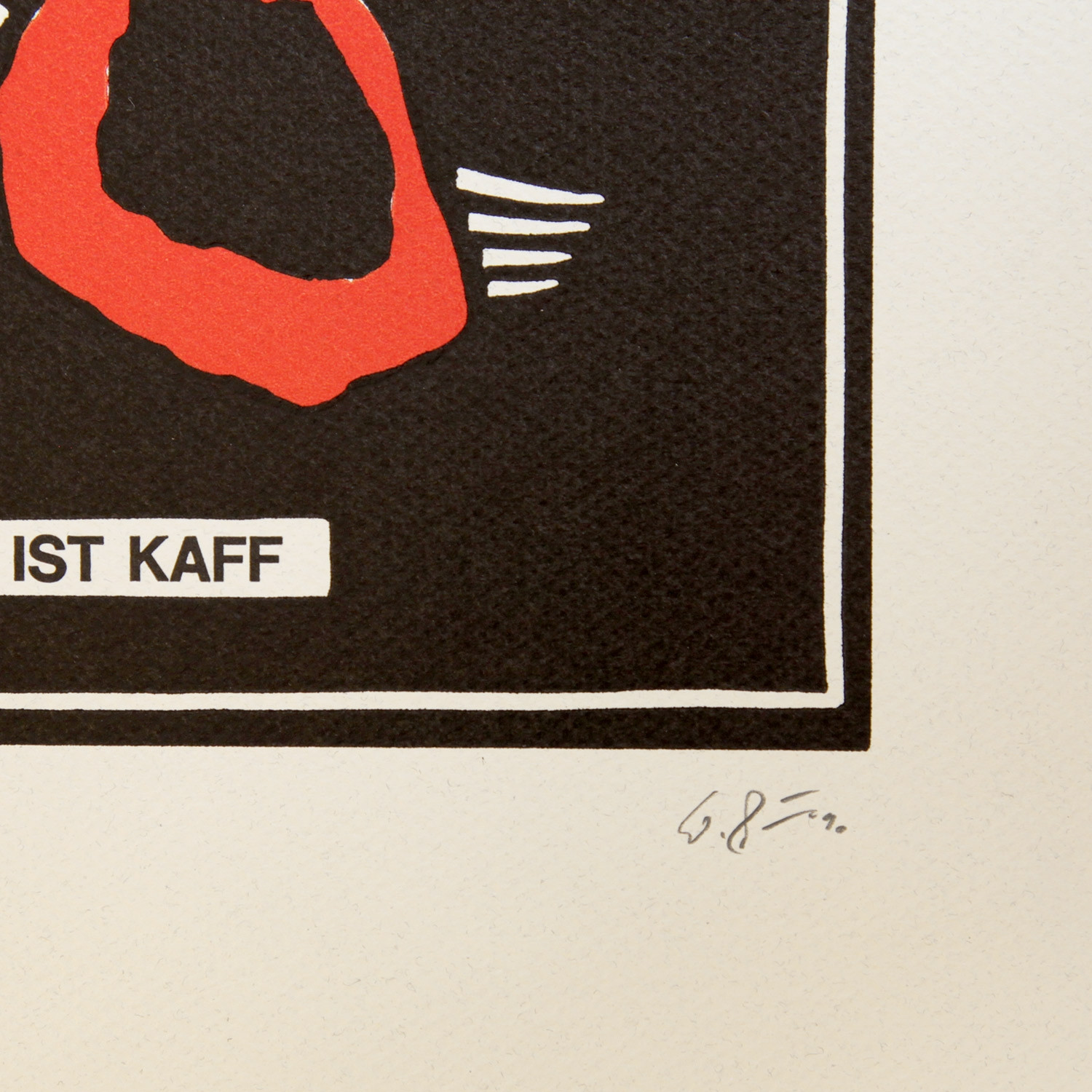 Werner Büttner WO MAN IST, DA IST KAFF, 1990 Material zweifarbiger Linolschnitt auf Yearling-Karton 250g Production Method Auf der Vorderseite signiert und nummeriert Edition Size 22 Measurement 50 x 37 cm Details about the frame Handgefertigter schwarz gebeizter und gewachster Ahornrahmen, mit 8mm Distanzleiste, inkl. Museumsglas, Außenmaße ca. 54,1 x 42,5 cm, staubdicht verschlossen. Mit rückseitiger Aufhängung. The new and affordable way to buy contemporary art Strictly limited and signed art editions Limited stock From emerging talents to today’s most sought-after artists Easy and free sign-up to shop our weekly deals SIGN UP NOW Already have an account? Über die Edition Als „Blattern“, so der Titel einer Reihe von Linolschnitten Werner Büttners, im Jahr 1990 erschien, ging eine aufregende, rebellische, kräftezehrende Zeit für den Maler zu Ende. Gemeinsam mit Albert Oehlen, aber auch mit Kollegen wie Martin Kippenberger und Georg Herold hatte er die Kunstwelt Ende der 70er und während der 80er Jahre gehörig aufgemischt. „Wo man ist, da ist Kaff“, „Hommage à eigene Fischsuppe“, „Dein Hirn in deinen Armen, so“ – aus den Kommentaren zu den visuell reduzierten, wirkungsmächtigen Motiven spricht die Ironie, mit der Büttner und seine „Bande“ der Welt und der Selbstgewissheit darin begegneten. Oft sarkastisch gesteigert bis zum Tabubruch. Die Textebene begleitet viele von Büttners Werken. Er bevorzuge „das Aphoristische, die Rätselrede, das kleine, poetische Dickicht“, hat der Künstler über sich selbst gesagt. Der Interpretationsspielraum ist also weit. Und es besteht kein Zweifel, dass man sich von Büttners Schöpfungen auch heute noch in Gedankenspiele verwickeln lassen kann. Über den Künstler „Wir wollten ja malen, weil malen war damals verboten.“ So erinnerte sich Werner Büttner in einem Gespräch mit dem Galeristen Bruno Brunnet vor Kurzem an seine künstlerischen Anfänge. Als „abgelutschtes bürgerliches Medium“ sei die Malerei Ende der 70er Jahre verschrien gewesen. Das allein war also schon ein rebellischer Akt. Aufmerksamkeit bekamen der 1954 in Jena geborene und vor dem Mauerbau nach Westdeutschland umgesiedelte Büttner und sein enger Weggefährte Albert Oehlen dennoch sehr schnell, zunächst mit selbst organisierten Ausstellungen – gemeinsam mit Martin Kippenberger – in Berlin, Hamburg und Düsseldorf. Letztgenannte Schau fand im Atelier von Jörg Immendorff statt – bei einem, der malte, wie sie. Der Galerist Max Hetzler unterstützte Büttner früh. Die Ausstellungen „Zeitgeist“ 1982 im Berliner Martin-Gropius-Bau und „Wahrheit ist Arbeit“ 1984 im Essener Museum Folkwang machten ihn national bekannt und auch für den Kunstmarkt interessant. Büttner ist seit 1989 Professor an der Hamburger Hochschule für bildende Künste. Seine Werke sind in zahlreichen Sammlungen wie der Hamburger Kunsthalle, dem ZKM Karlsruhe, dem Frankfurter Städel Museum und der Hamburger Sammlung Falckenberg vertreten. Latest Exhibitions (Selection) Die Berliner Galerie CFA zeigte im Jahr 2020 eine Retrospektive von Werner Büttners künstlerischem Schaffen. In der Schau „Wahrheit ist Arbeit“ 1984 im Essener Museum Folkwang stellte er zusammen mit Albert Oehlen und Martin Kippenberger aus. Der Katalog zu dieser legendären Präsentation befindet sich auch in der Sammlung des New Yorker MoMA. Ebenfalls 1984 war Büttner einer von 64 Künstler*innen in der Gruppenausstellung „Von hier aus – Zwei Monate neue deutsche Kunst in Düsseldorf“, die von der Stadt Düsseldorf und der Gesellschaft für aktuelle Kunst Düsseldorf unter der künstlerischen Leitung von Kasper König auf dem dortigen Messegelände veranstaltet wurde. Im Jahr 1981 eröffnete Büttners erste Einzelausstellung in der Stuttgarter Galerie Max Hetzler. 2003 richtete die Galerie eine weitere Ausstellung aus, die sich auf diese frühe Schau bezog. „Elend“, „Aktion Pisskrücke, Geheimdienst am Nächsten“ und „Finger für Deutschland“ waren die Titel der gemeinsam mit Oehlen und Kippenberger organisierten Ausstellungen 1979 und 1980 in Berlin, Hamburg und Düsseldorf. Links of Interest (Selection) Webseite von Werner Büttner an der Hochschule für bildende Künste in Hamburg Bruno Brunnet (Galerie CFA, Berlin) interviewt Werner Büttner (Januar 2020) Discover More Art Werner Büttner HOMMAGE À EIGENE FISCHSUPPE, 1990 Werner Büttner DEIN HIRN IN DEINEN ARMEN, SO, 1990